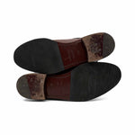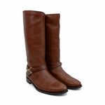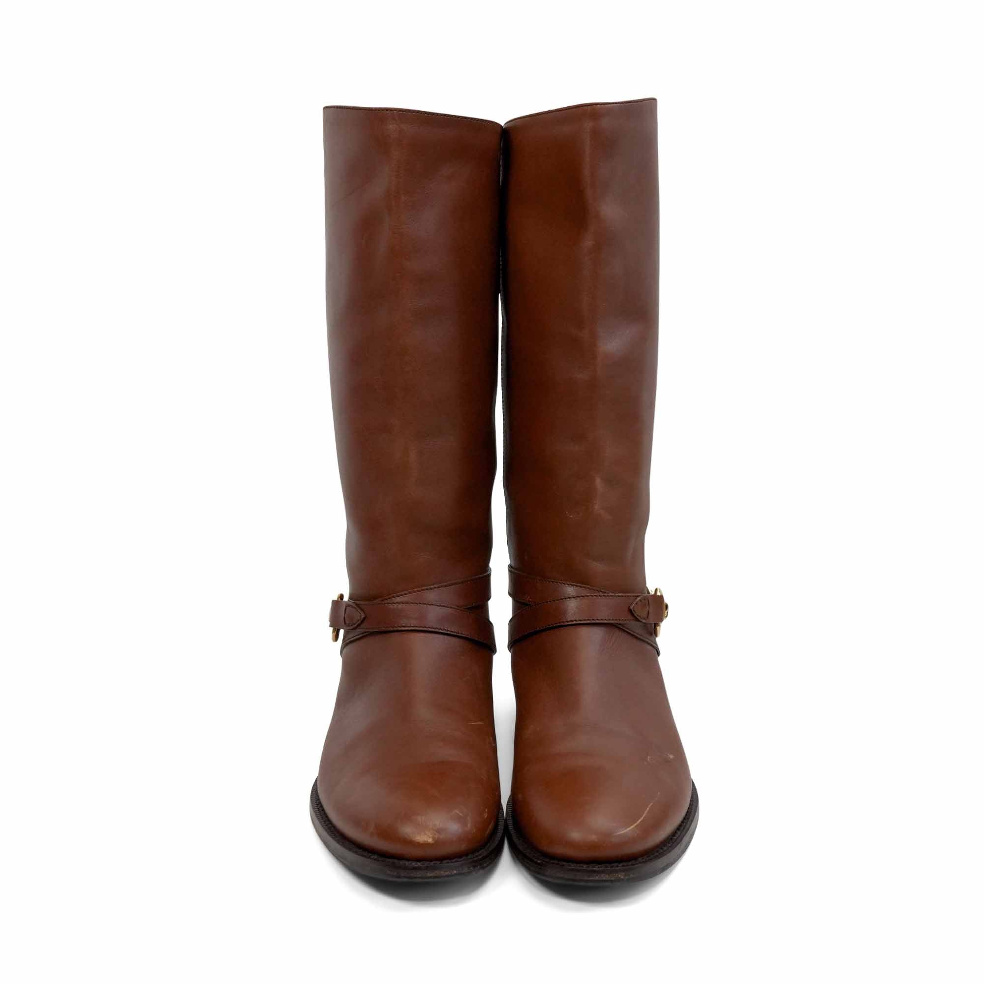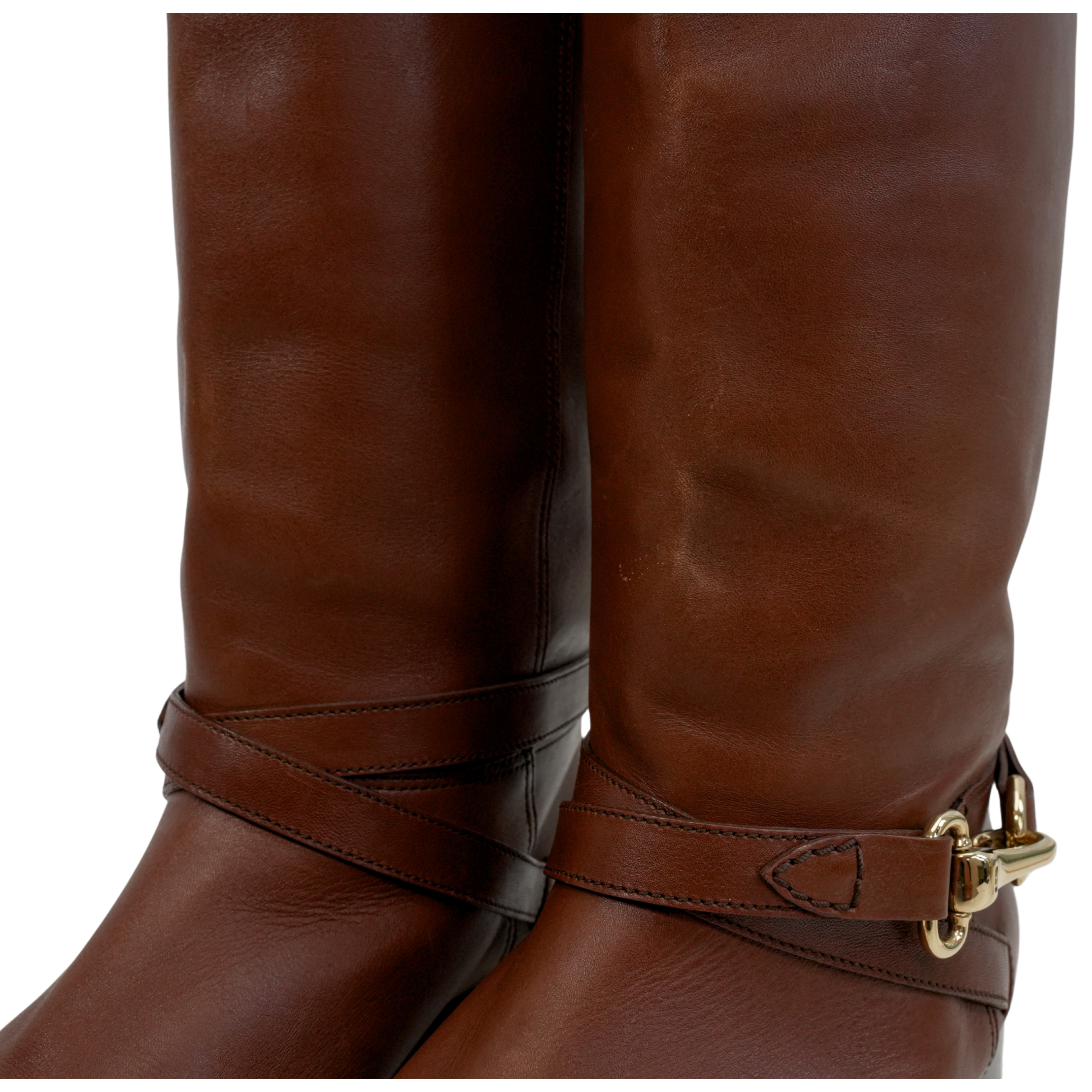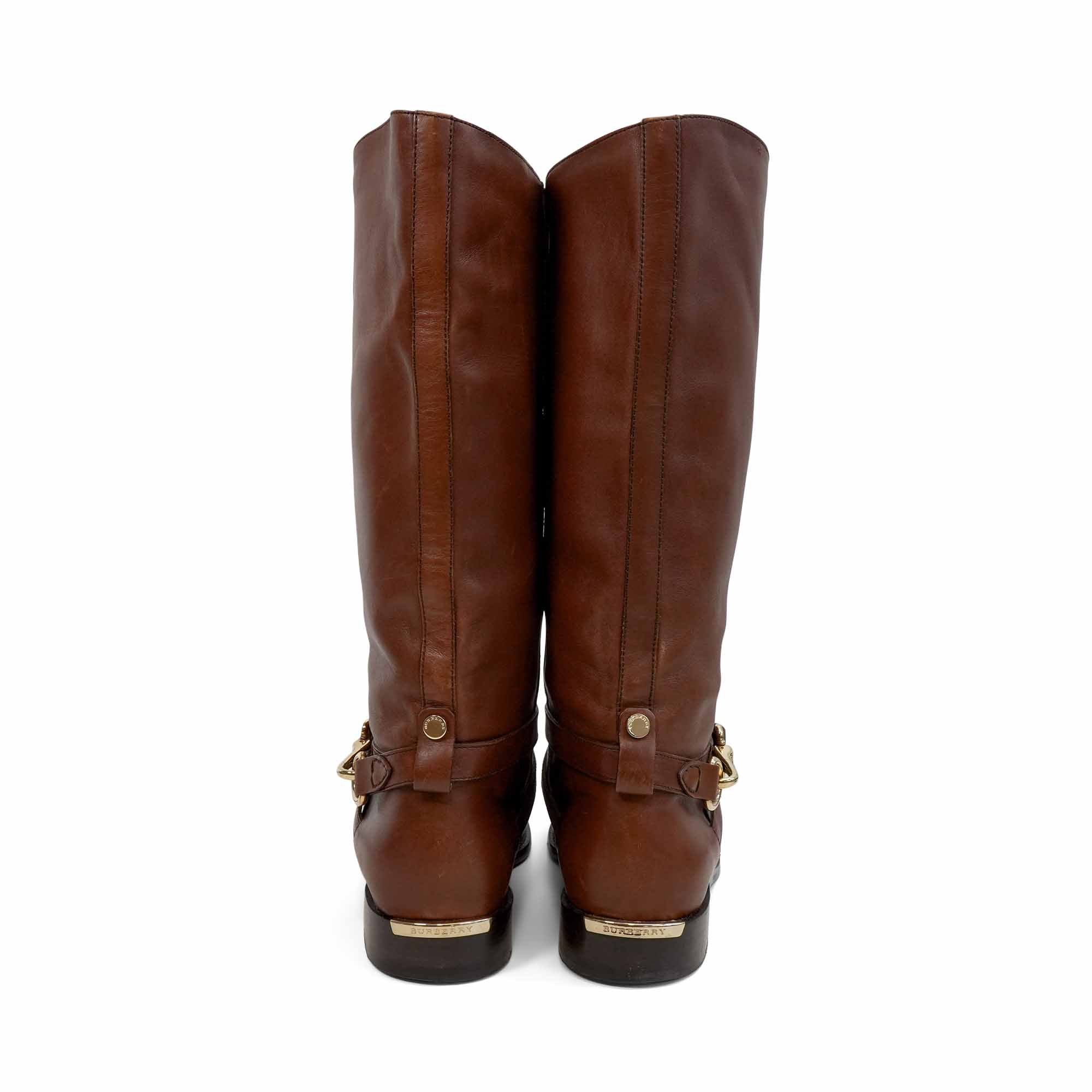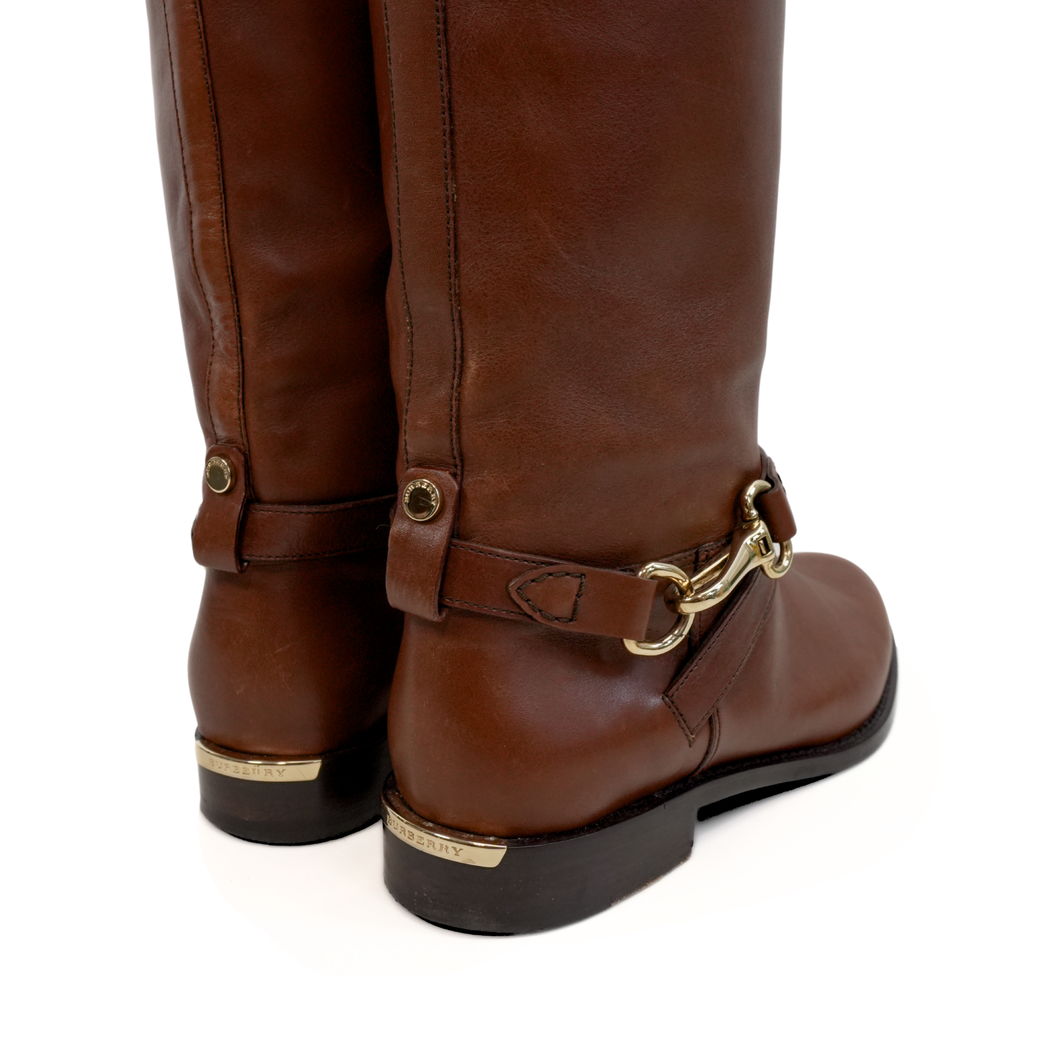Burberry calf-high riding boots in brown leather with an ankle strap detail and gold buckle hardware.