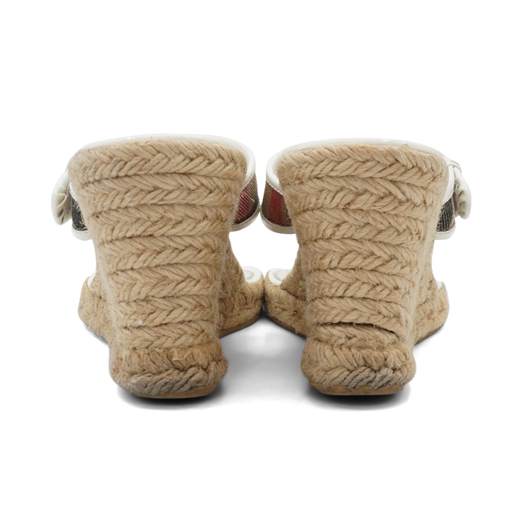Burberry espadrille wedge thong sandals in cream patent leather and novacheck canvas and white buckle detail.