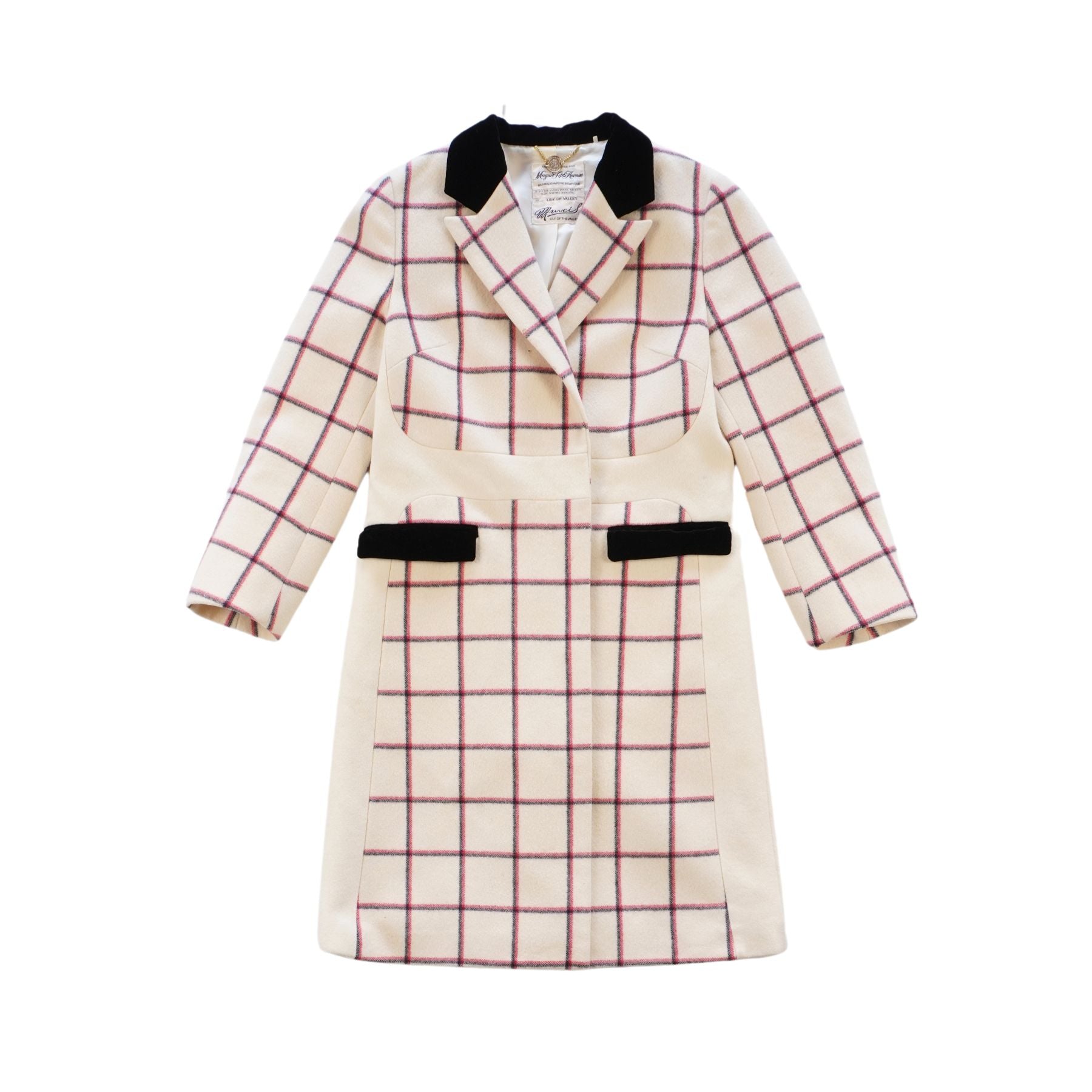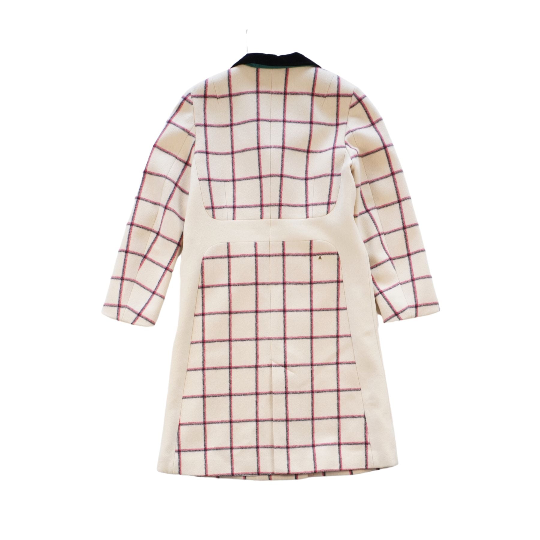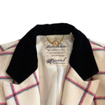 Muguel Fifth Avenue x Lily of the Valley mid-length jacket in cream wool with pink and black grid patterning throughout. Features black velvet details on the collar and front flap pockets, a peak lapel, a back vent, hidden button placket closure, and a small gold 'M' charm on the back right hip.