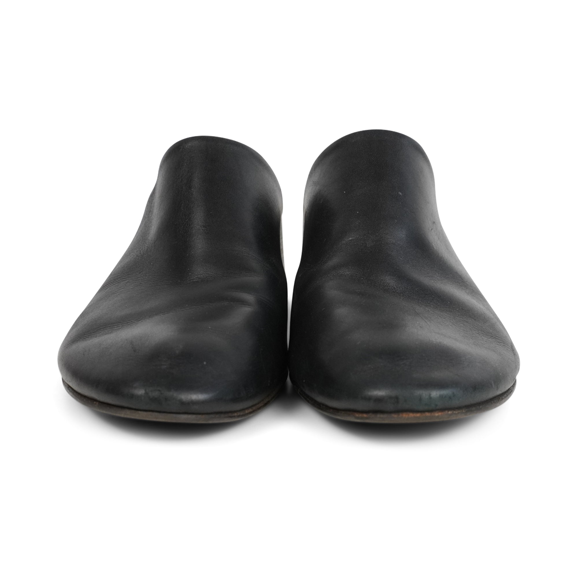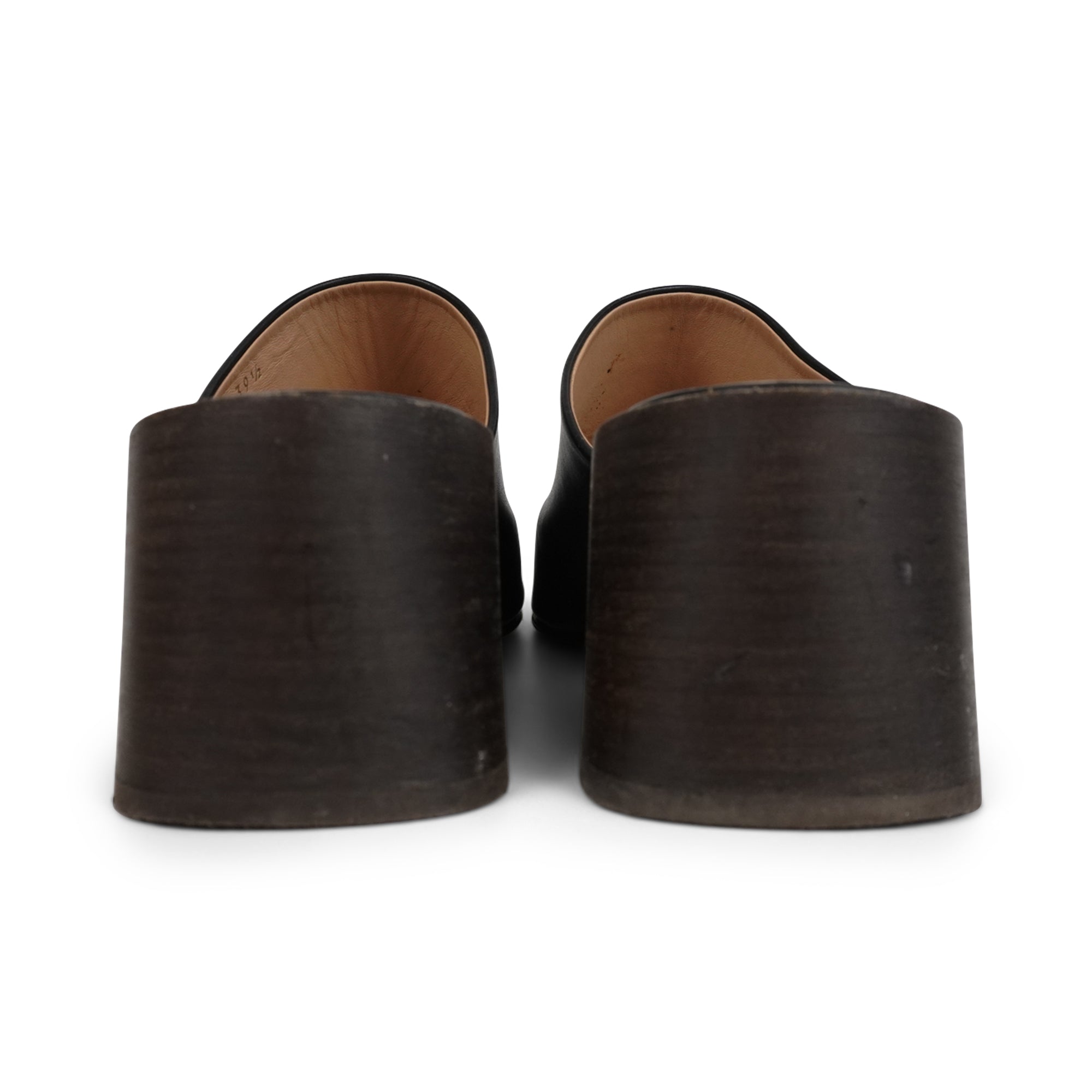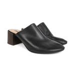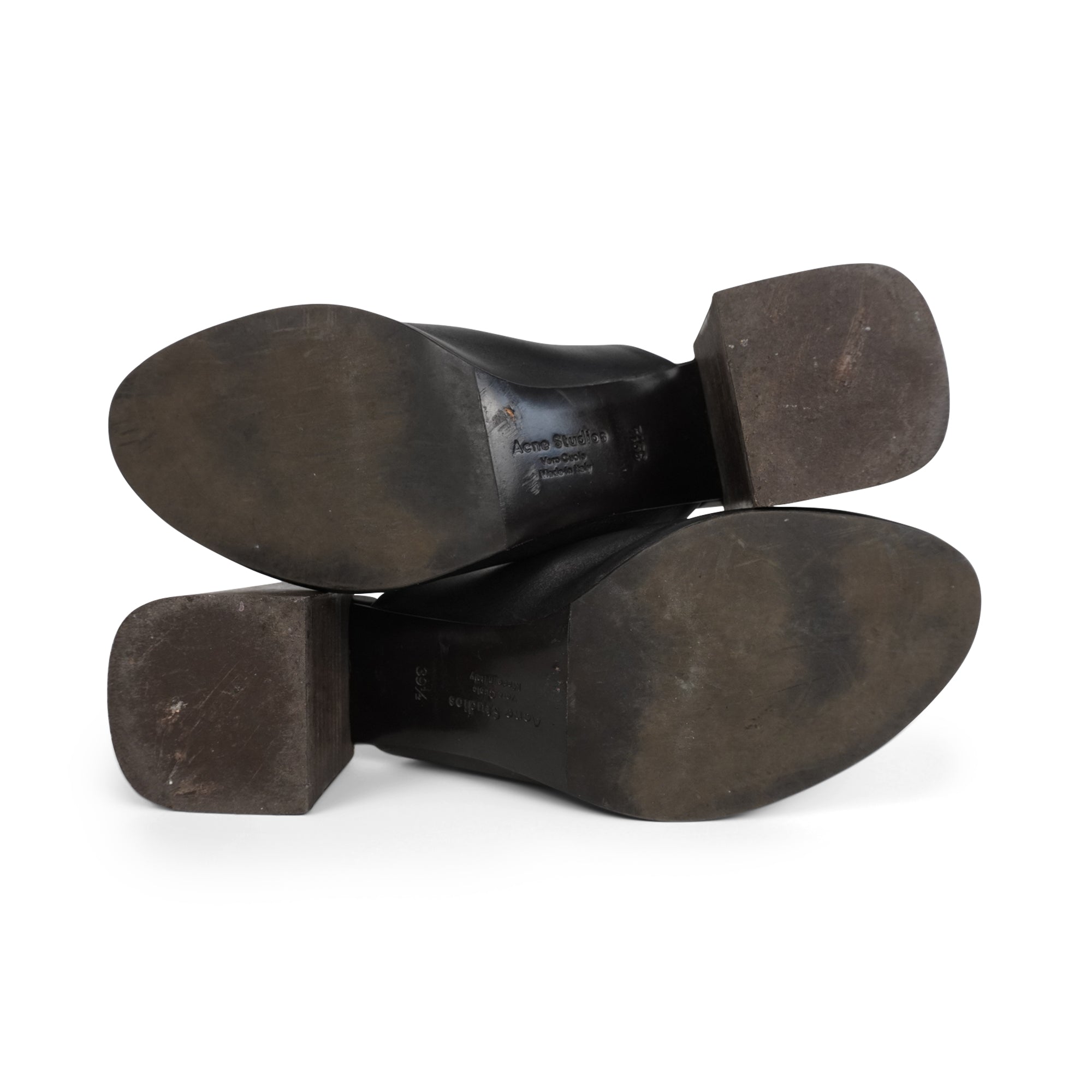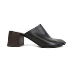 Acne Studios almond-toed mules in black leather with a brown wooden chunky block heel.