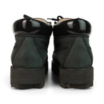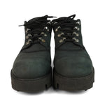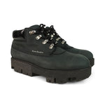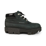 Acne Studios 'Tinne' ankle boots in black Nubuck leather with black patent leather trim around the ankles. Features a lace-up closure with black round laces and silver hardware eyelet and a black rubber sole.
