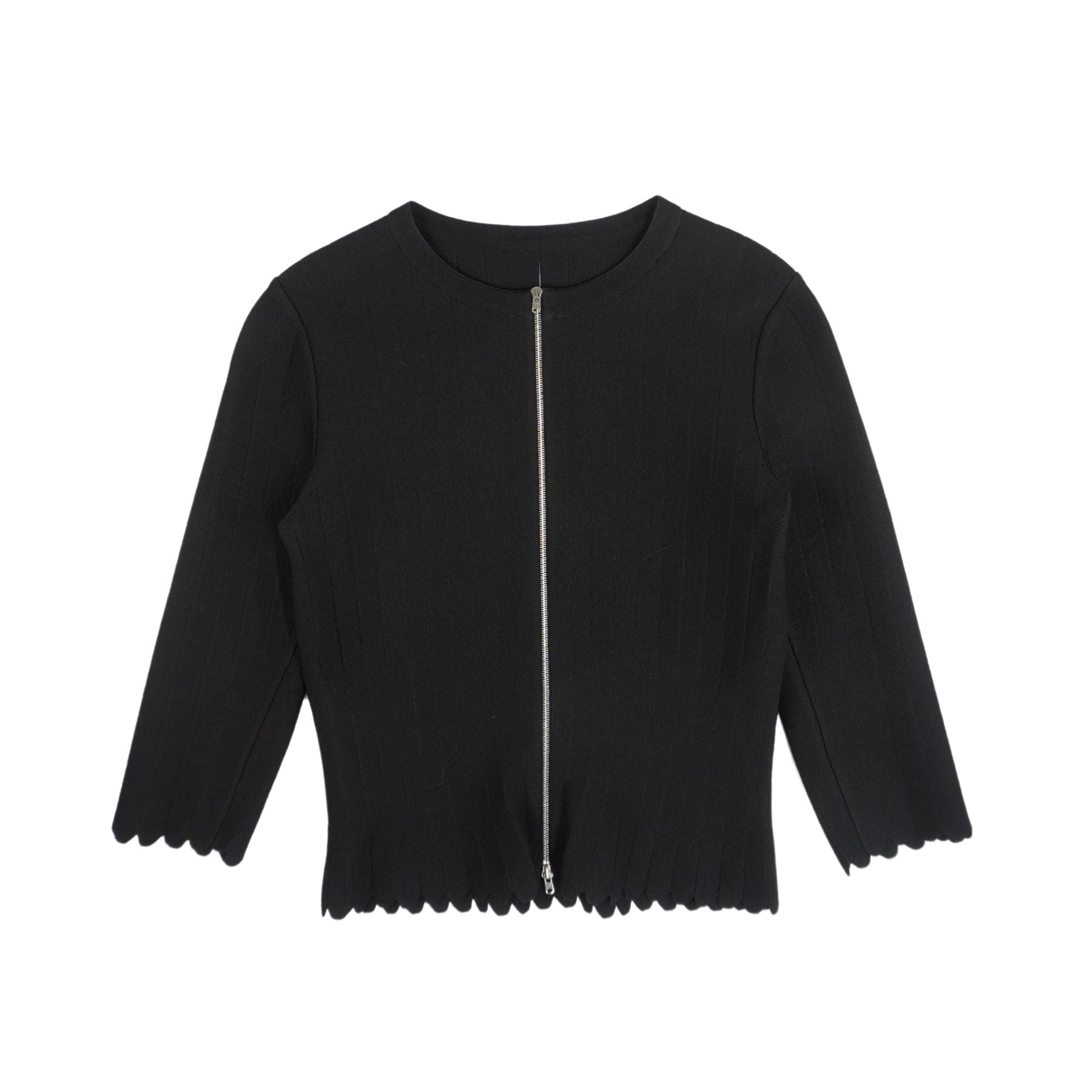 Alaia cardigan top in a black ribbed stretch material with a front-zip opening in silver hardware, 3/4 sleeves, and a scalloped trim.