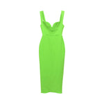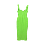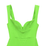 Alex Perry maxi fitted dress in bright green poly blend with a sweetheart neckline and boning detailing. Features thick straps and back zip closure.