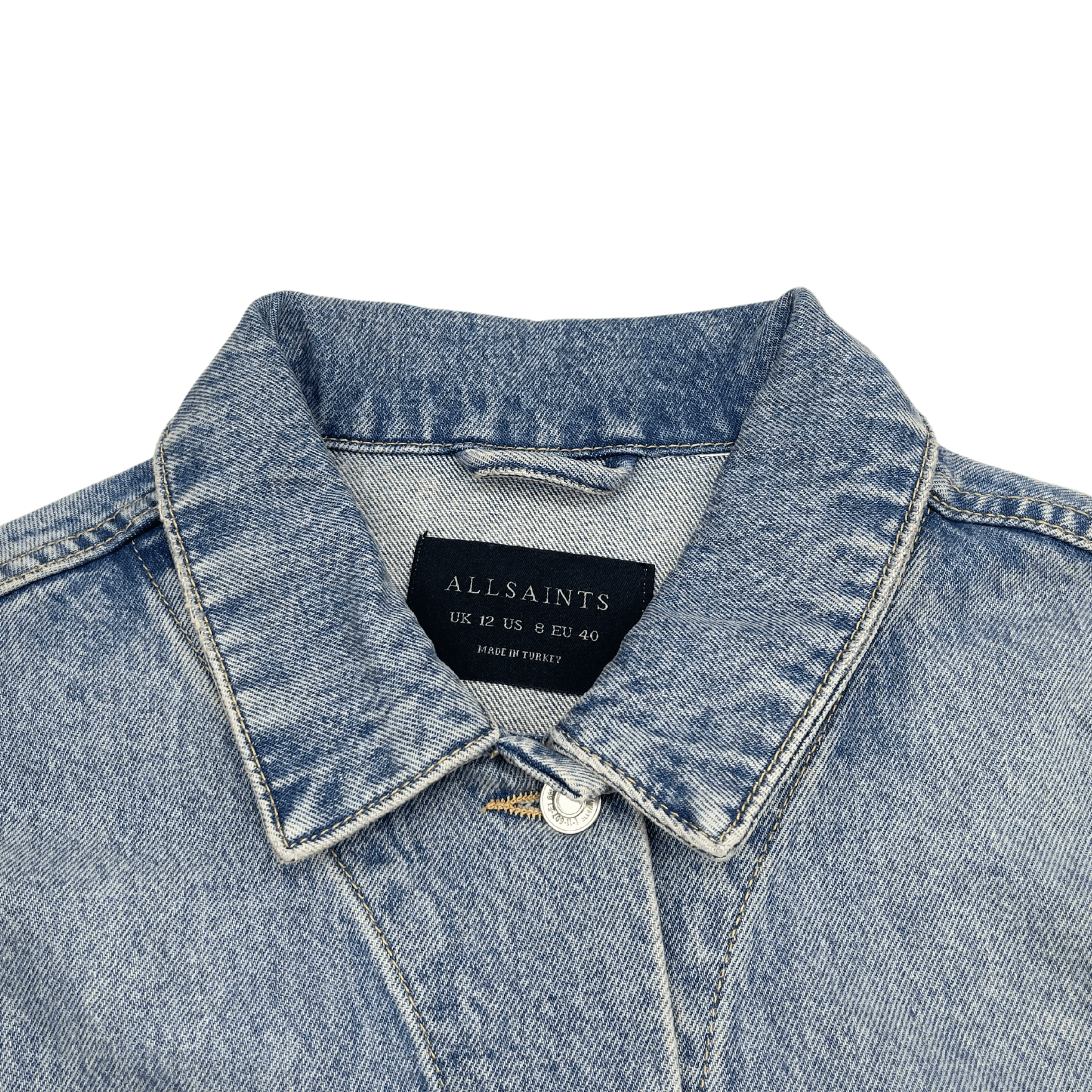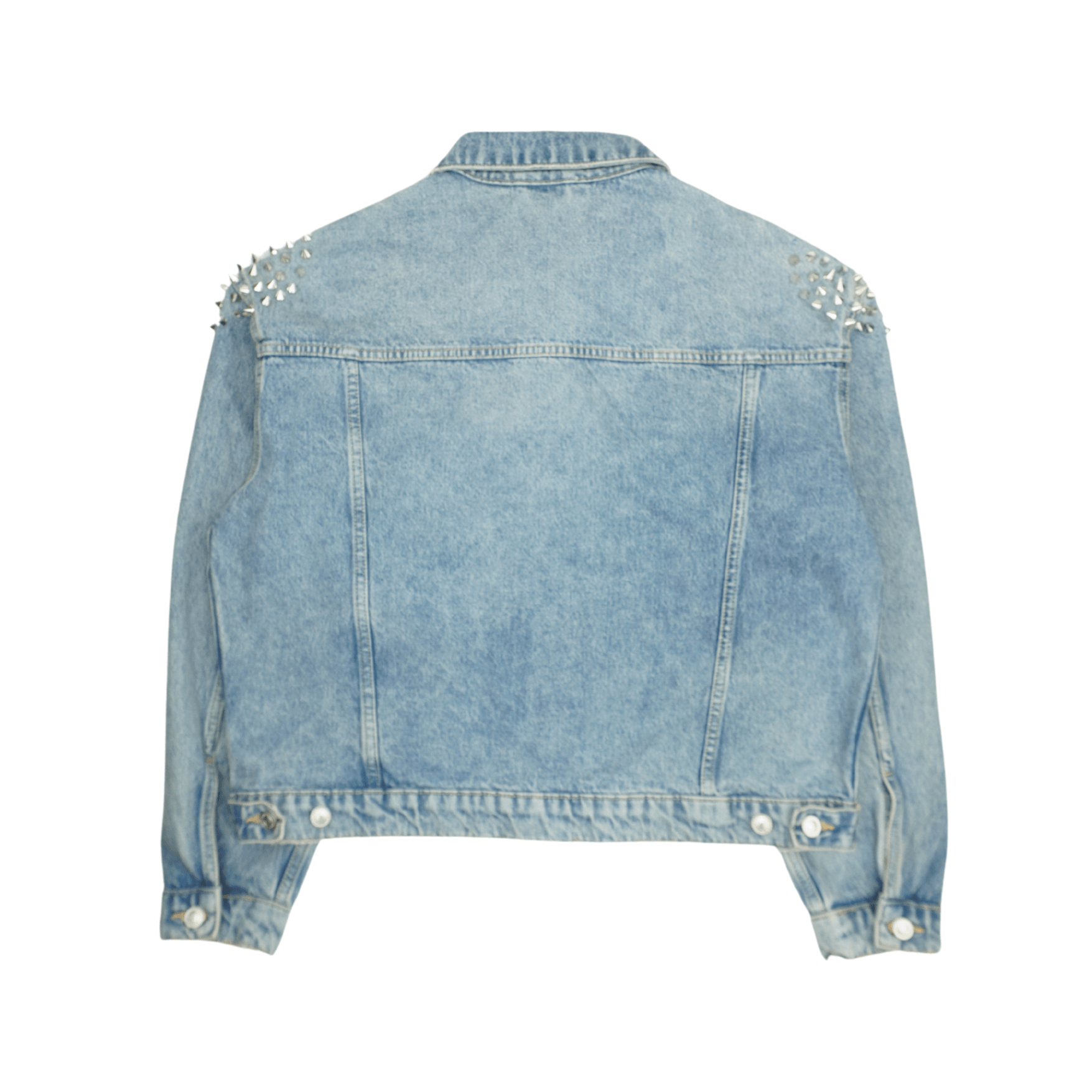 All Saints denim jacket in light blue cotton denim with front pockets, silver button hardware, and cone stud detailing on the shoulders.