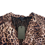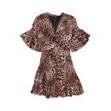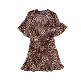 All Saints 'Dina Evita' dress in a brown and black leopard printed viscose with sort ruffle sleeves, covered button details down the front, a ruffle hem, and a belt tie at the waist.