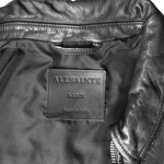 All Saints black leather jacket with front zip pockets and silver hardware throughout.