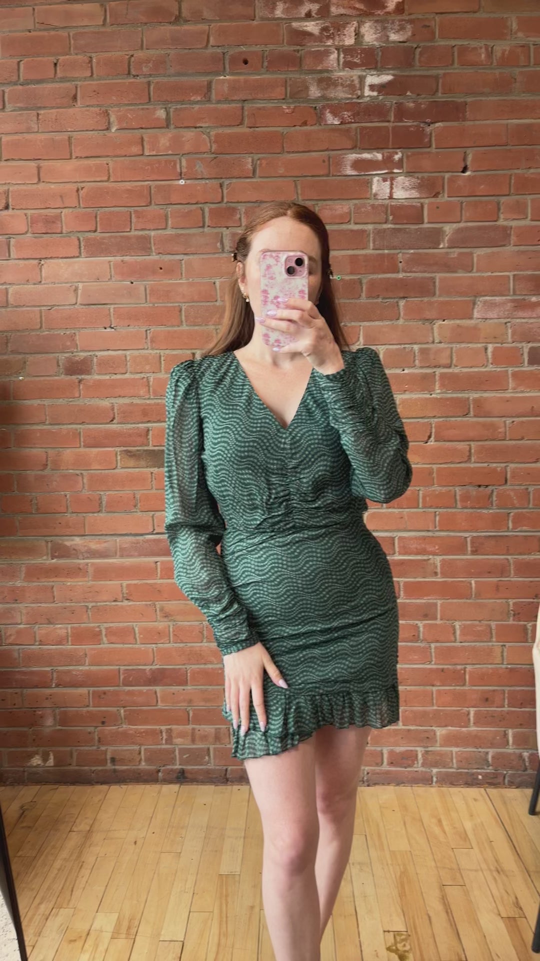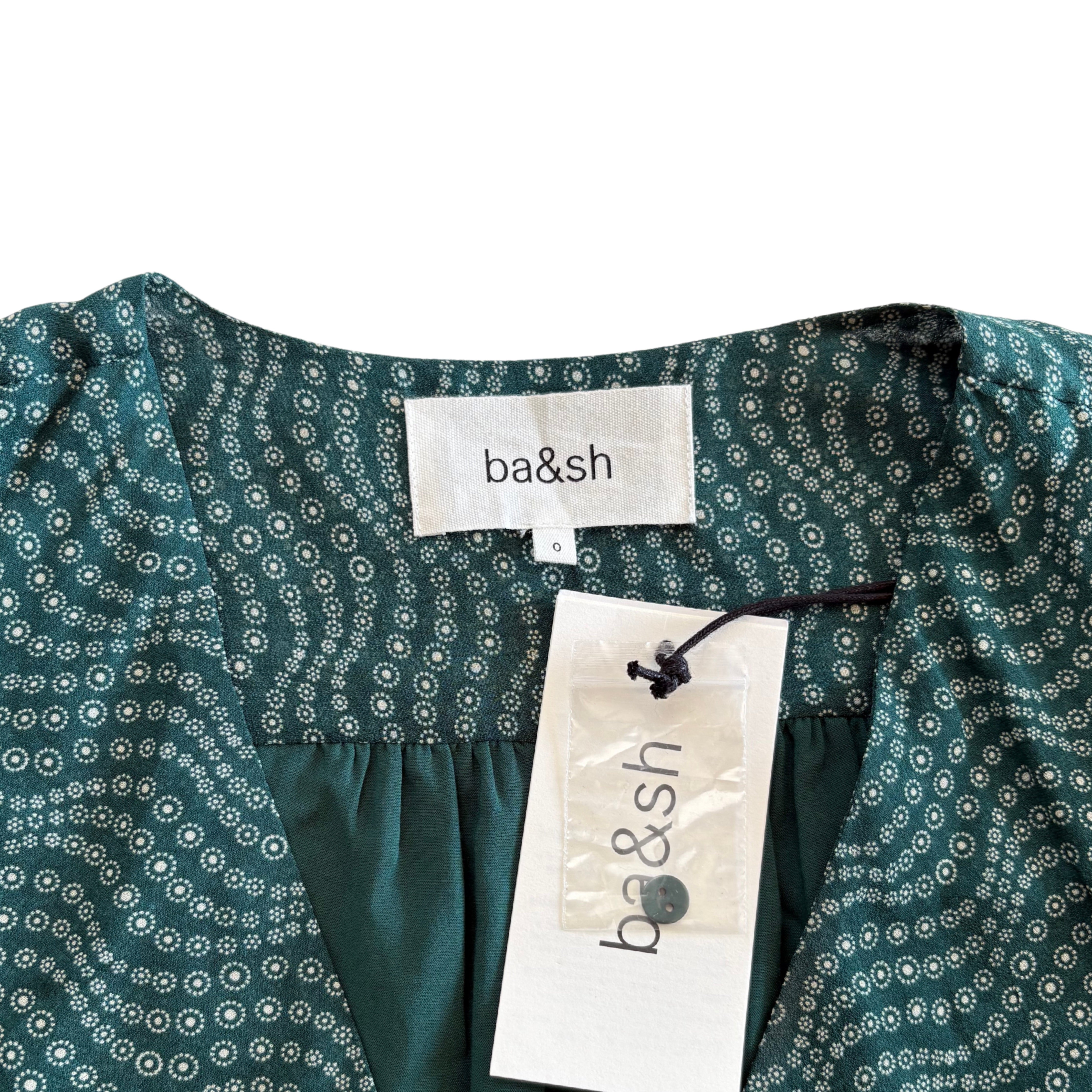 Ba&sh 'Little Ruched' mini dress in dark green and white printed satin with sheer sleeves, v-neck, and ruffled hem.