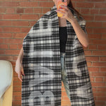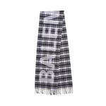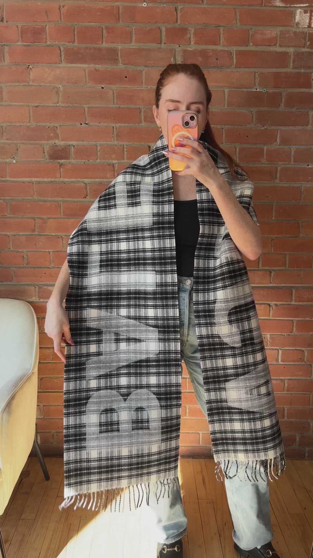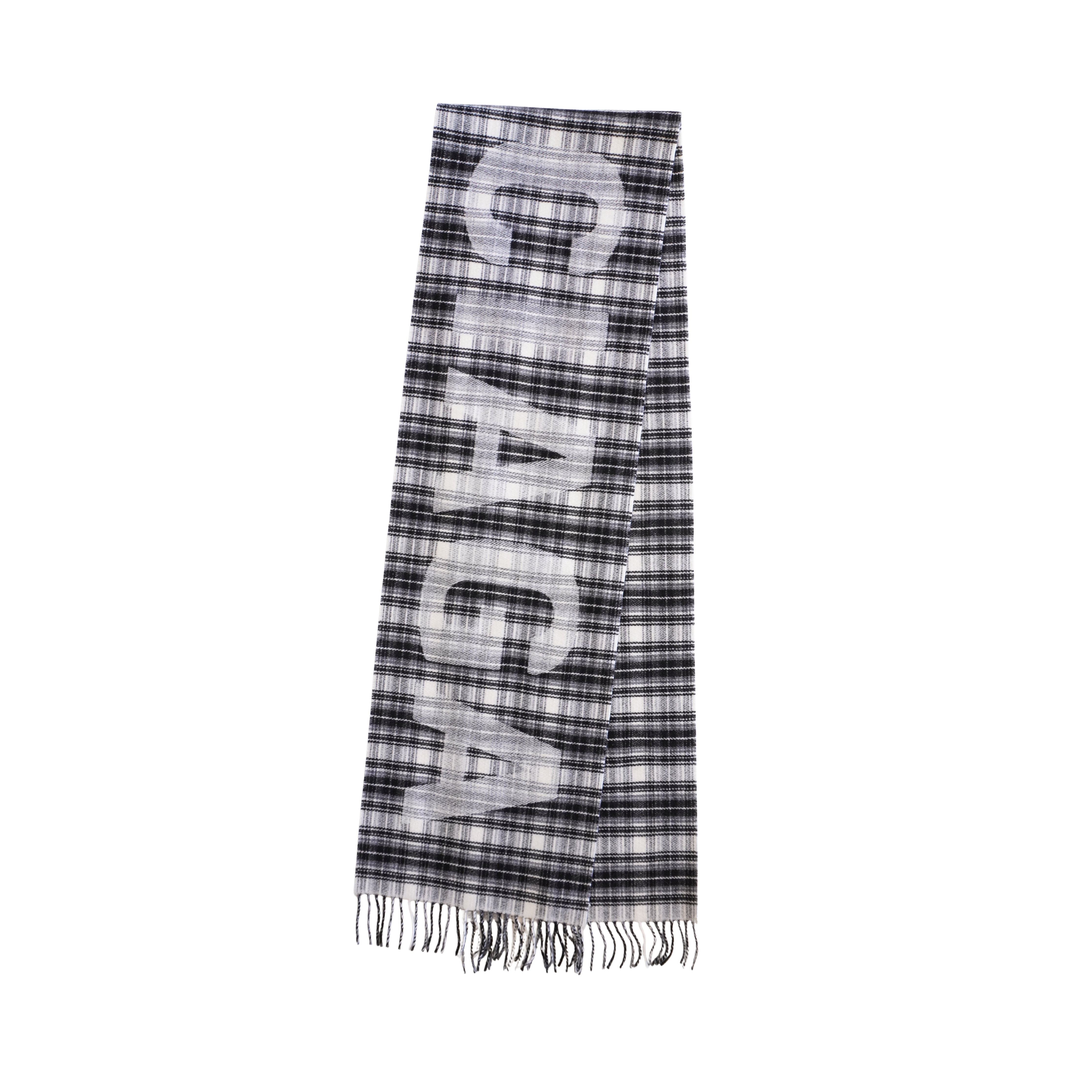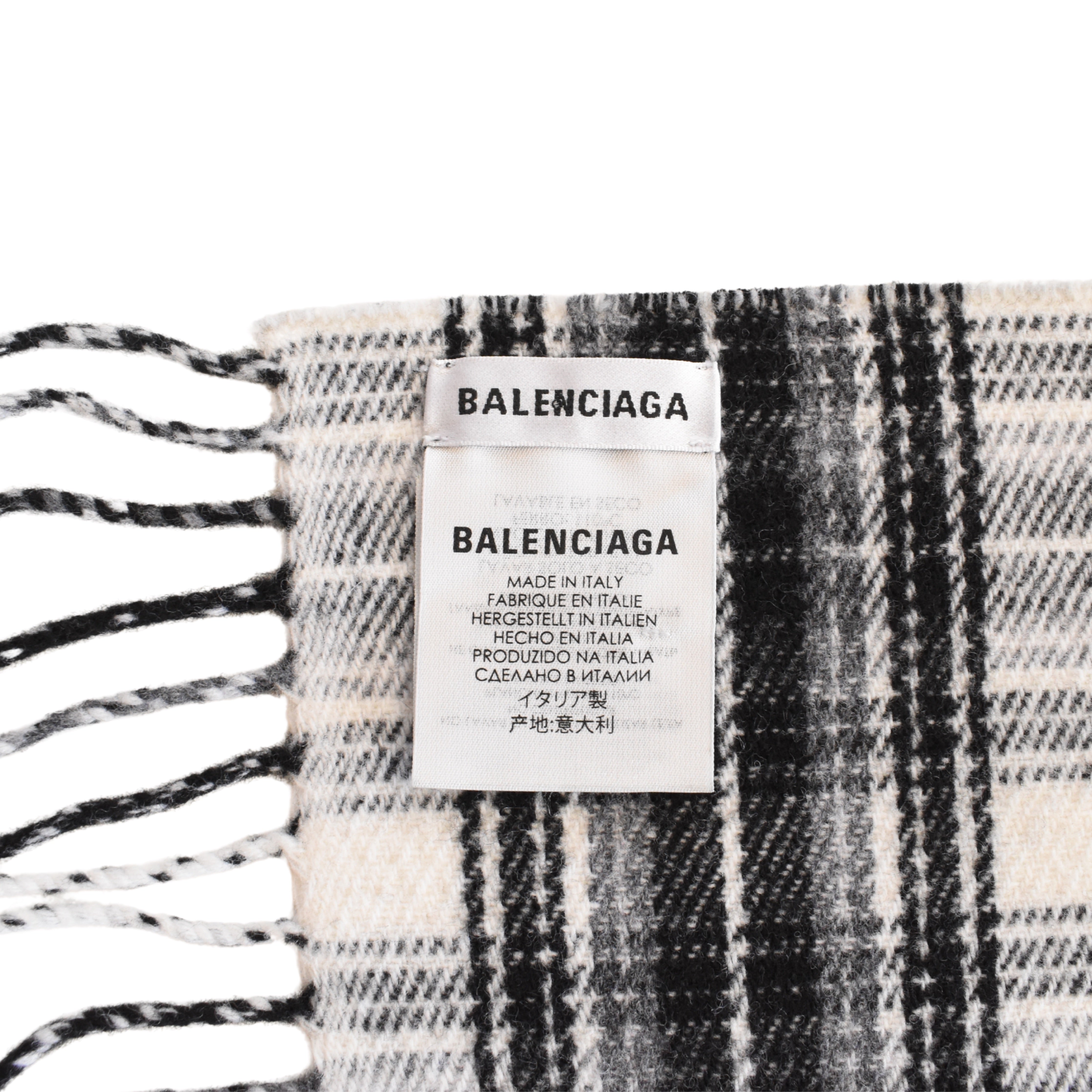 Balenciaga 'Logo Tartan' oversized scarf in black, white, and grey plaid wool with a faded white logo and fringe ends.