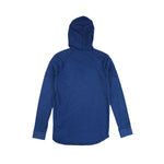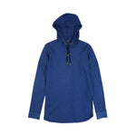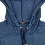 Balmain hoodie sweater in a blue cotton blend with an embossed logo across the chest, ribbed and padded shoulders, and a black drawstring around the hood with gold metal hardware.