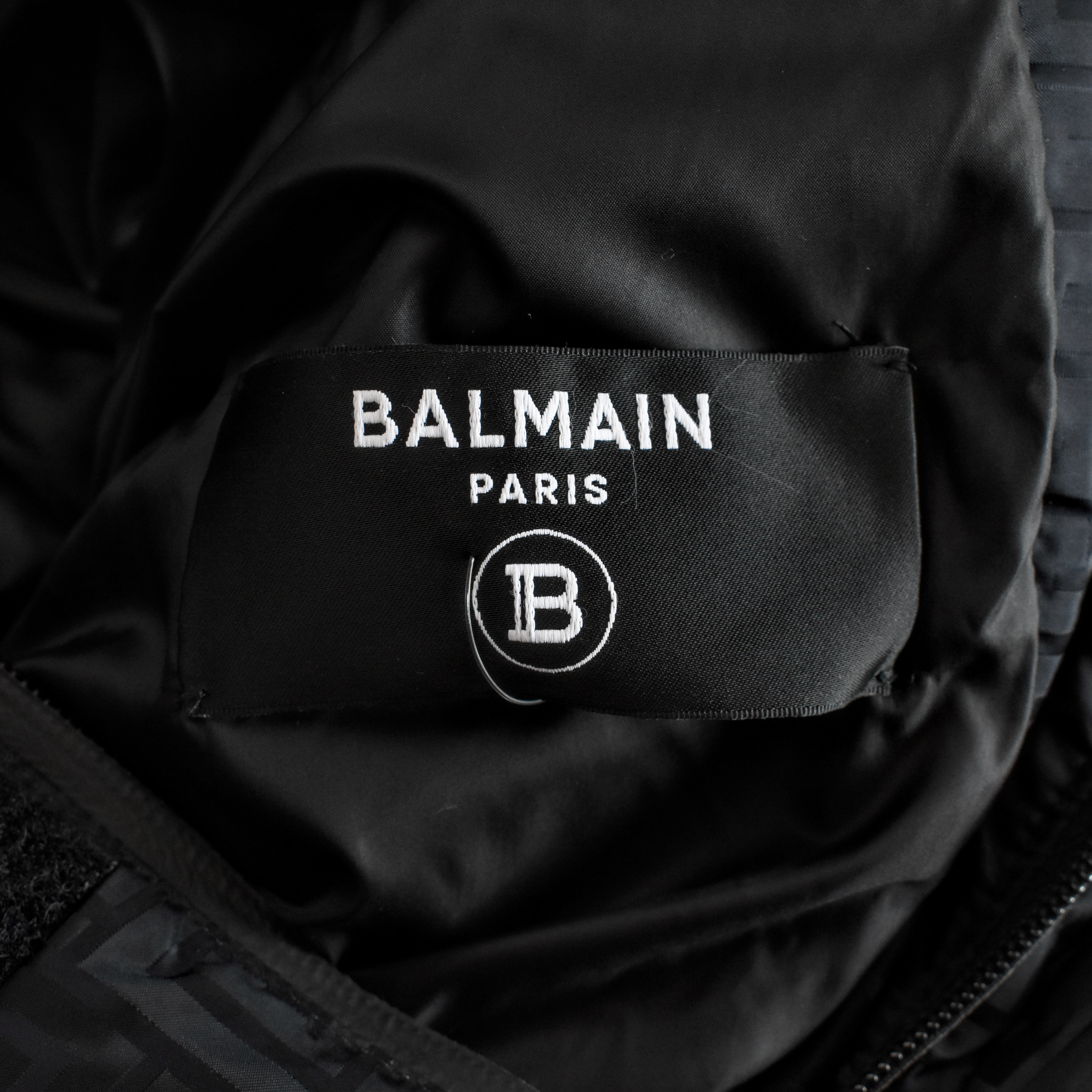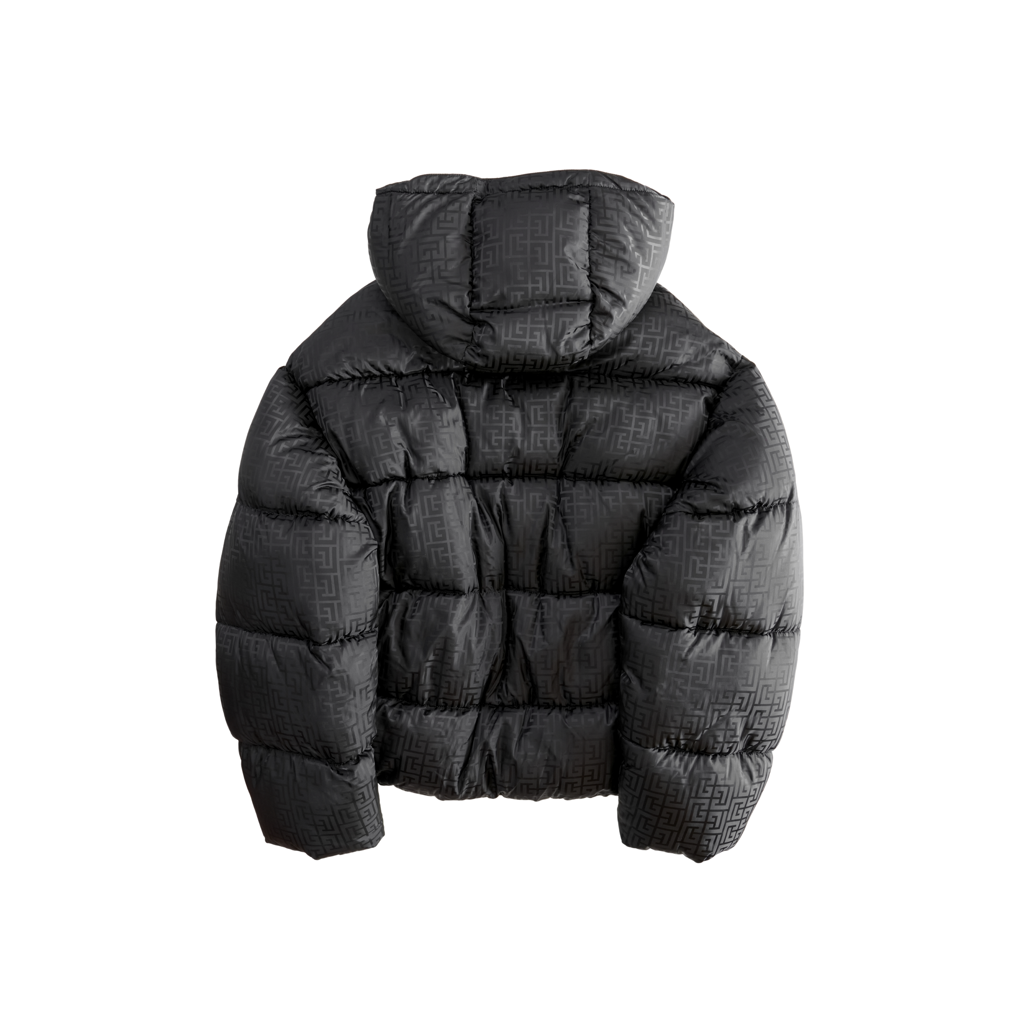 Balmain puffer jacket in tonal monogram pattern with front zip, velcro storm flat, zip pockets, zips at the cuffs, and a removable hood.