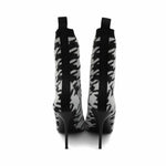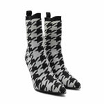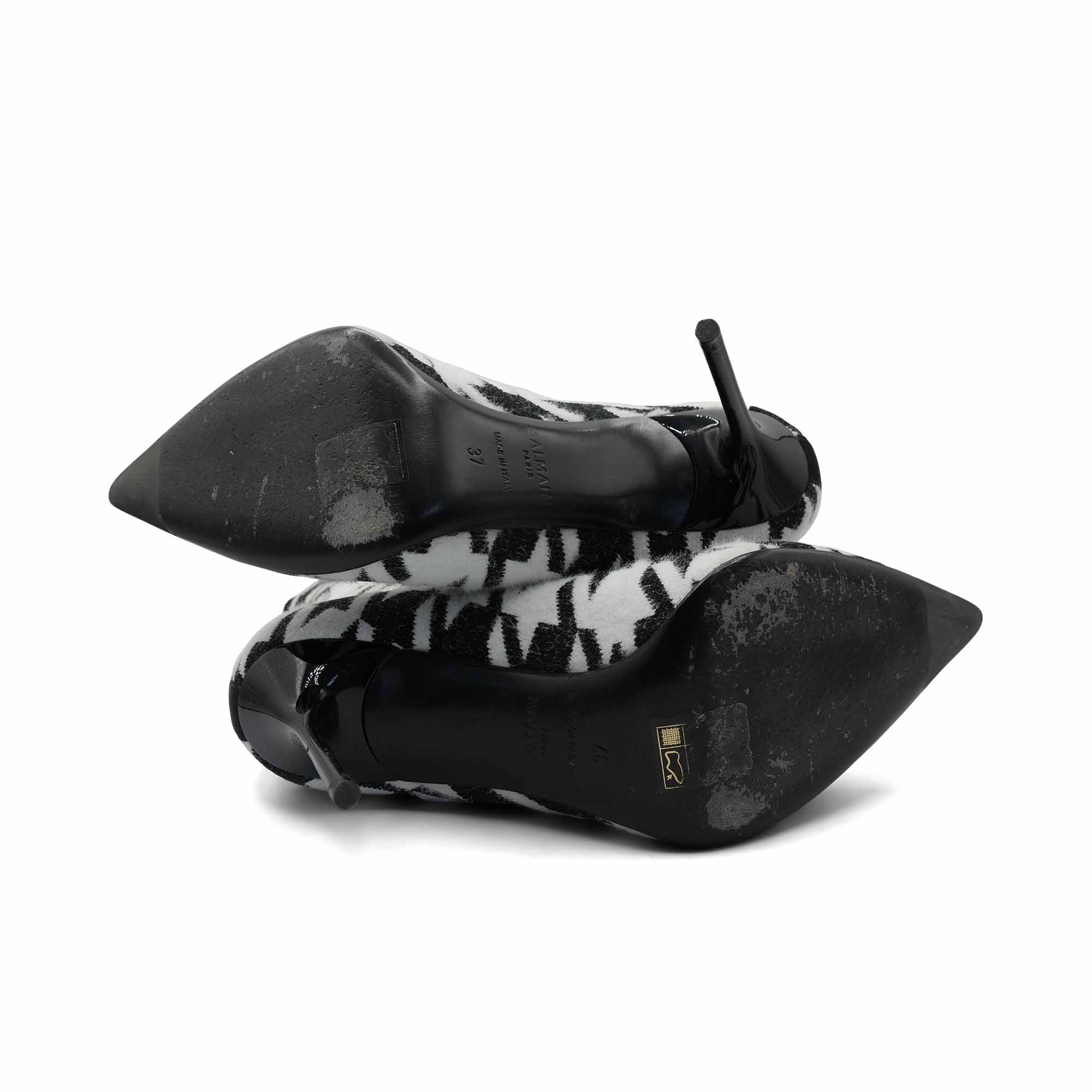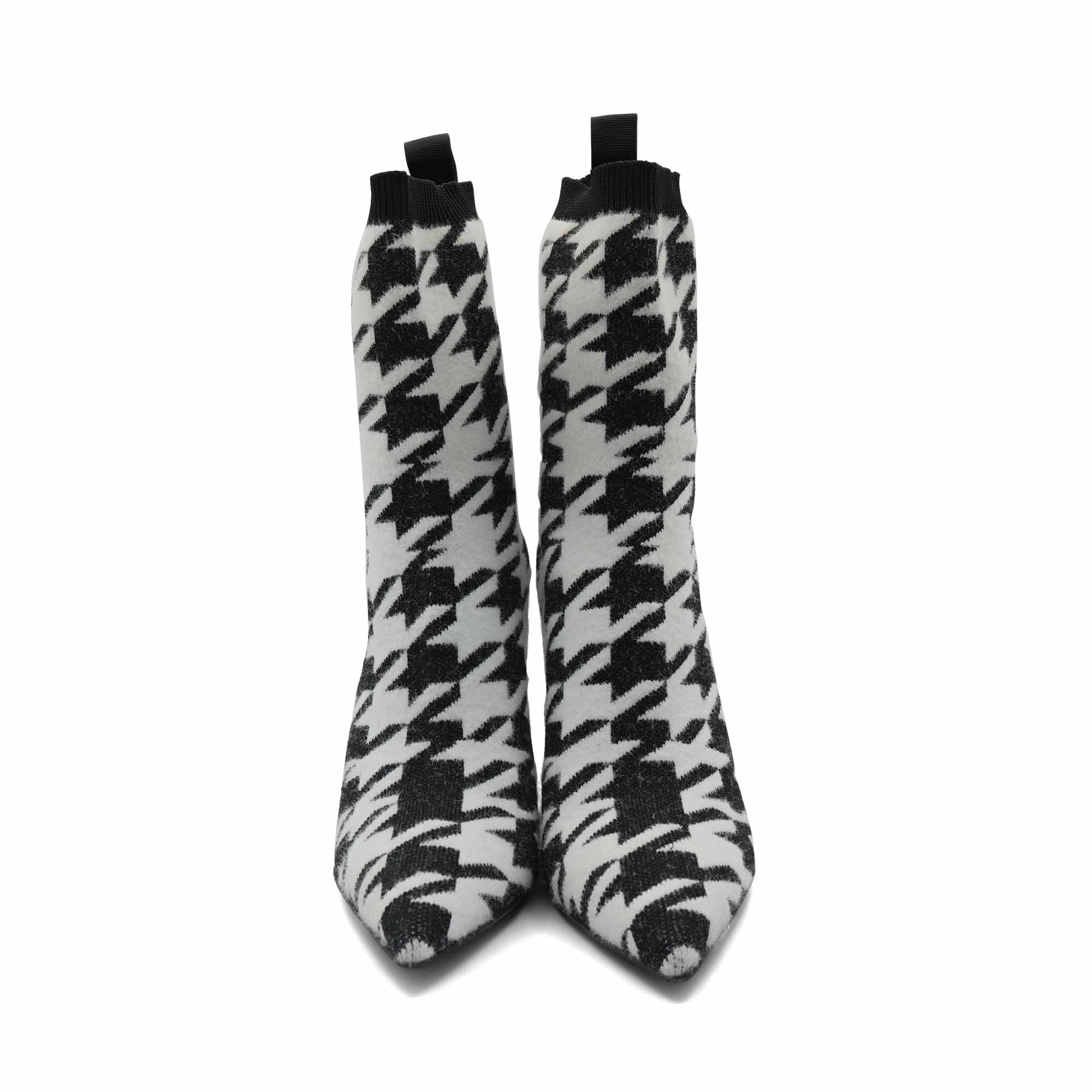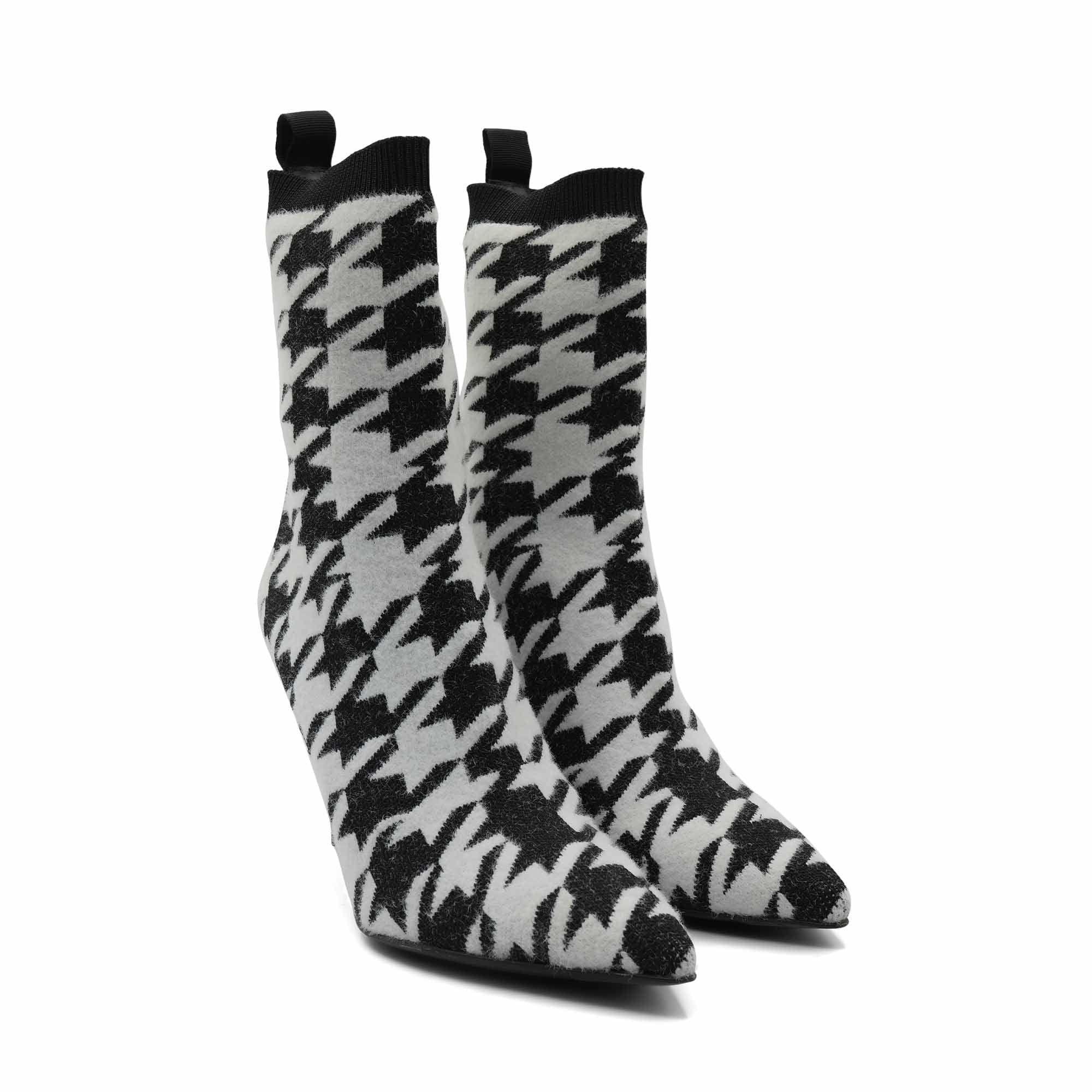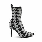 Balmain 'Skye' pointed toe boots in black and white houndstooth stretch knit with black glossy stiletto heels and grosgrain pull tab detail.