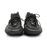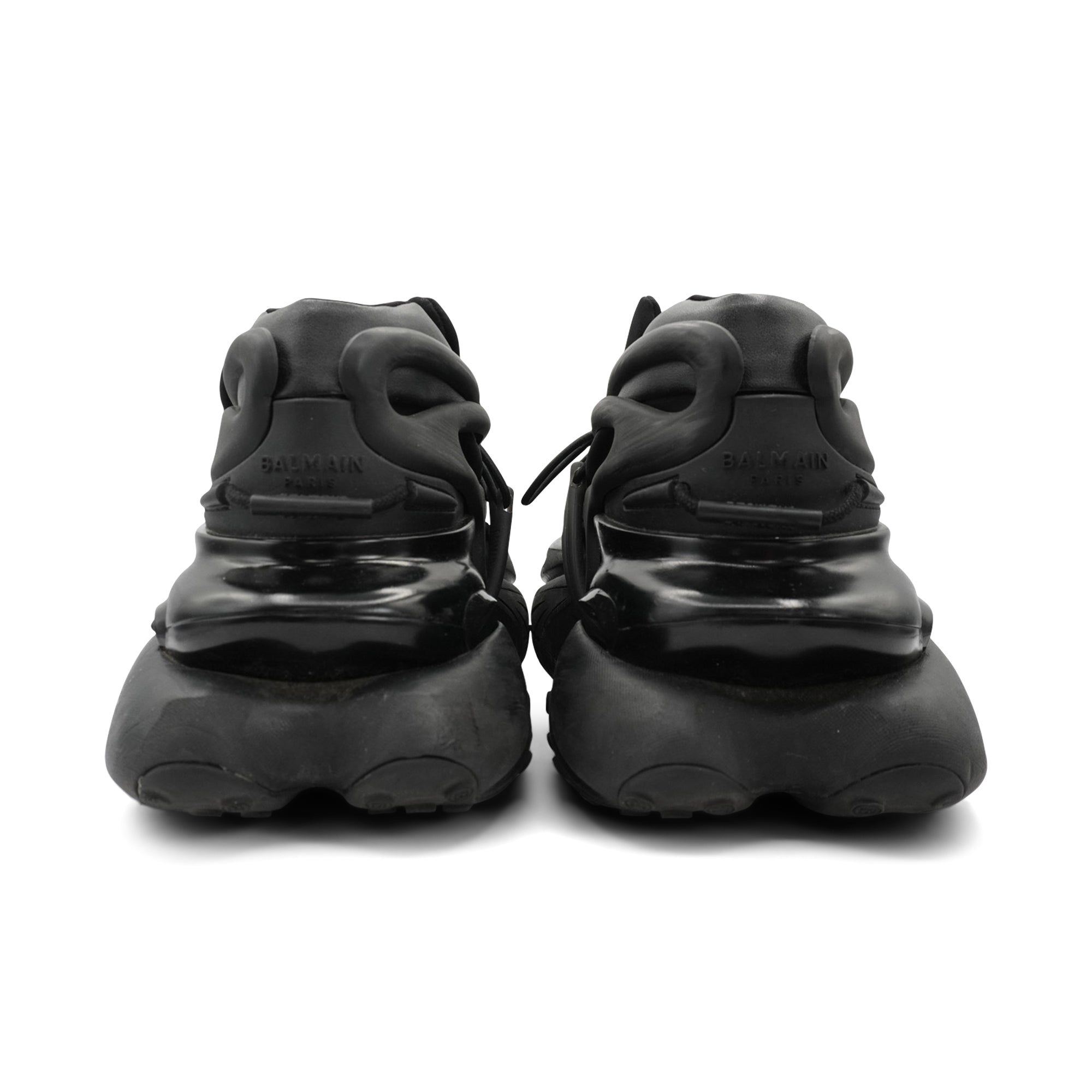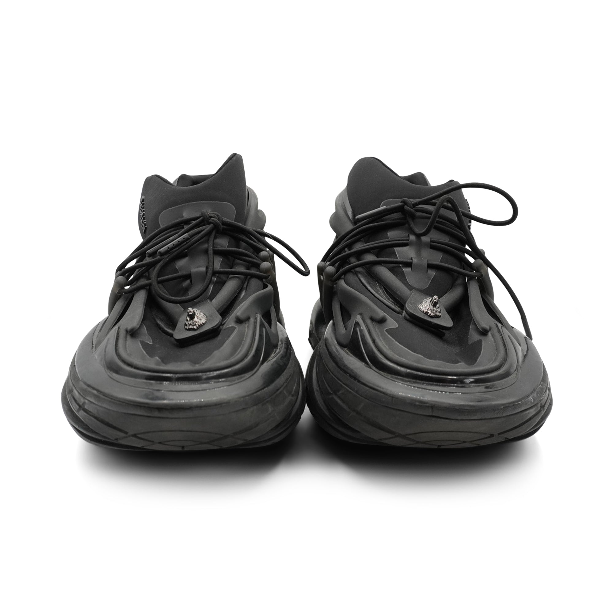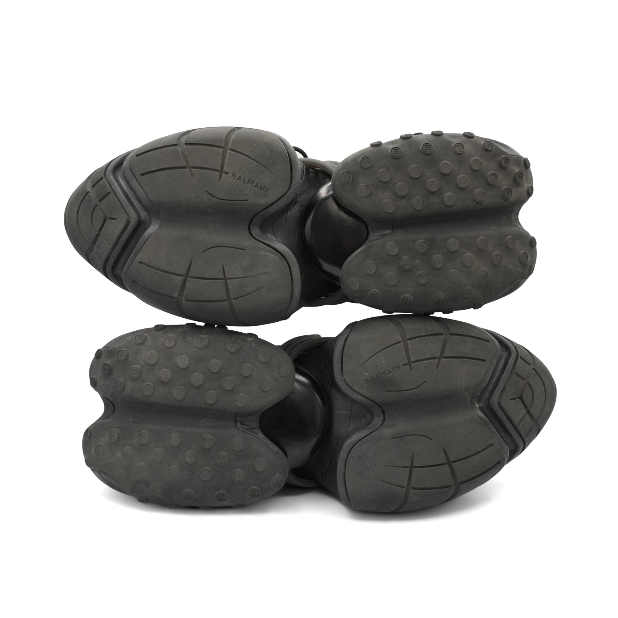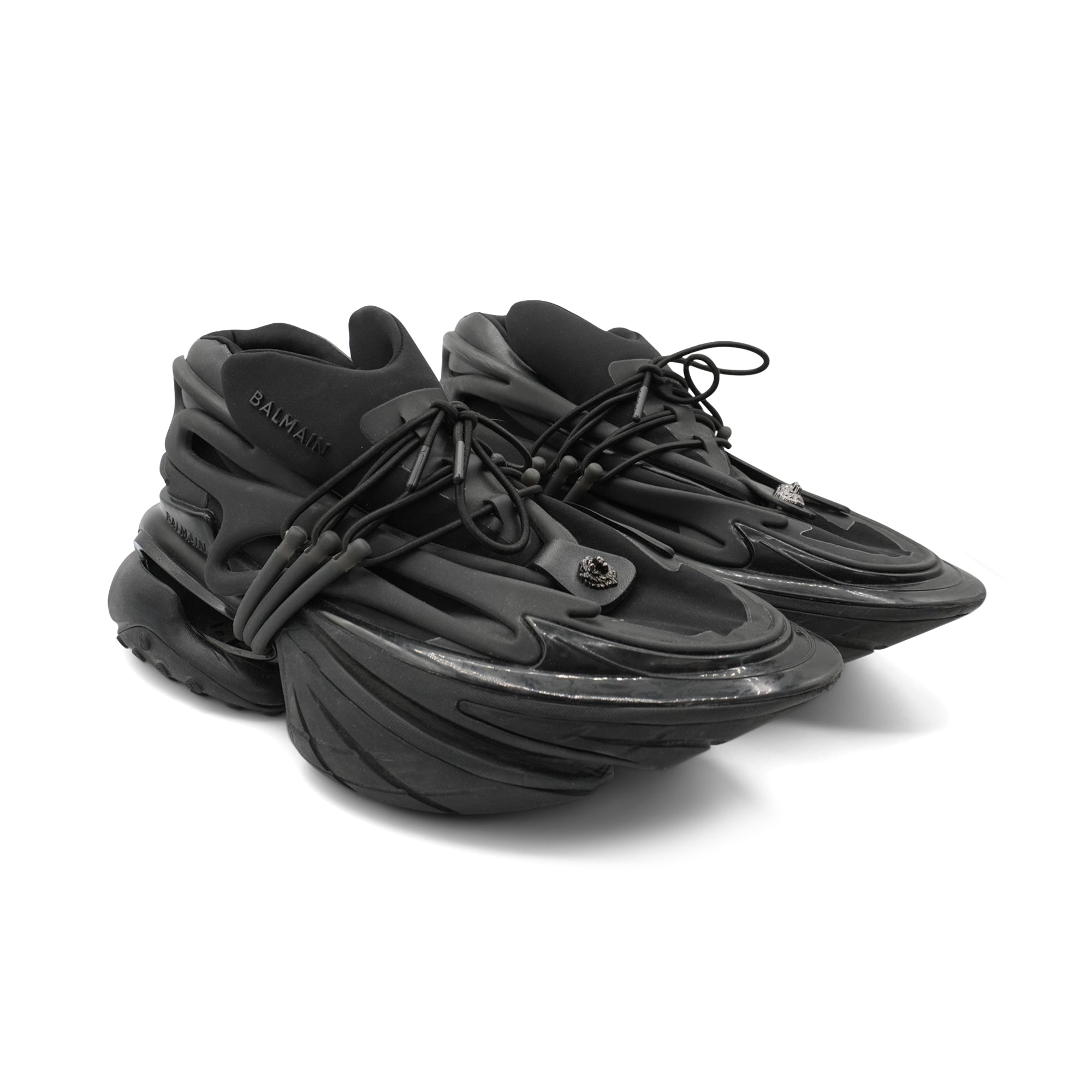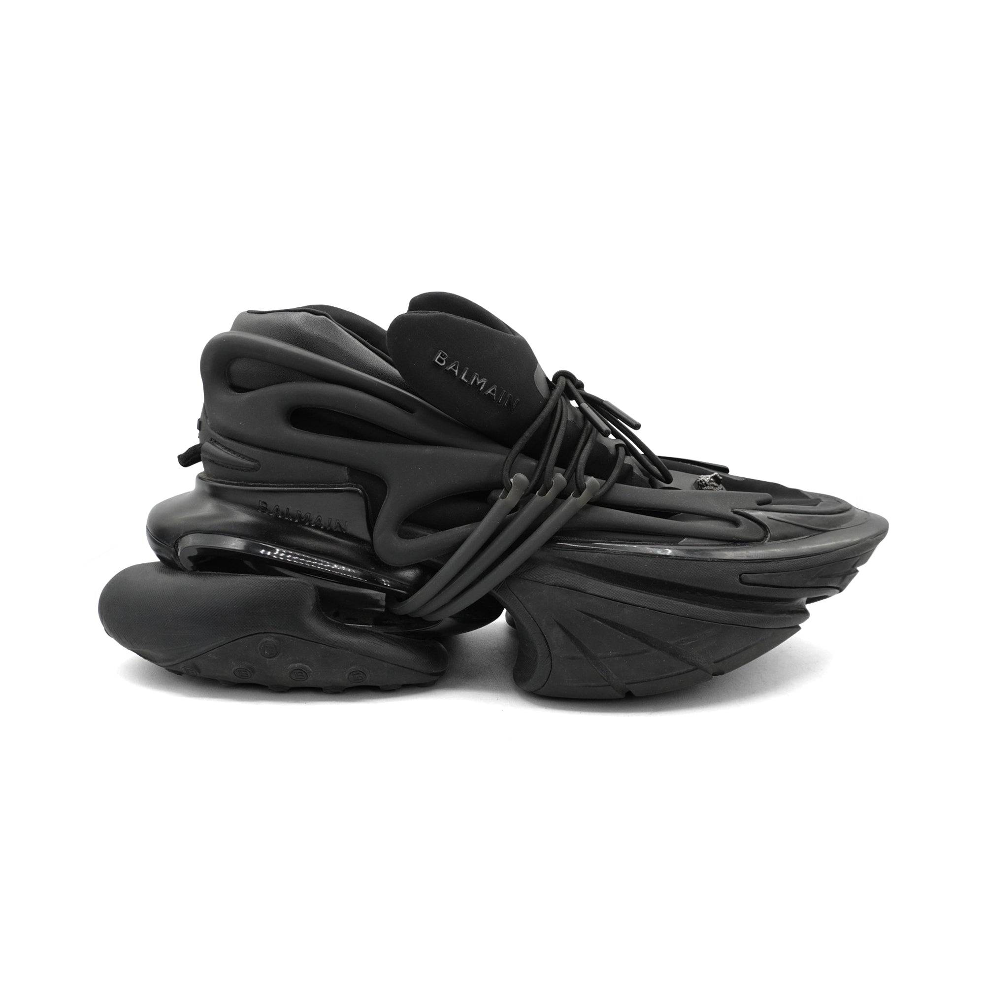 Balmain 'Unicorn' sneakers in black neoprene and rubber with a pointed toe, a lion head charm in gunmetal hardware, and a chunky sole.