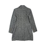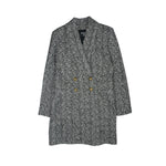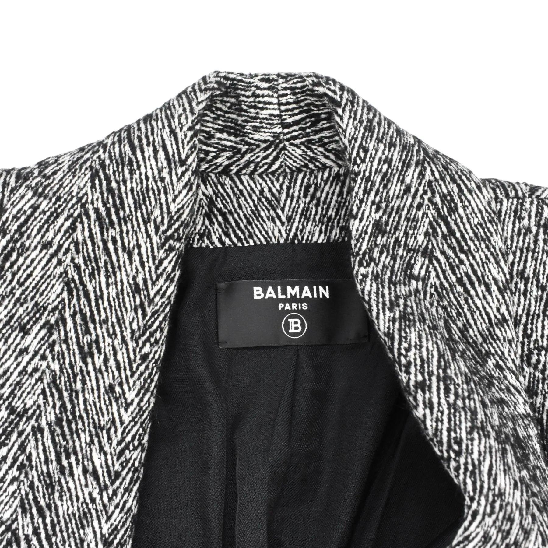 Balmain long blazer-style jacket in black and white wool blend. Features double-breasted button front closure with gold logo engraved buttons, a shawl lapel, two top-flap pockets on the sides, padded shoulders, and a back vent.