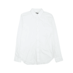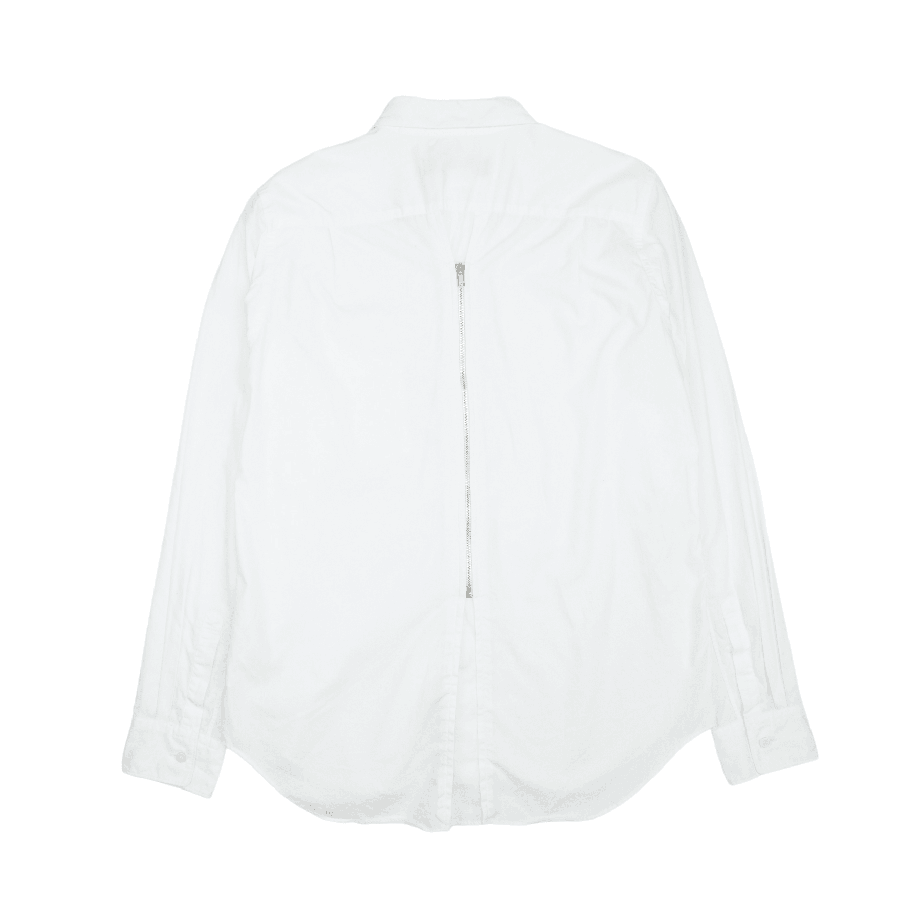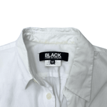 BLACK Comme Des Garcons button-down shirt in white cotton with a zipper opening on the back in silver hardware.