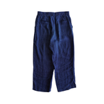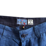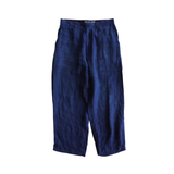 Blue Blue Japan wide-leg pants in indigo blue linen with a black front button closure and side pockets.