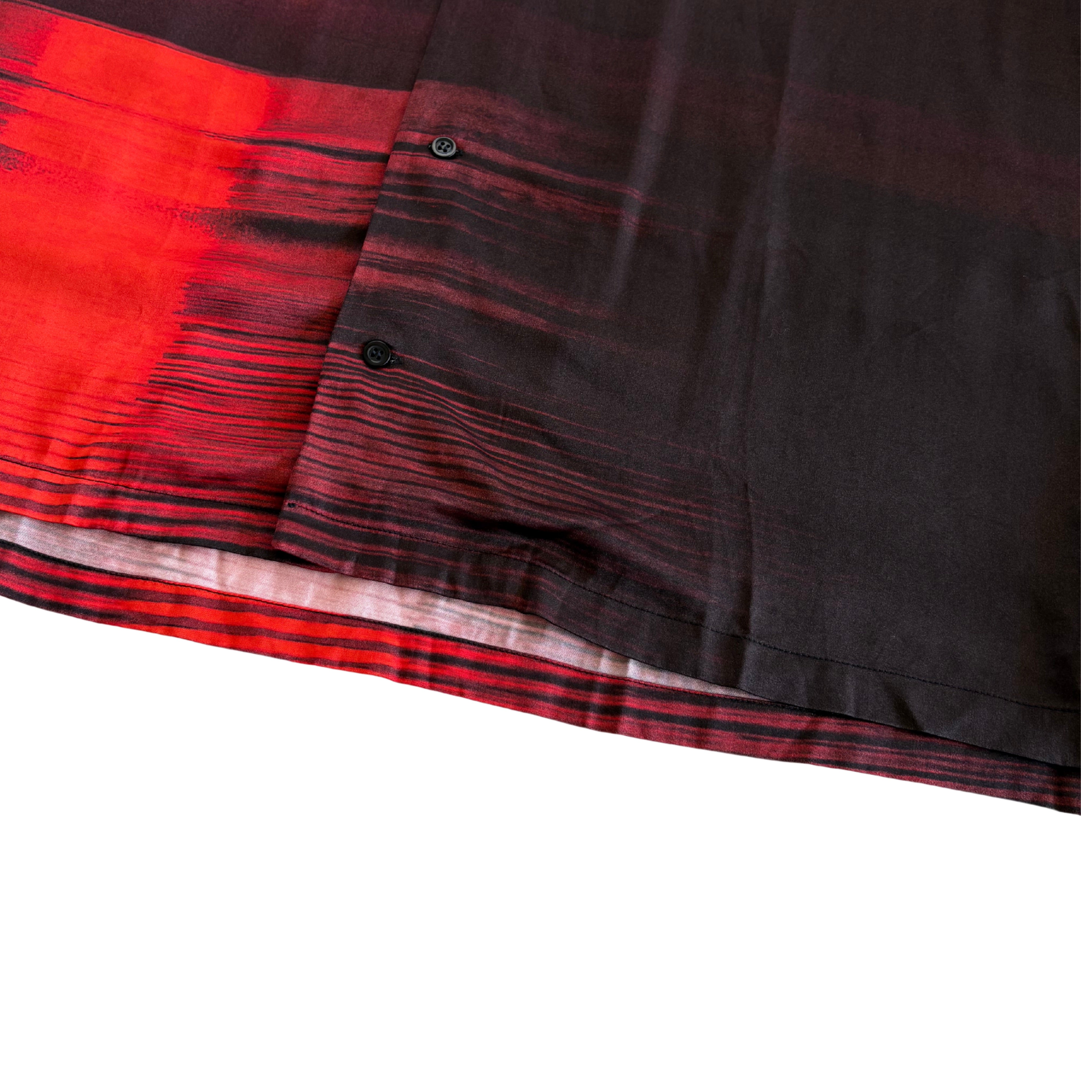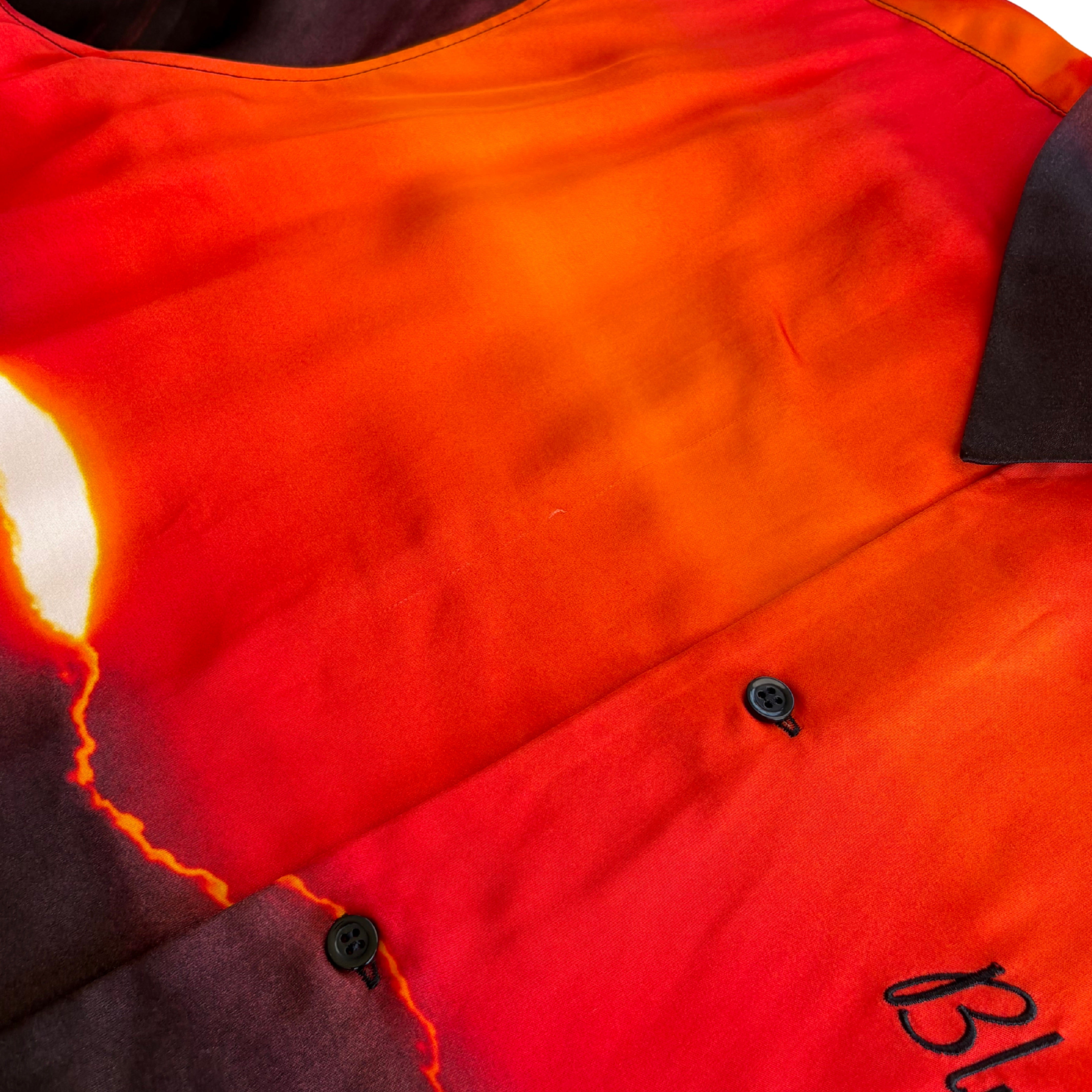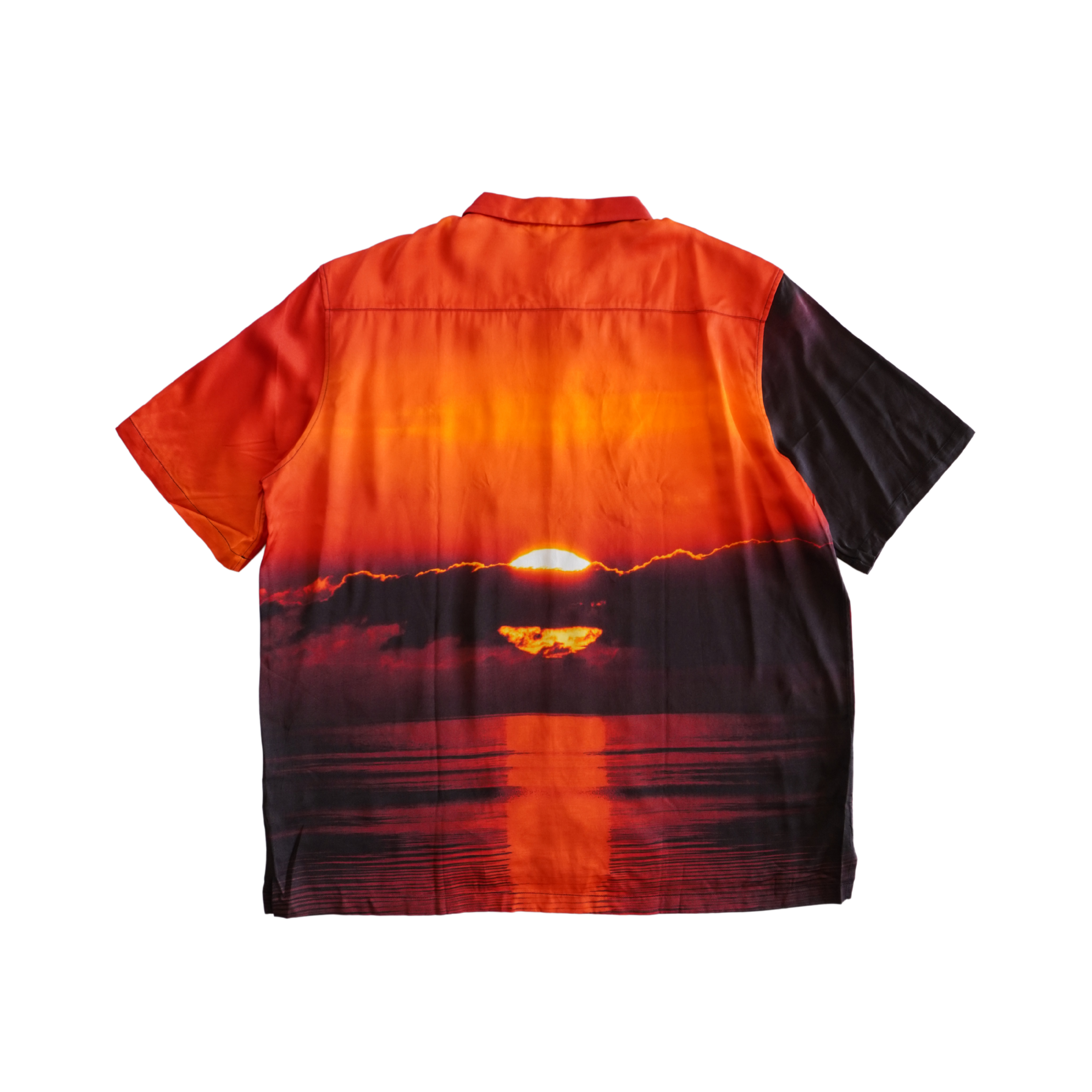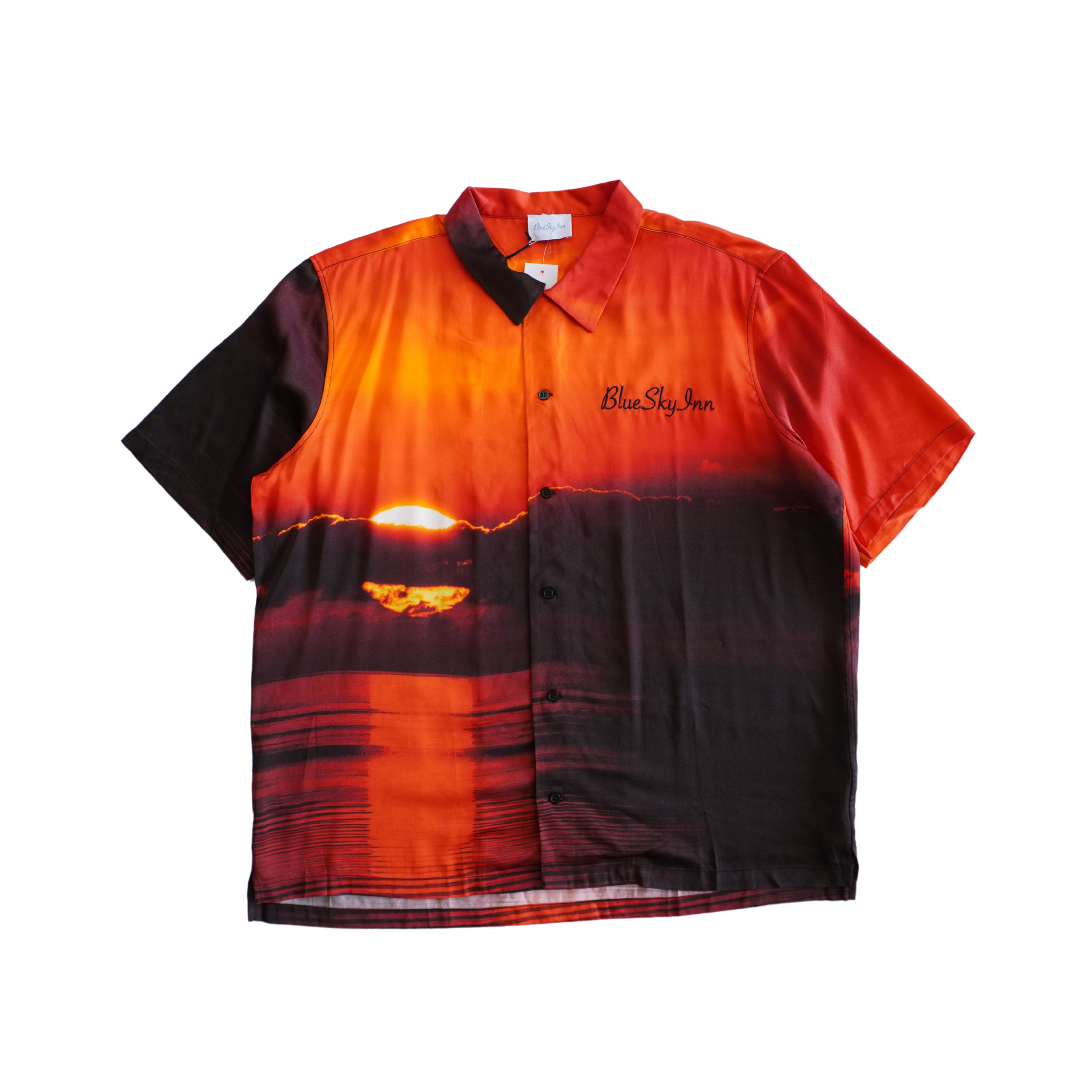 Blue Sky Inn 'Suncloud' button-down shirt in red to black ombre viscose with a large sunset graphic across the chest and back.