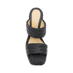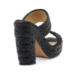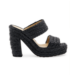 Bottega Veneta ‘120 Platform Sandals’ in black braided raffia with double straps, a structured square toe and a curved block heel.