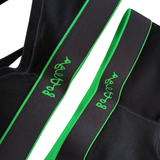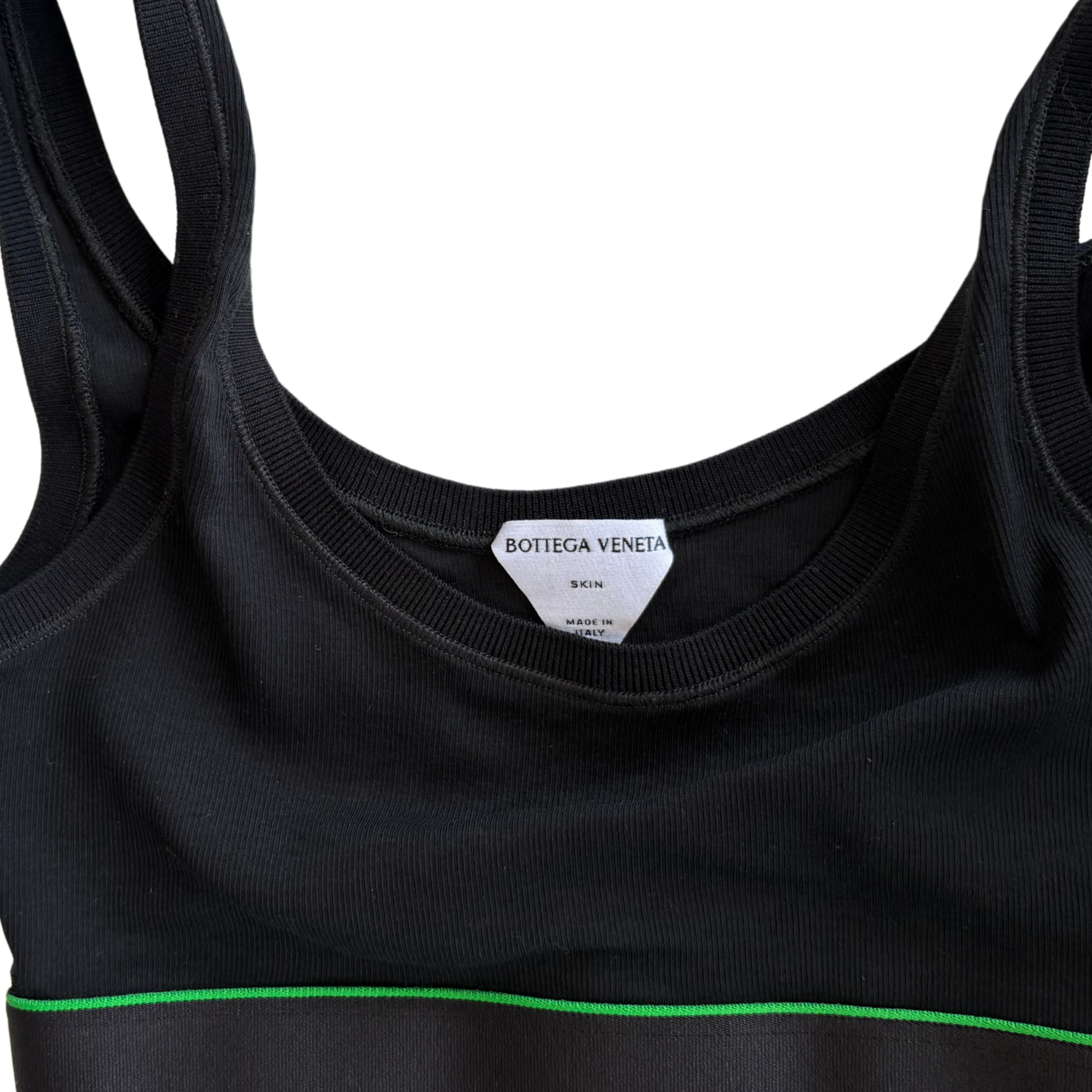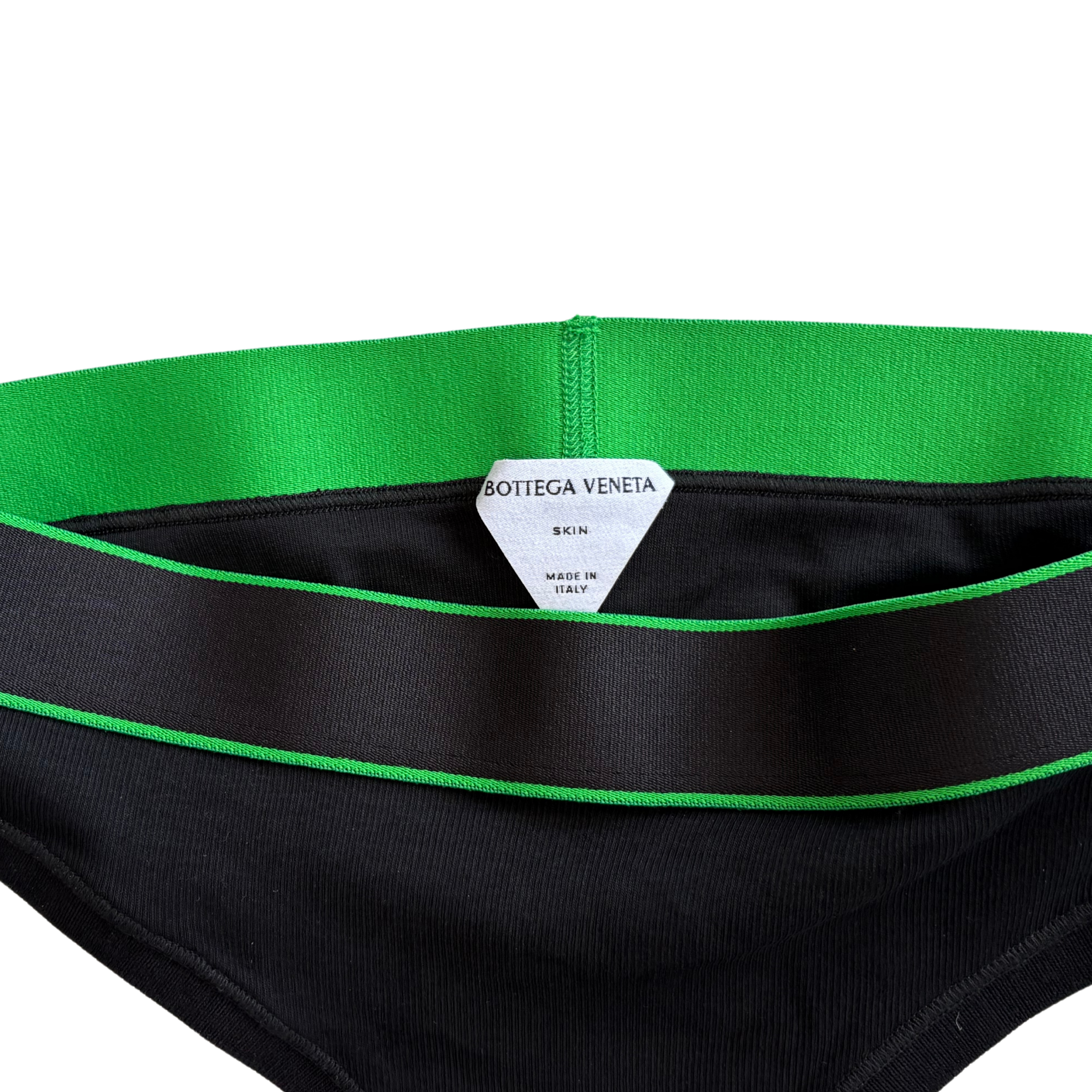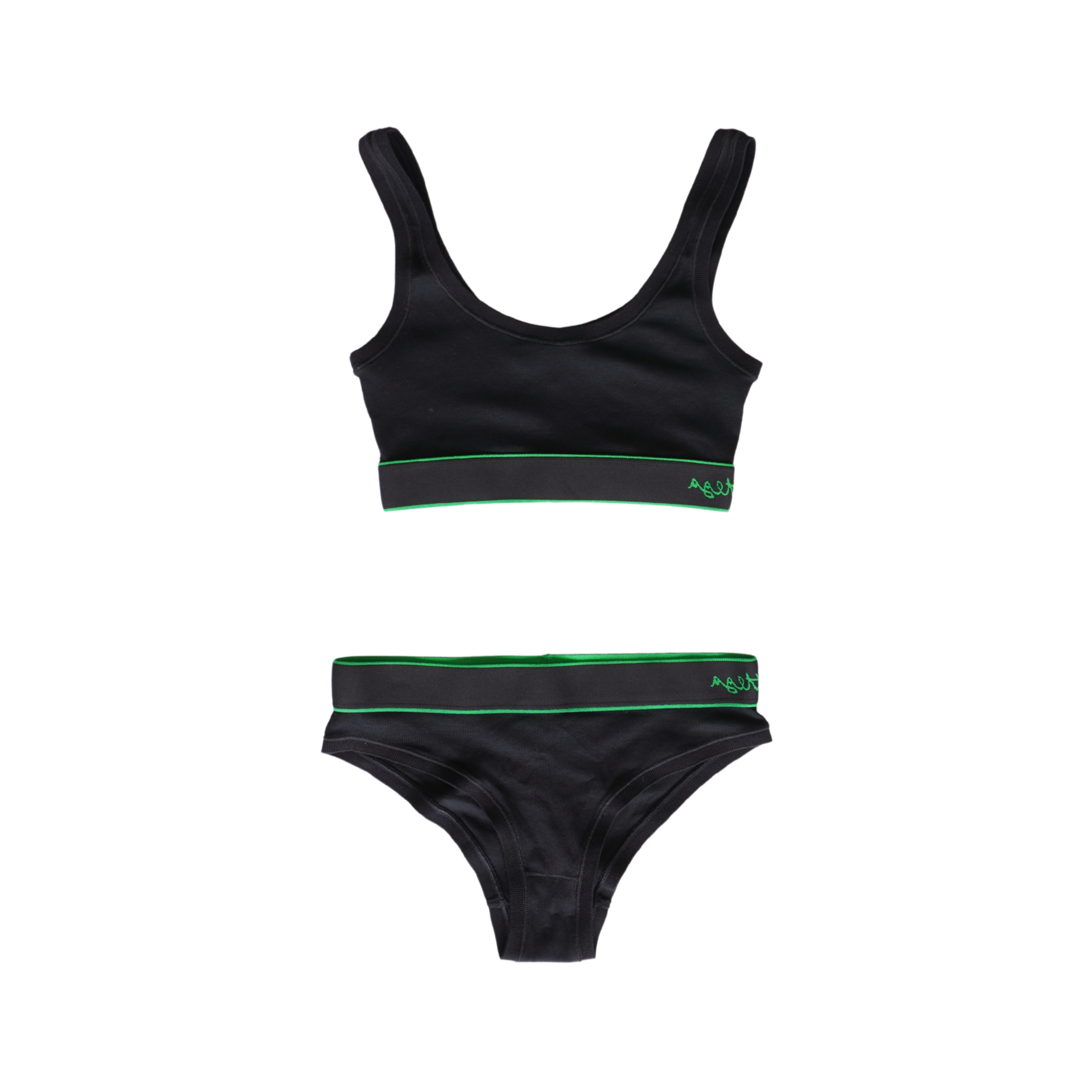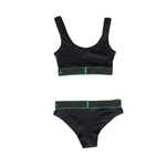 Bottega Veneta 'Skin' matching bralette and briefs set in black ribbed knit cotton with elasticated hems with green trim and cursive logos on the sides.