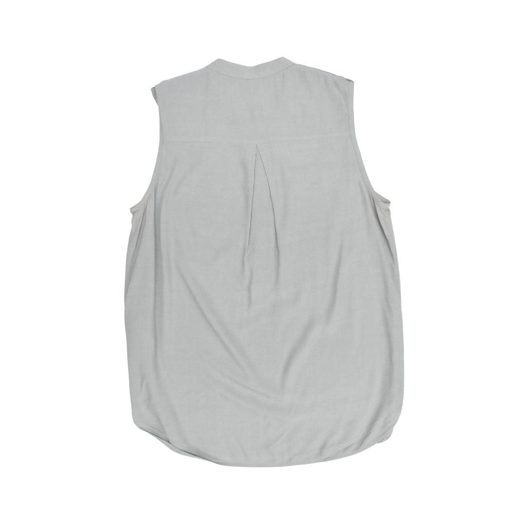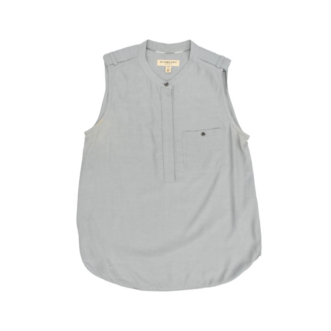 Burberry sleeveless blouse top in a sage green viscose material with a breast pocket and gunmetal button hardware.