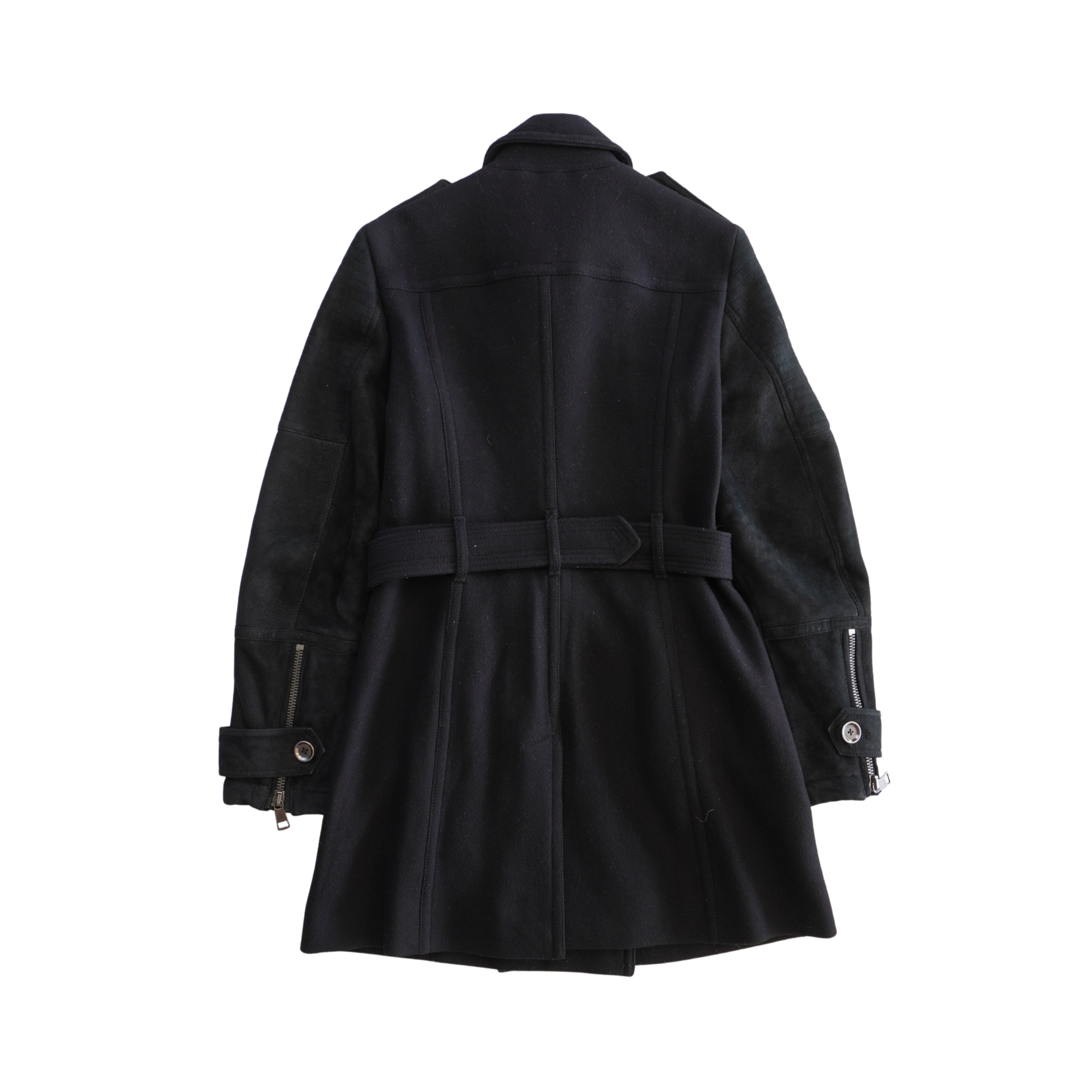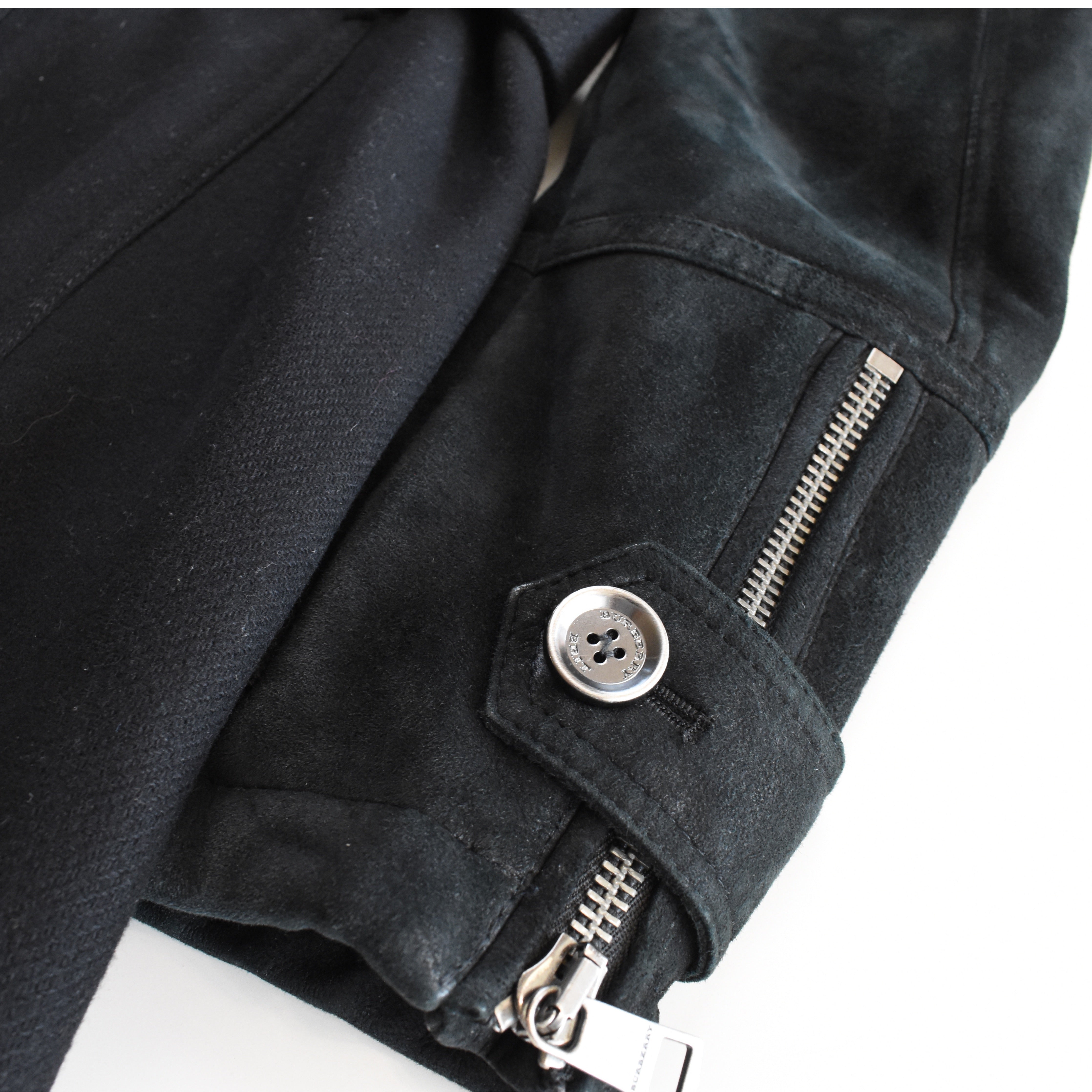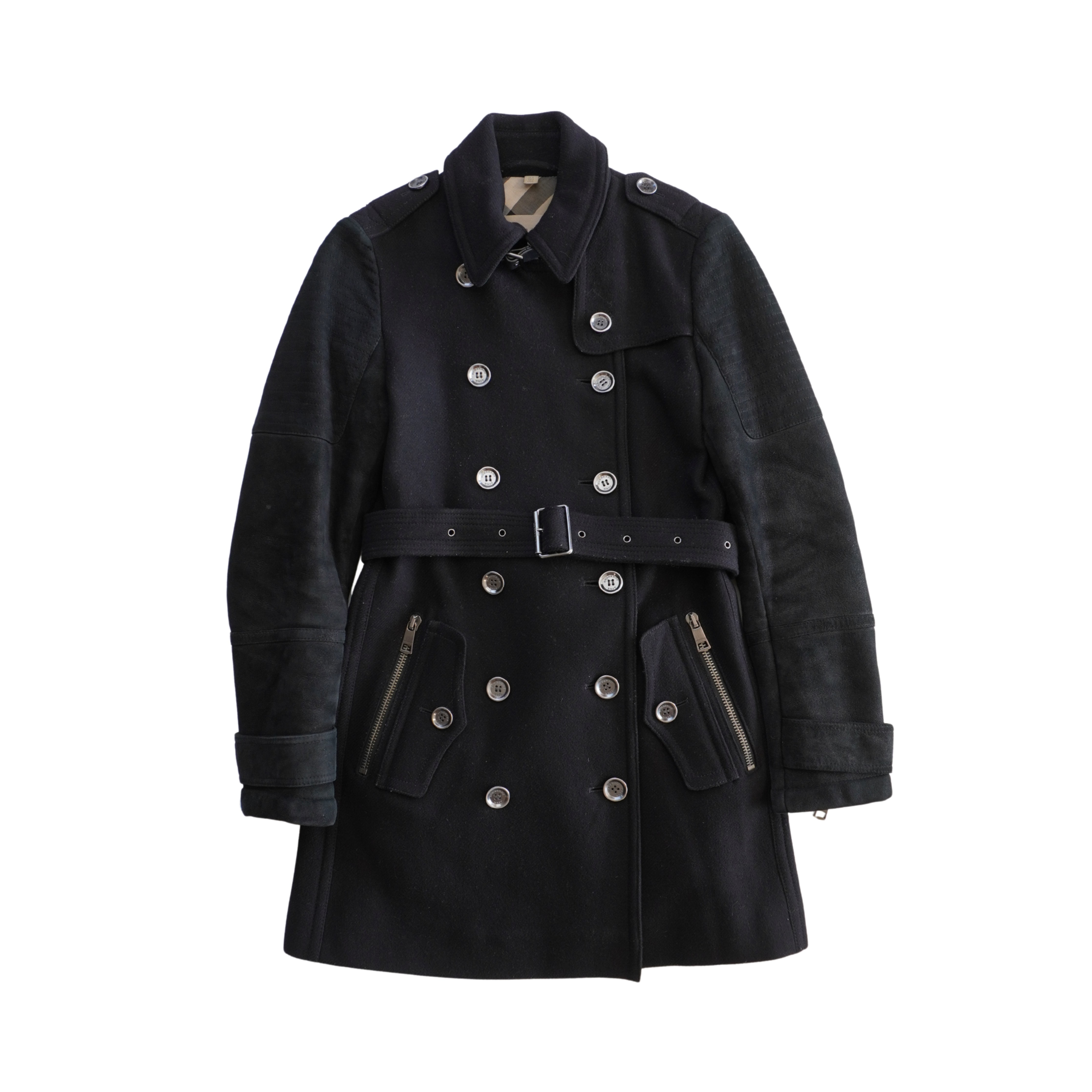 Burberry Brit black wool trench coat with shearling lined nubuck suede sleeves and gunmetal hardware. Features zip and flap pockets at the hips and zip out cuffs with strap detail.