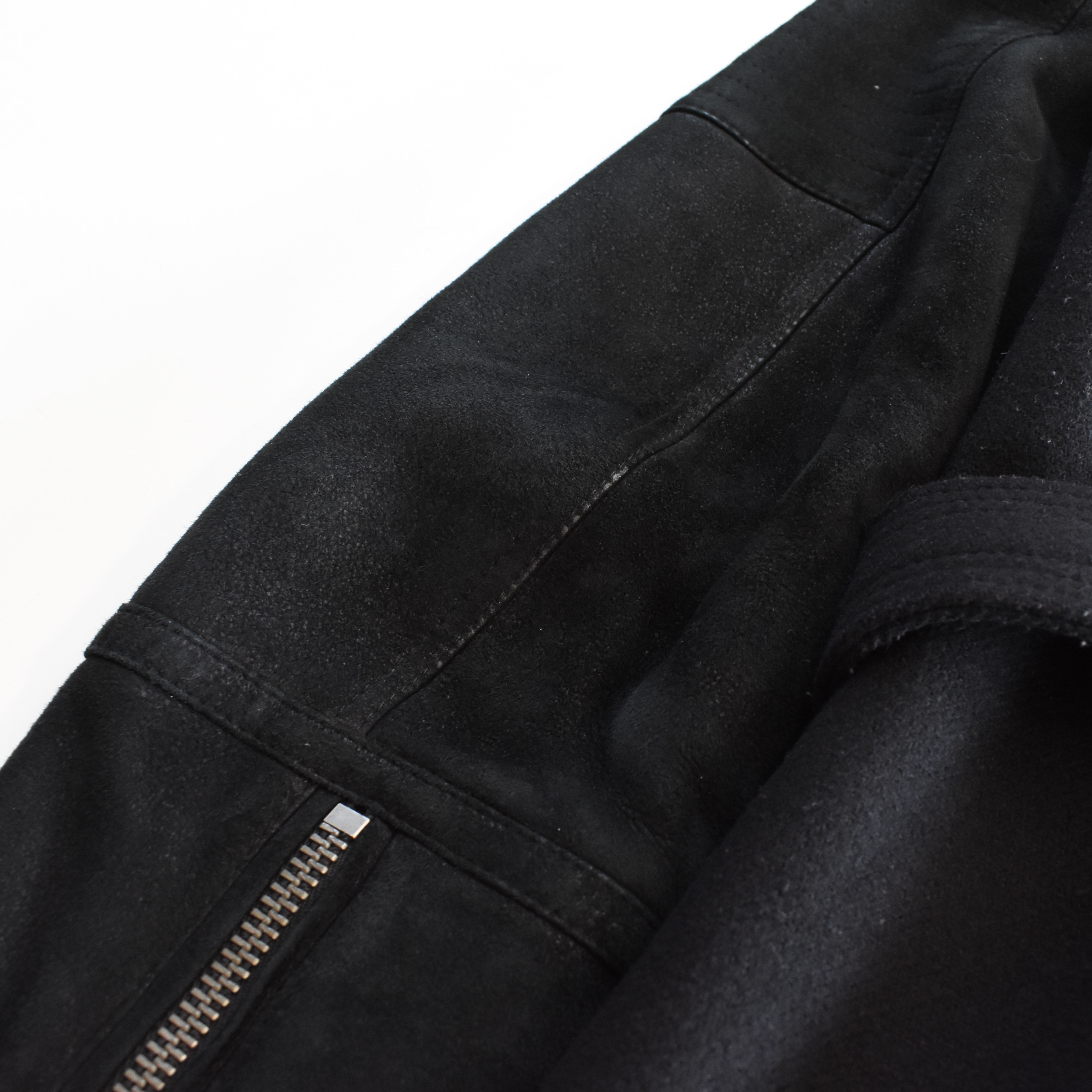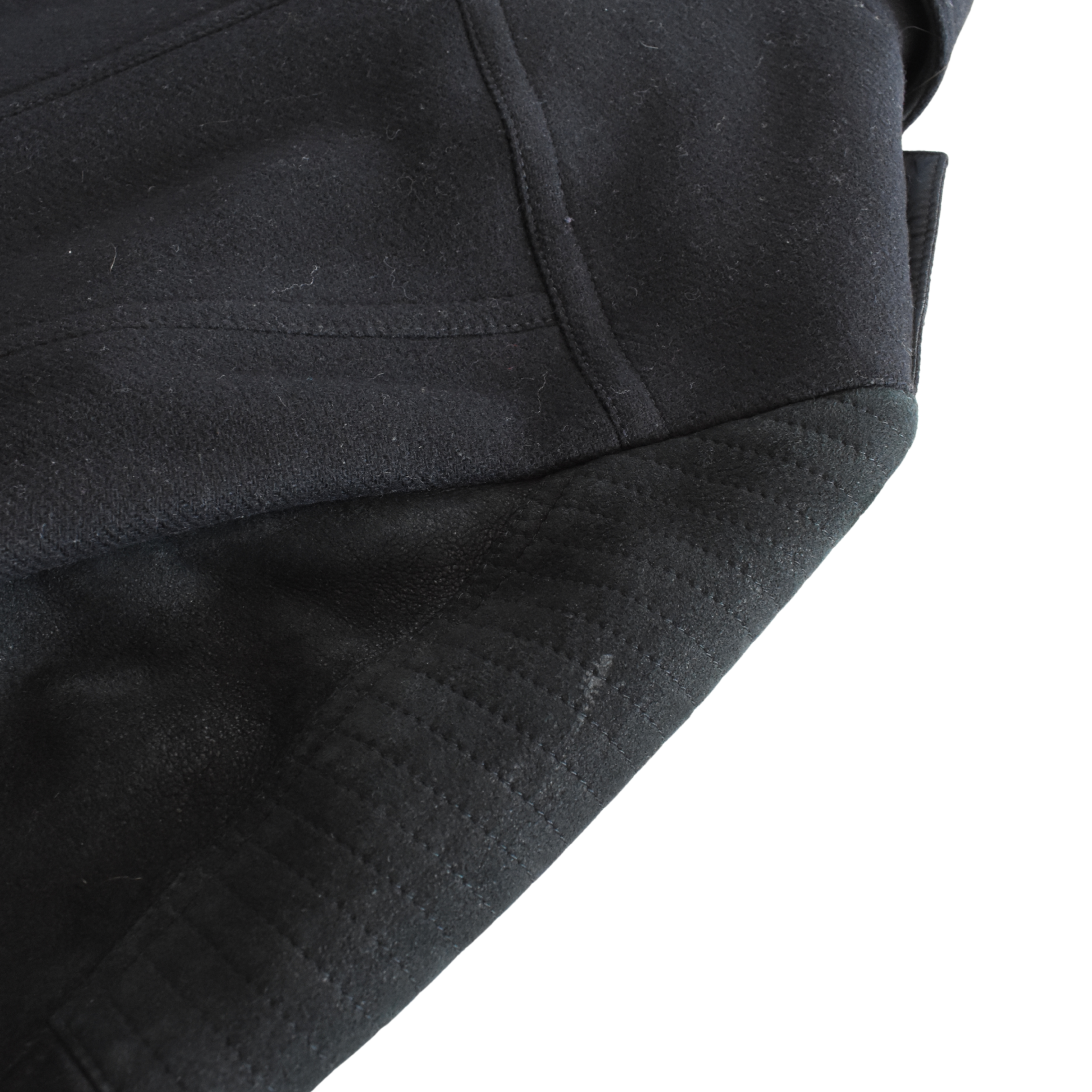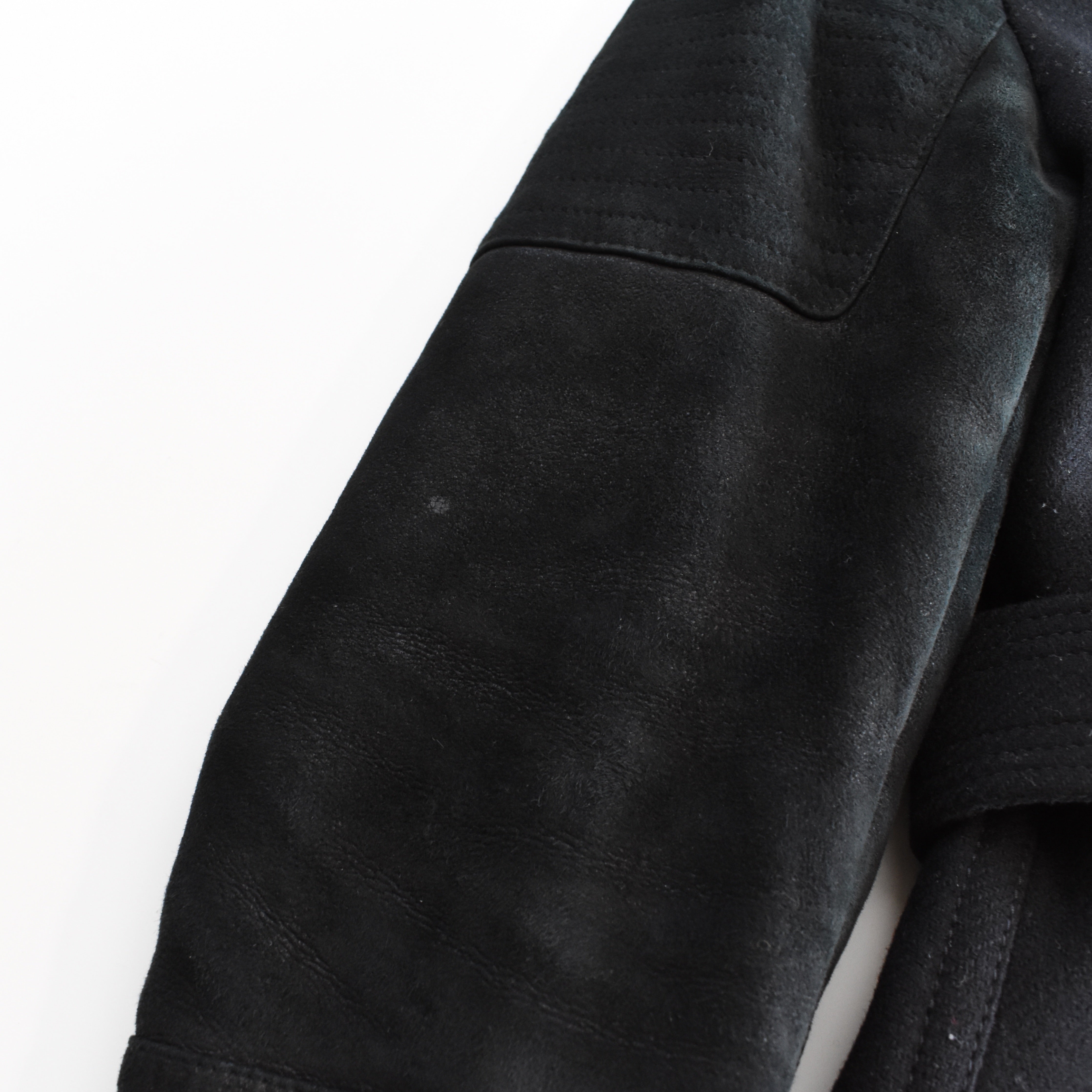 Burberry Brit black wool trench coat with shearling lined nubuck suede sleeves and gunmetal hardware. Features zip and flap pockets at the hips and zip out cuffs with strap detail.