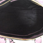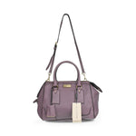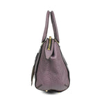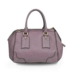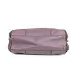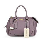Burberry top handle bag in purple tumbled leather with a removable and adjustable shoulder strap. Features two rolled top handles, gold hardware logo on the front, hardware feet on the base, a top zipper closure with an oversized leather zipper pull, and a leather covered lock. The interior is black nylon lined with slip pockets and a zip pocket.