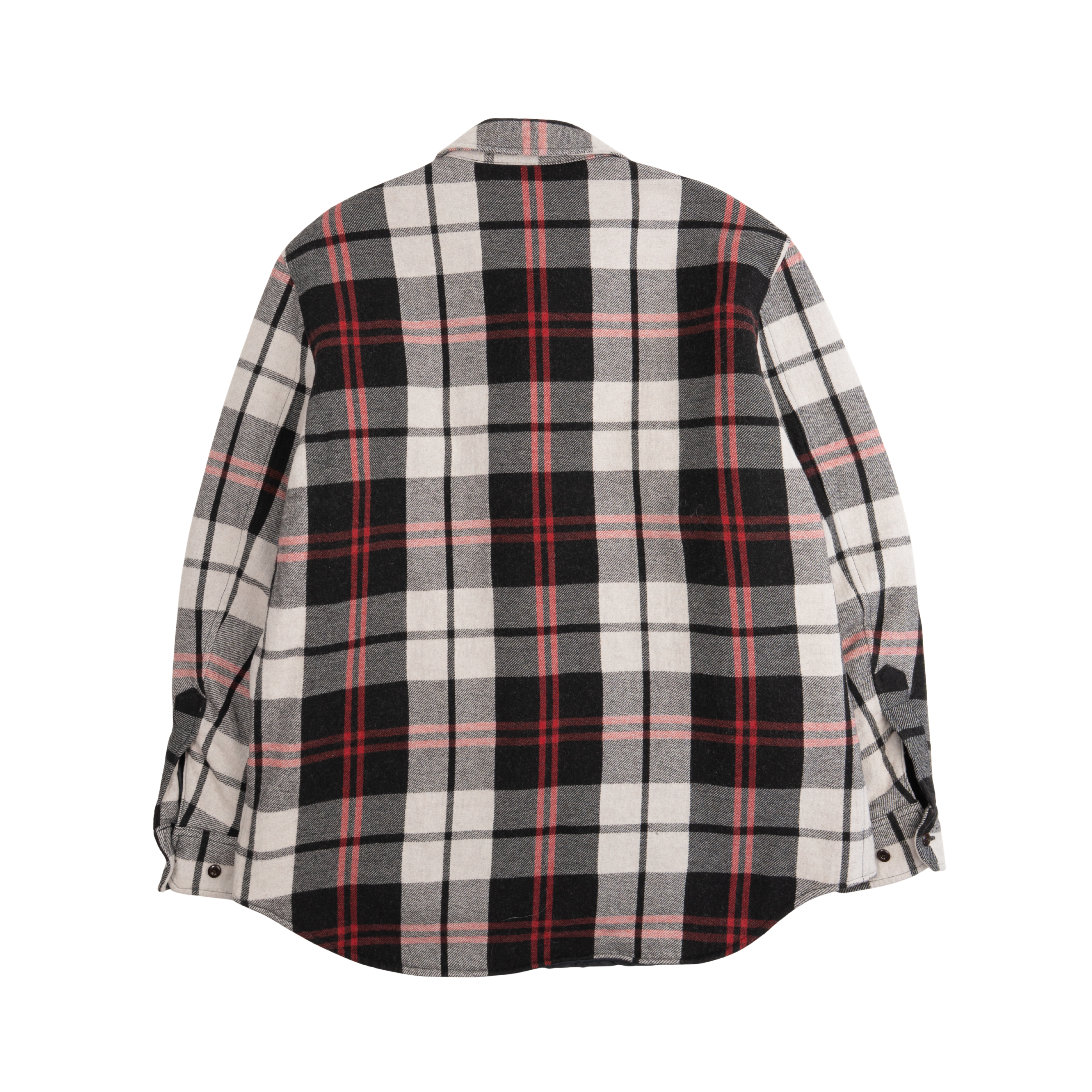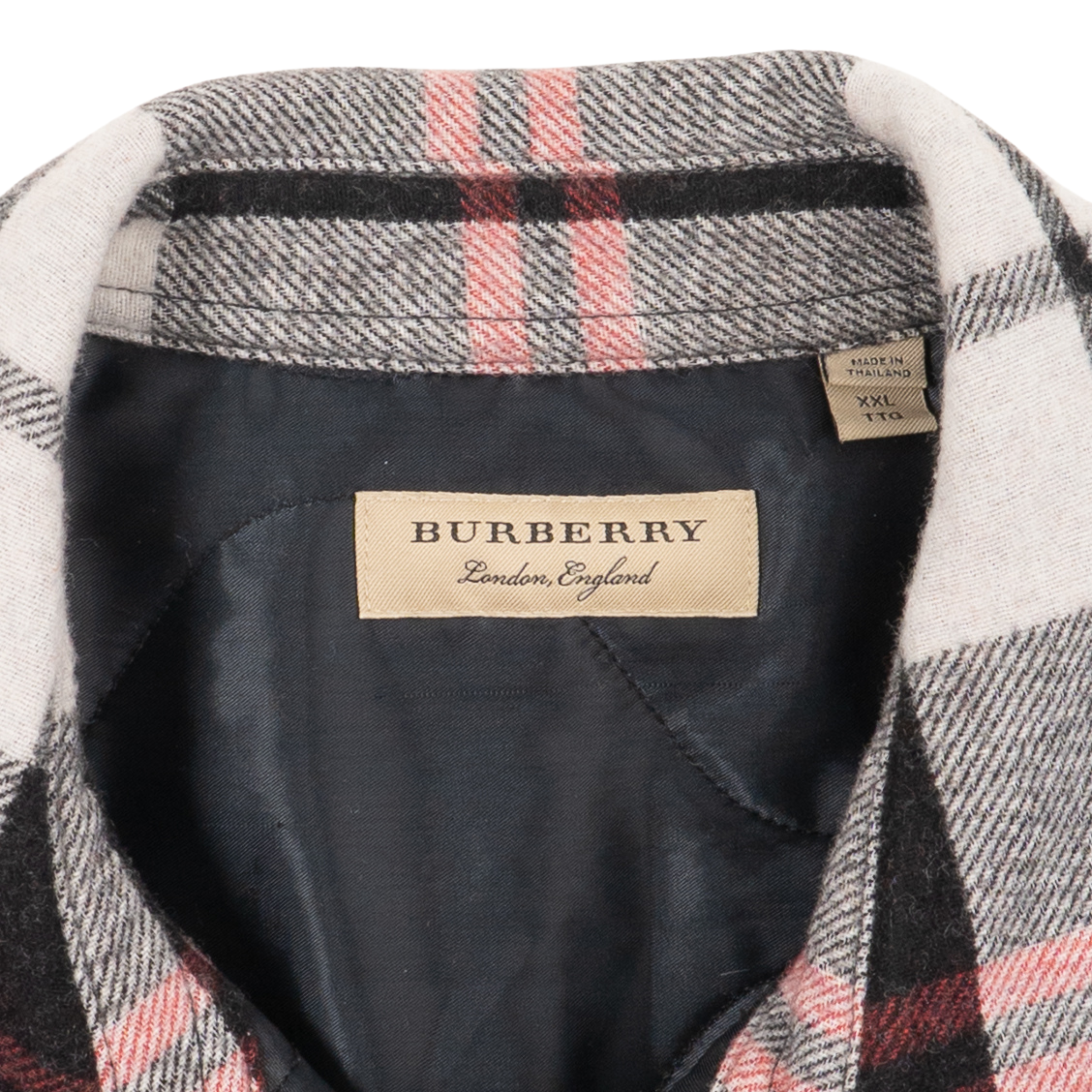 Burberry shacket in black, white and red plaid flannel with two chest pockets and pointed collar.