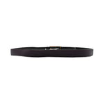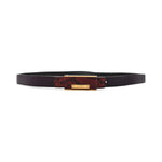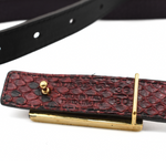 Burberry reversible belt in purple leather with a black alternate side and a red snakeskin buckle with gold metal hardware.