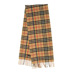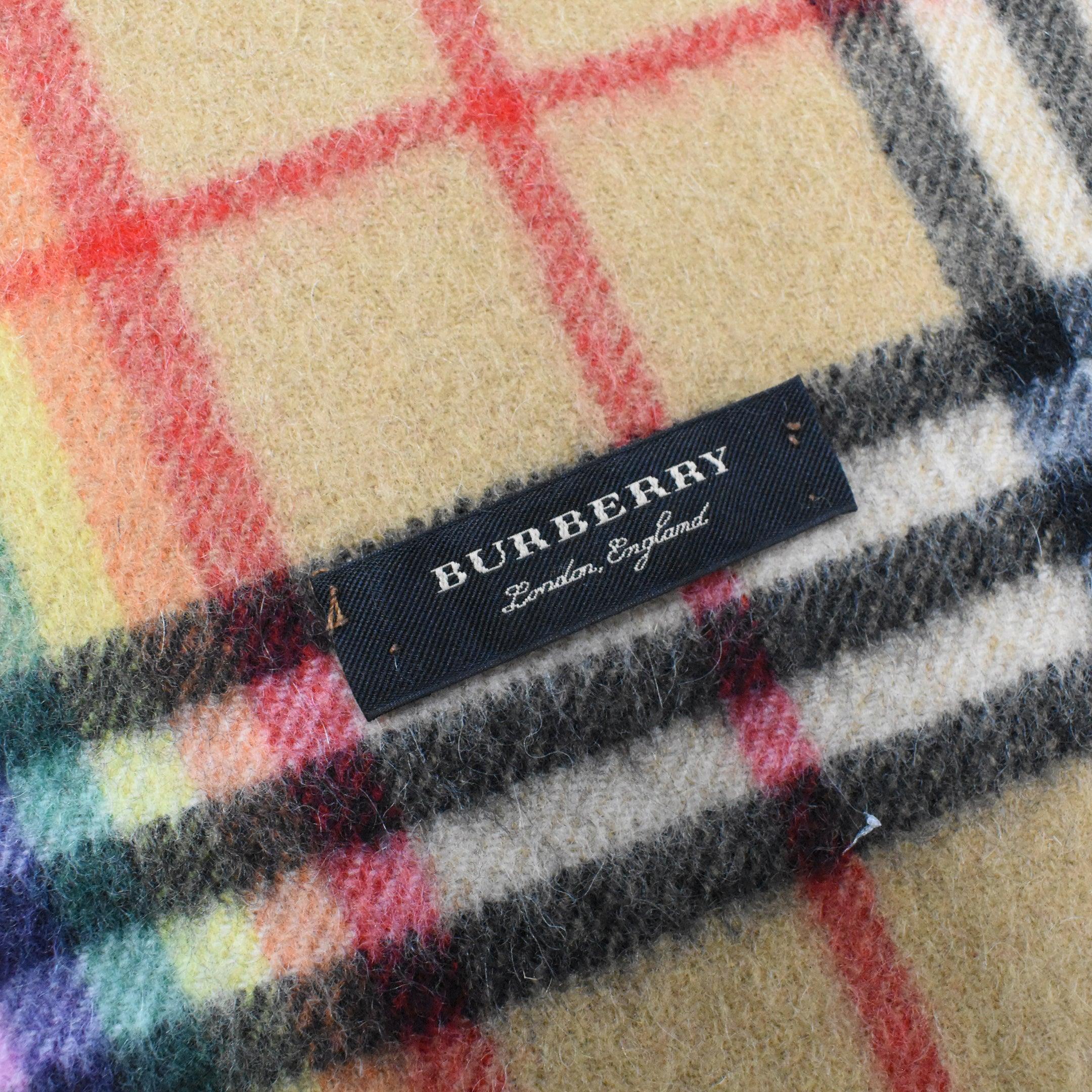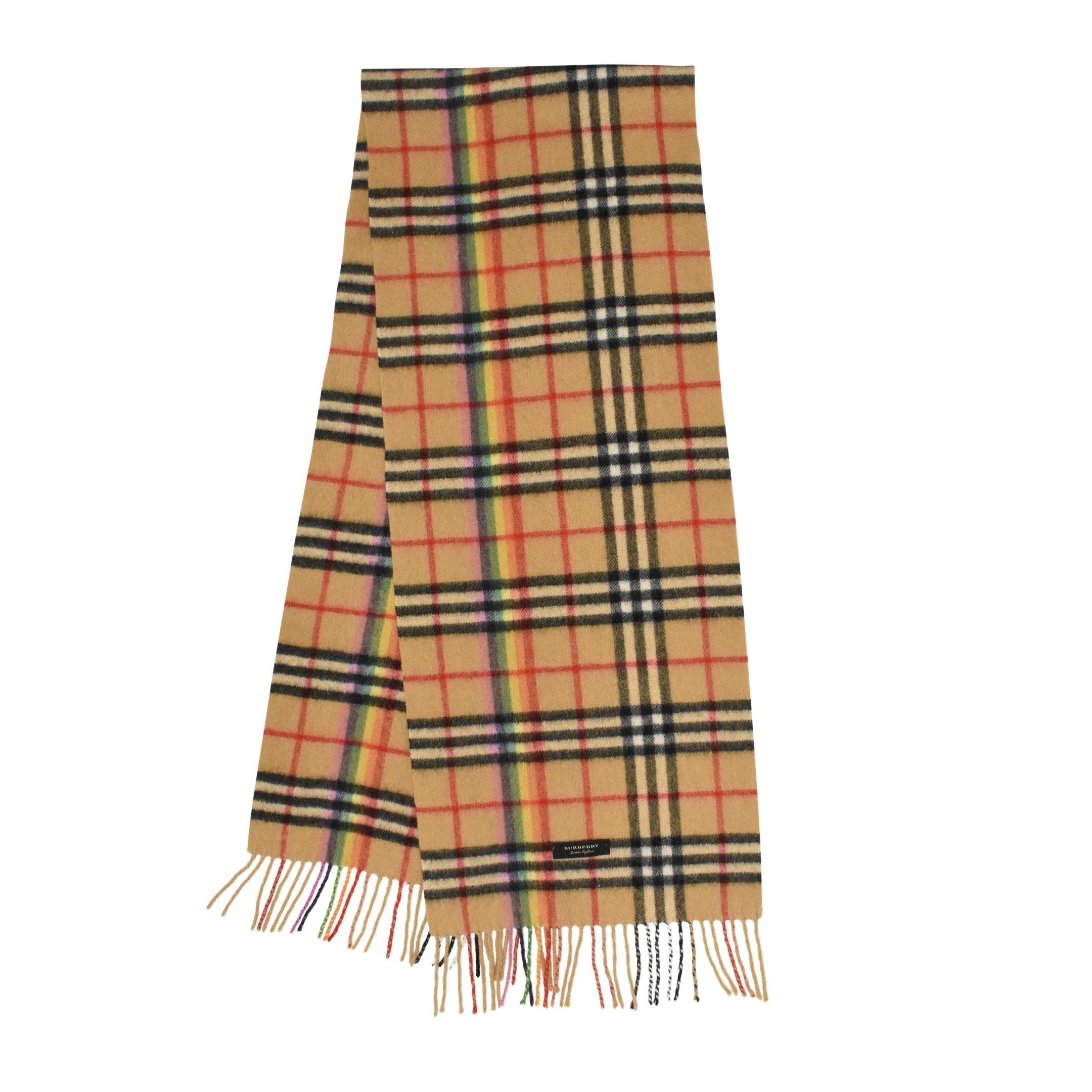 Burberry tan novacheck scarf in a cashmere and wool blend with a rainbow stripe detail down the centre.