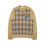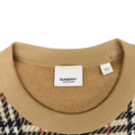 Burberry Crewneck Sweater in tan cotton with a nova check wool front panel and a TB embroidered logo in orange and blue thread. Features ribbed cuffs.