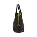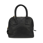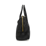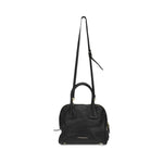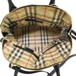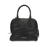 Burberry top handle bag in black tumbled leather with two rolled top handles and a rounded top double-zip closure. Features gold hardware, gold hardware logo on the front, a removeable and adjustable long strap, and metal feet on the bottom. The interior is beige novacheck canvas lined with two slip pockets and a zip pocket.