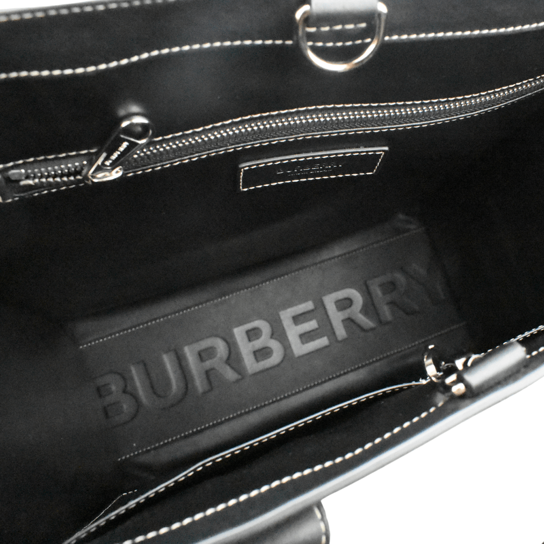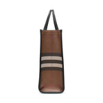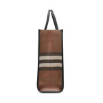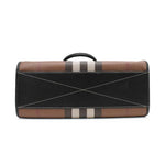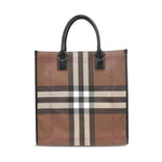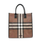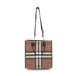 Burberry 'Denny' rectangular tote bag in brown novacheck coated canvas. Features black leather trim, silver hardware, a lobster clasp closure, removable and adjustable crossbody canvas strap, and logo in black hardware on the front.