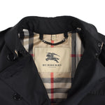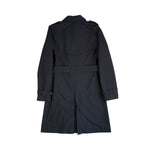 Burberry trench coat in dark navy nylon with a double-breasted button-down closure, side pockets with button closure, and nova check lining on the collar. Features a belted waistband.