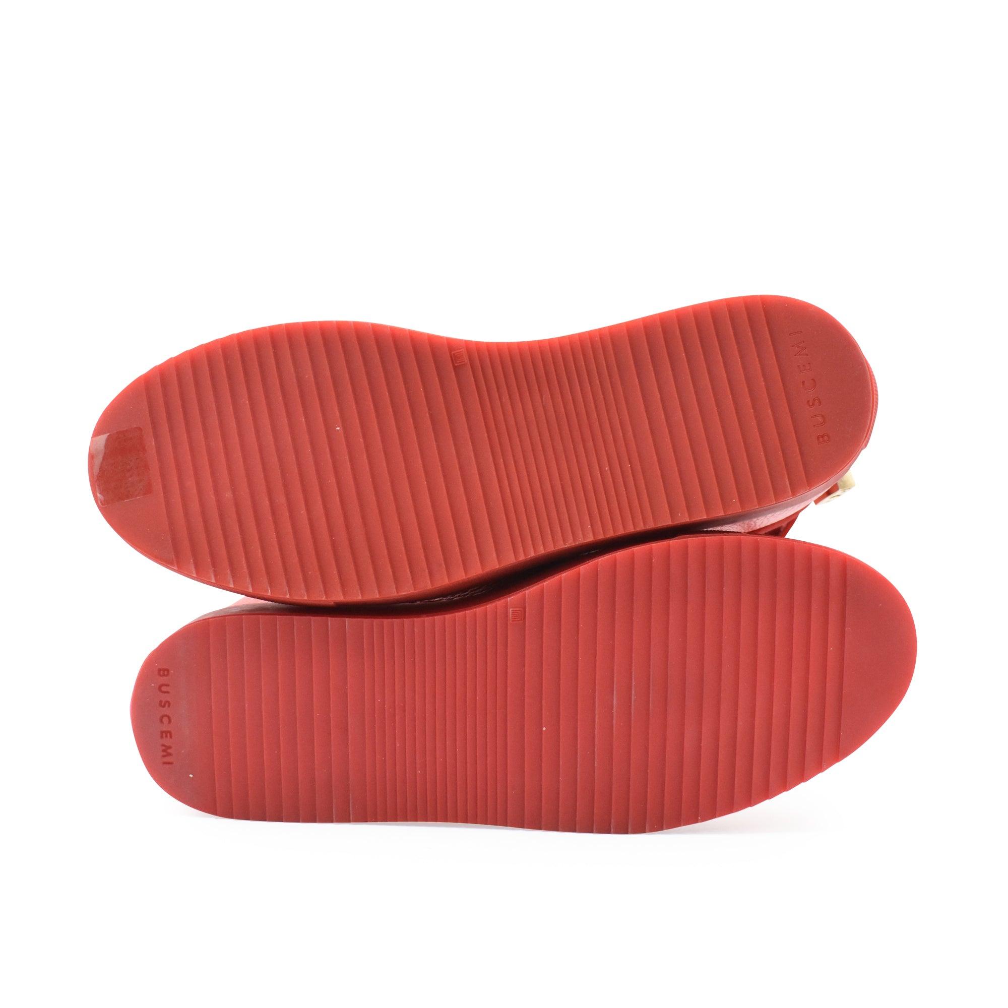 Buscemi high-top wedge sneakers in red grained leather with an embossed logo to the side, logo-embossed tongue and a padlock detail front clasp fastening in gold-tone hardware.