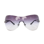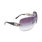 Bvlgari frameless shield sunglasses with purple ombre lenses with crystal details on the sides of lenses and the arms. Features silver logos on the arms, small spinning cylindrical details in the arms, and rubber nose pads.