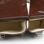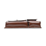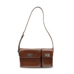 By Far 'Billy' shoulder bag in brown patent leather. Features a double pockets on the front with turn lock closures in silver hardware and an adjustable shoulder strap.
