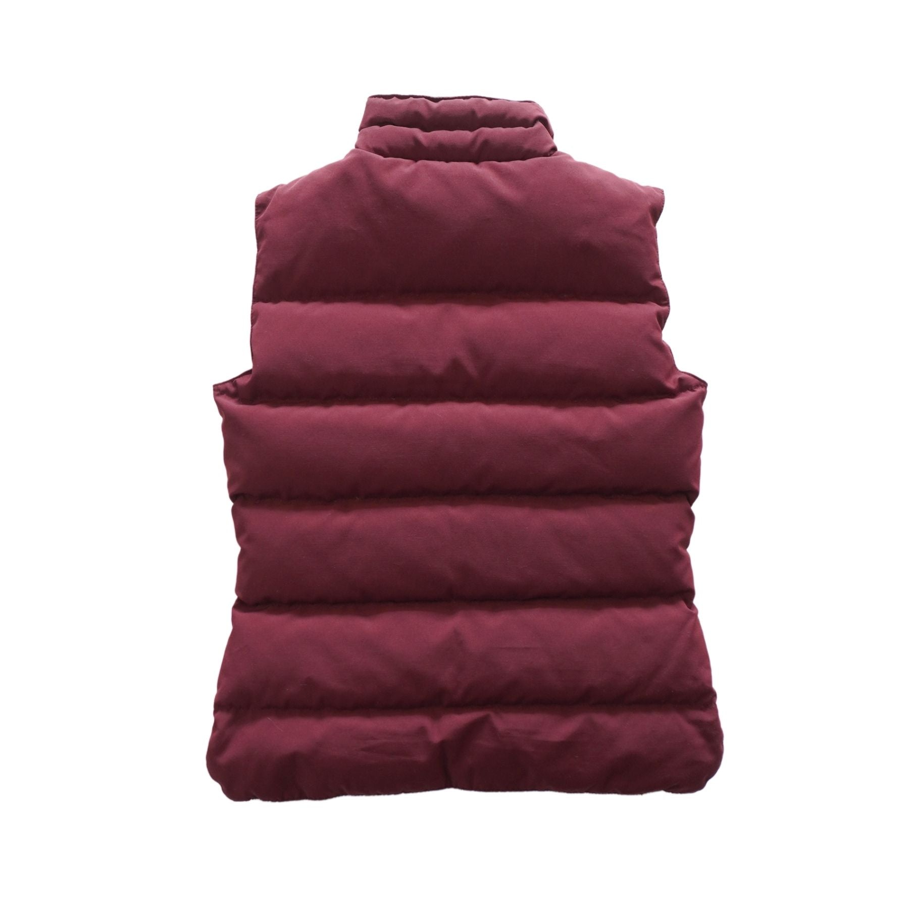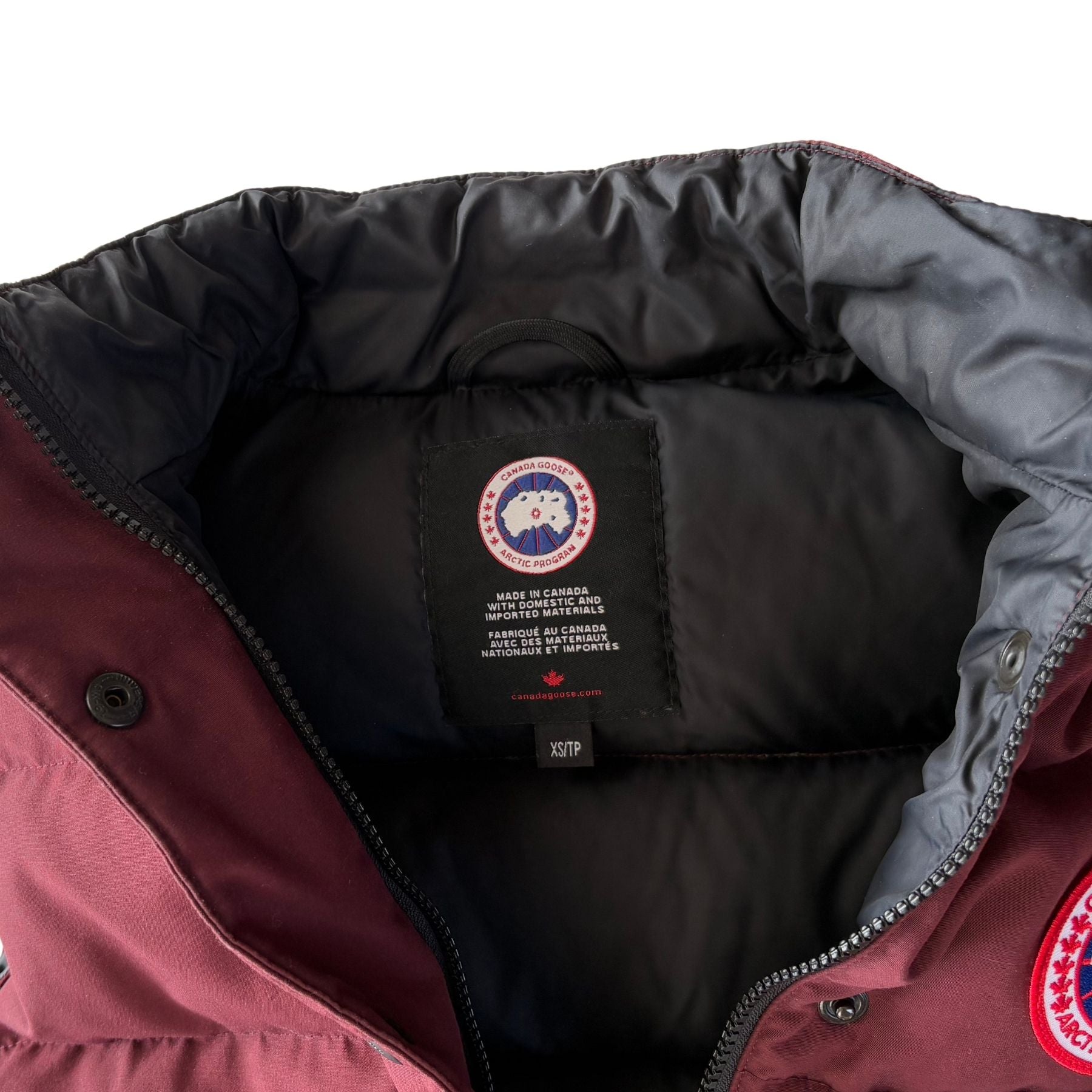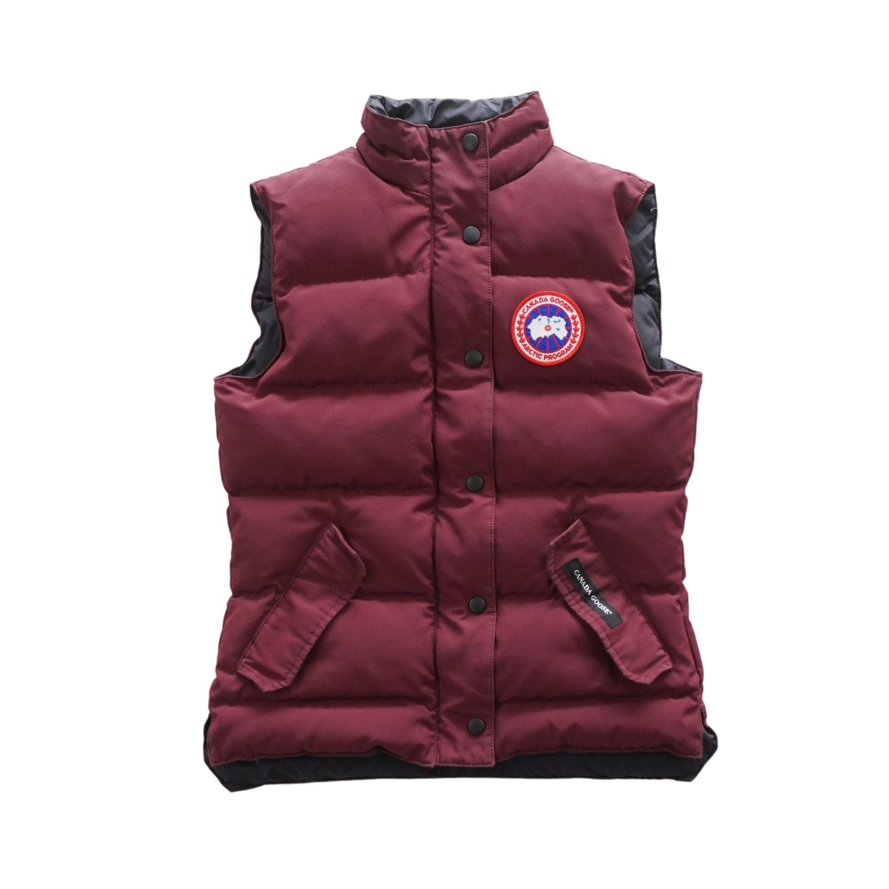 Canada Goose 'Freestyle' puffer vest in 'Elderberry' burgundy red with a zipper and snap-button closure. Features front snap-button pockets, a logo patch on the chest, and black nylon interior lining.