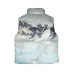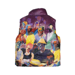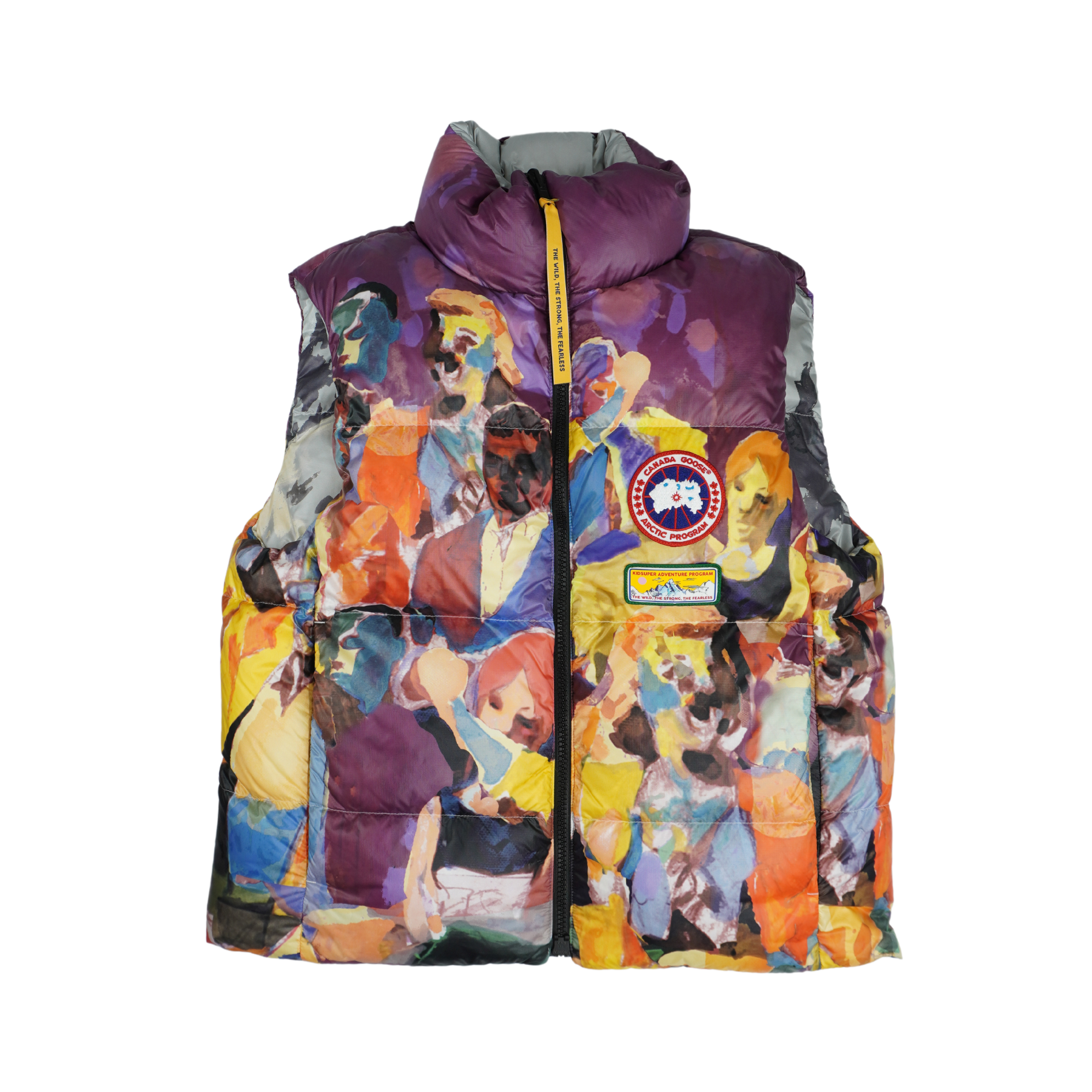 Canada Goose x NBA x KidSuper reversible puffer vest with one blue and grey abstract painted side and a reverse purple face print side. Features black zip hardware with a large yellow zipper pull, side pockets, and a large collar.