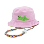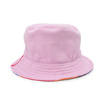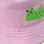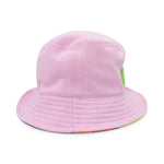 Canada Goose x Paola Pivi bucket hat in light pink cotton with green terry cloth bear, pink and white logo patch, and multicolour nylon lining. Features multicolour cord with white plastic drawstring adjuster.