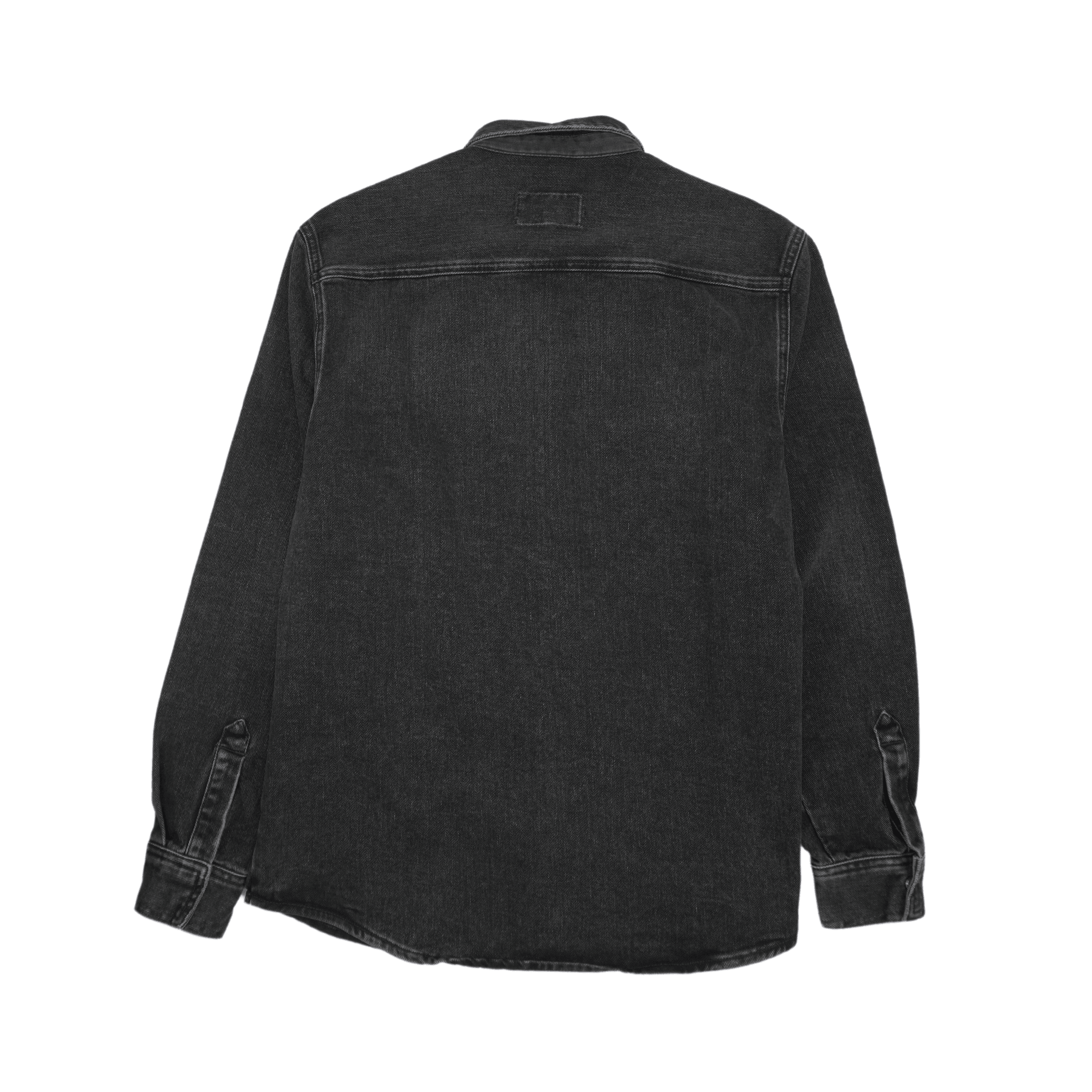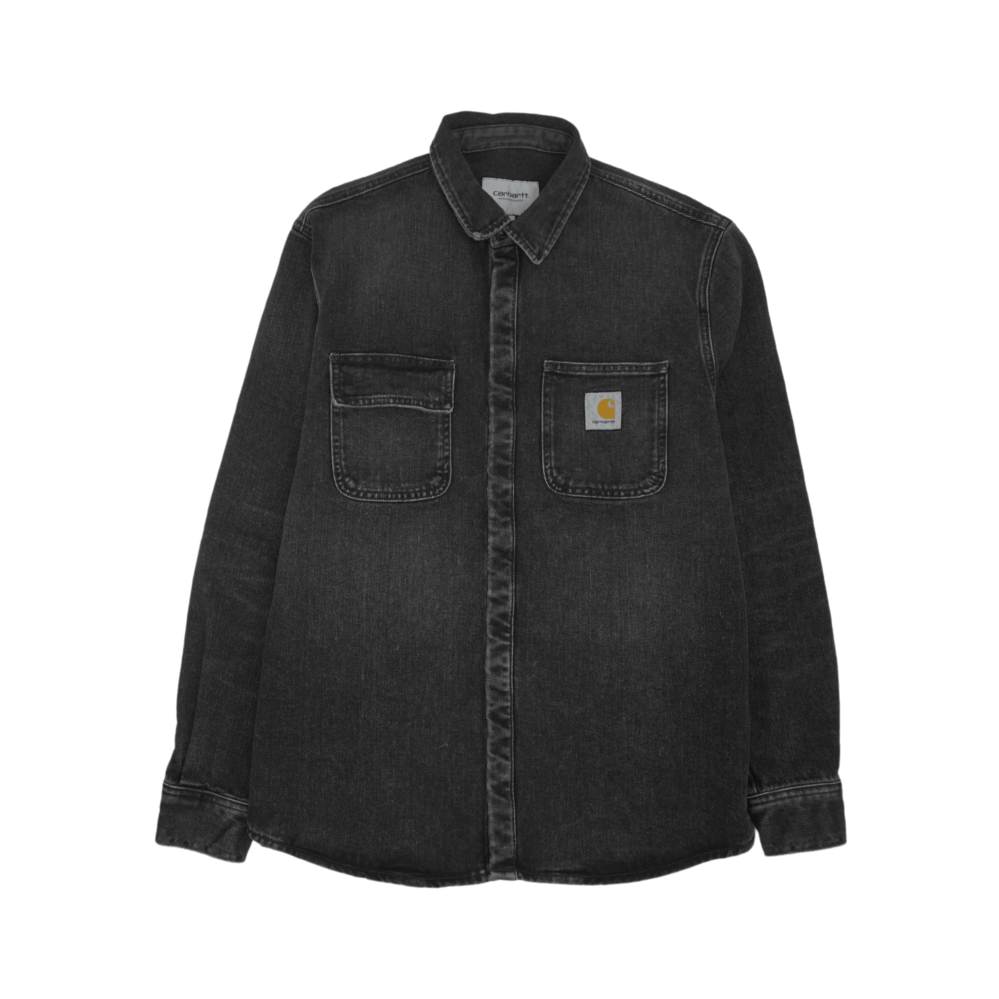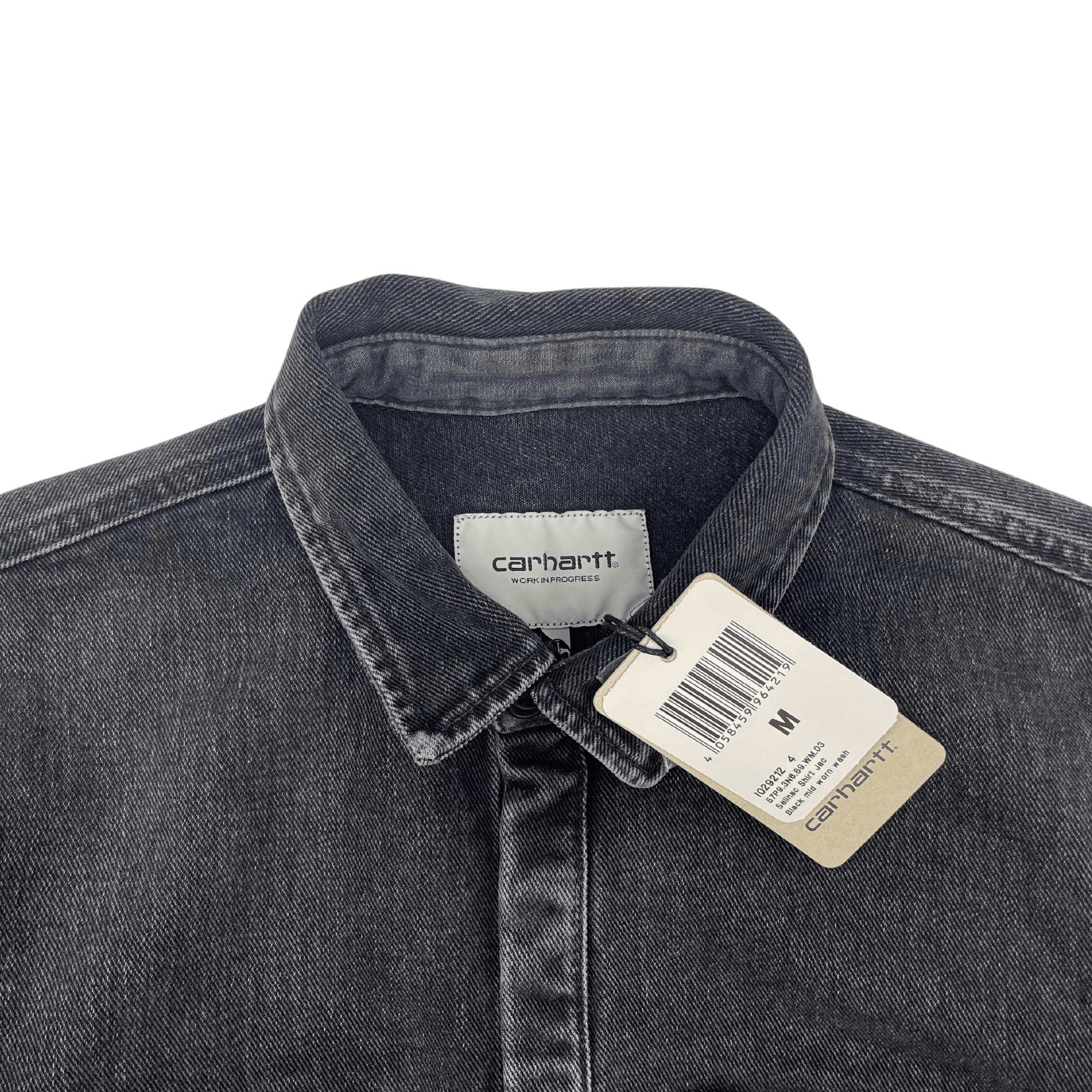 Carhartt Work In Progress 'Salinac' shirt jacket in black denim with front pockets, silver snap button hardware, and a small logo patch on the chest.