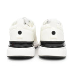 Chanel white leather and mesh low-top sneakers from the 2022 cruise collection. Feature black suede 'CC' logo patches on the sides and black plastic details around the heel.