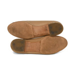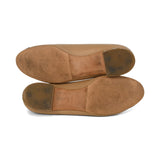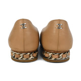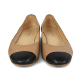 Chanel ballet flats in beige leather with a black toe cap, a small silver 'CC' emblem on the back heel, and a short heel with chain trim.