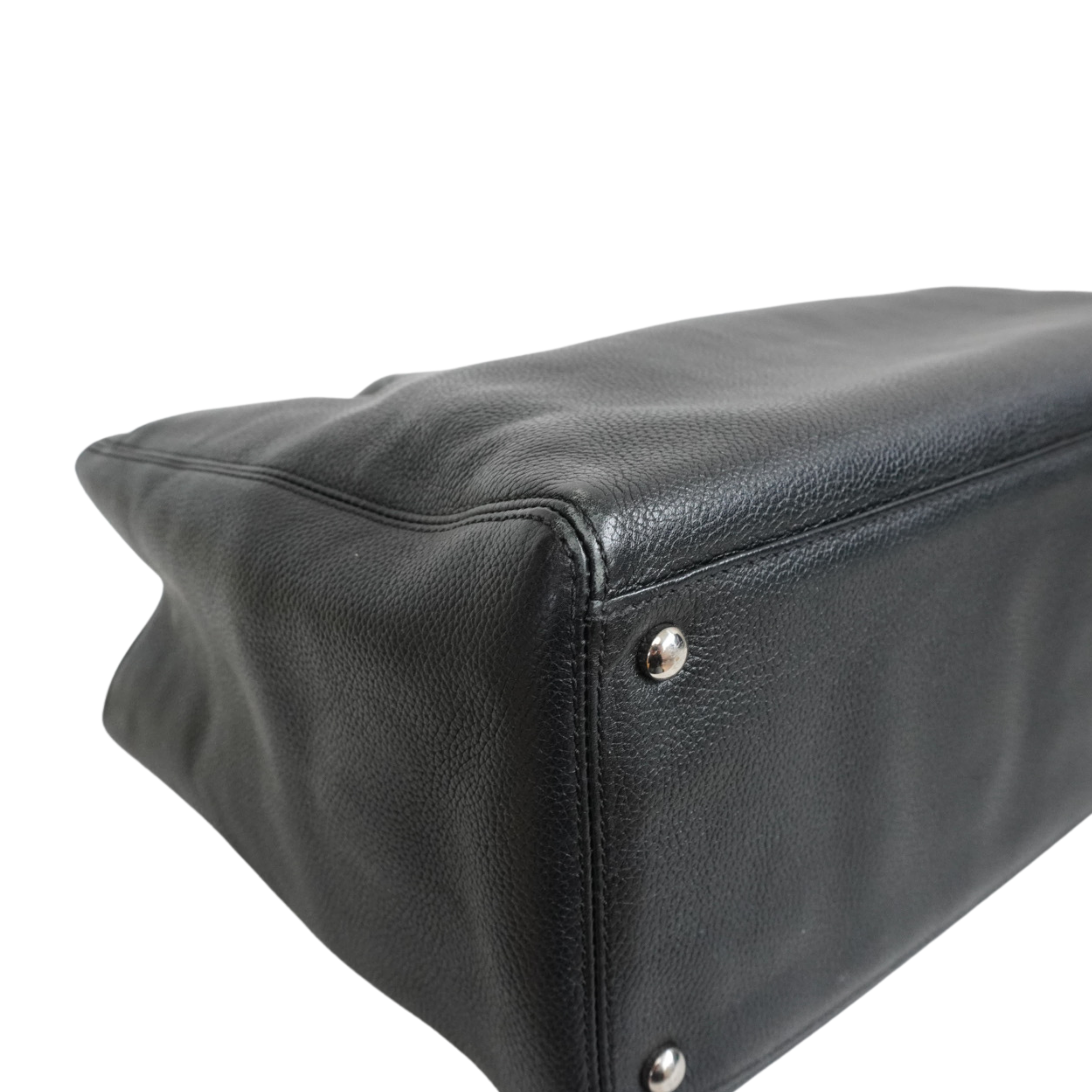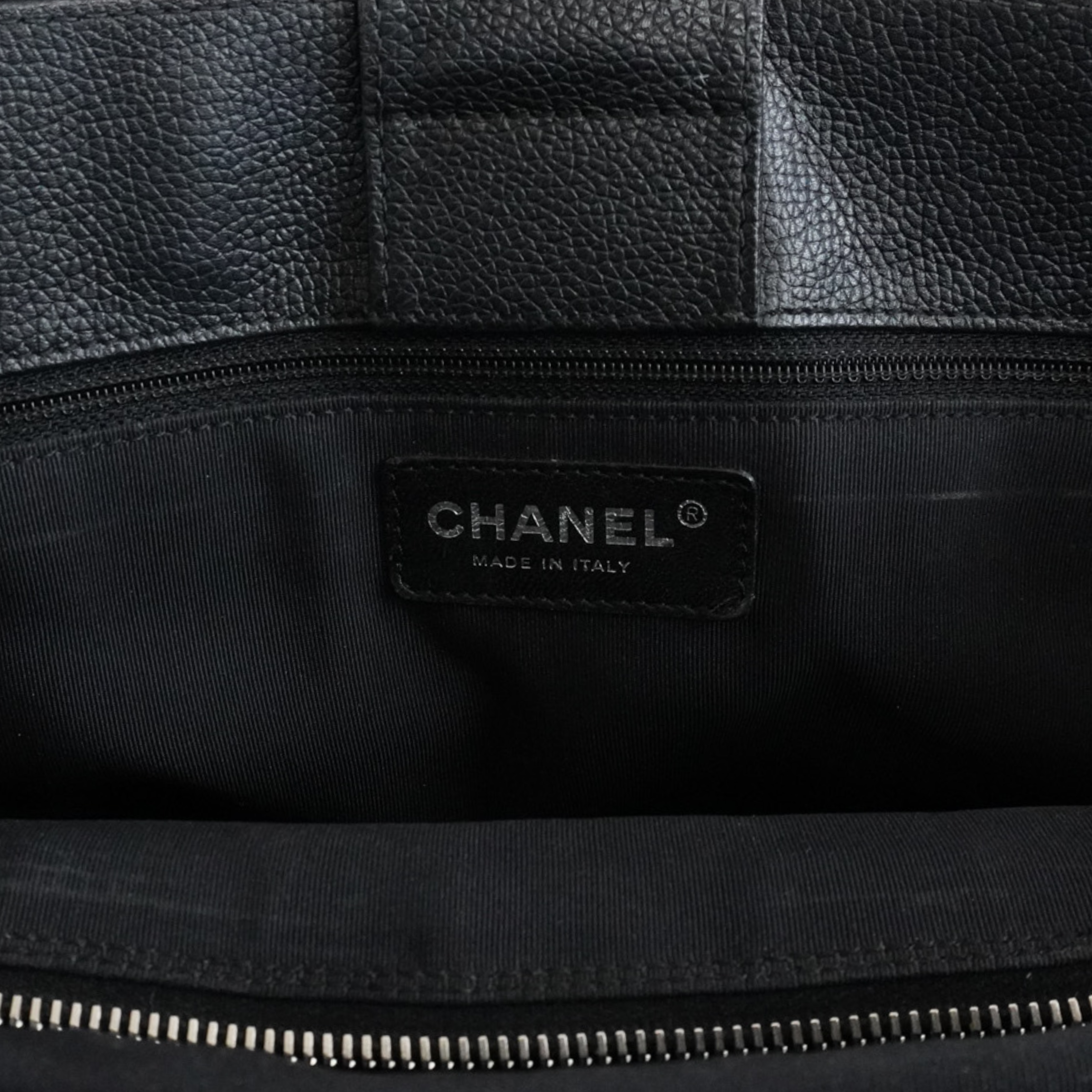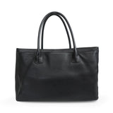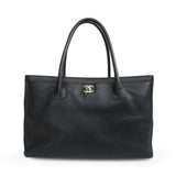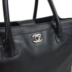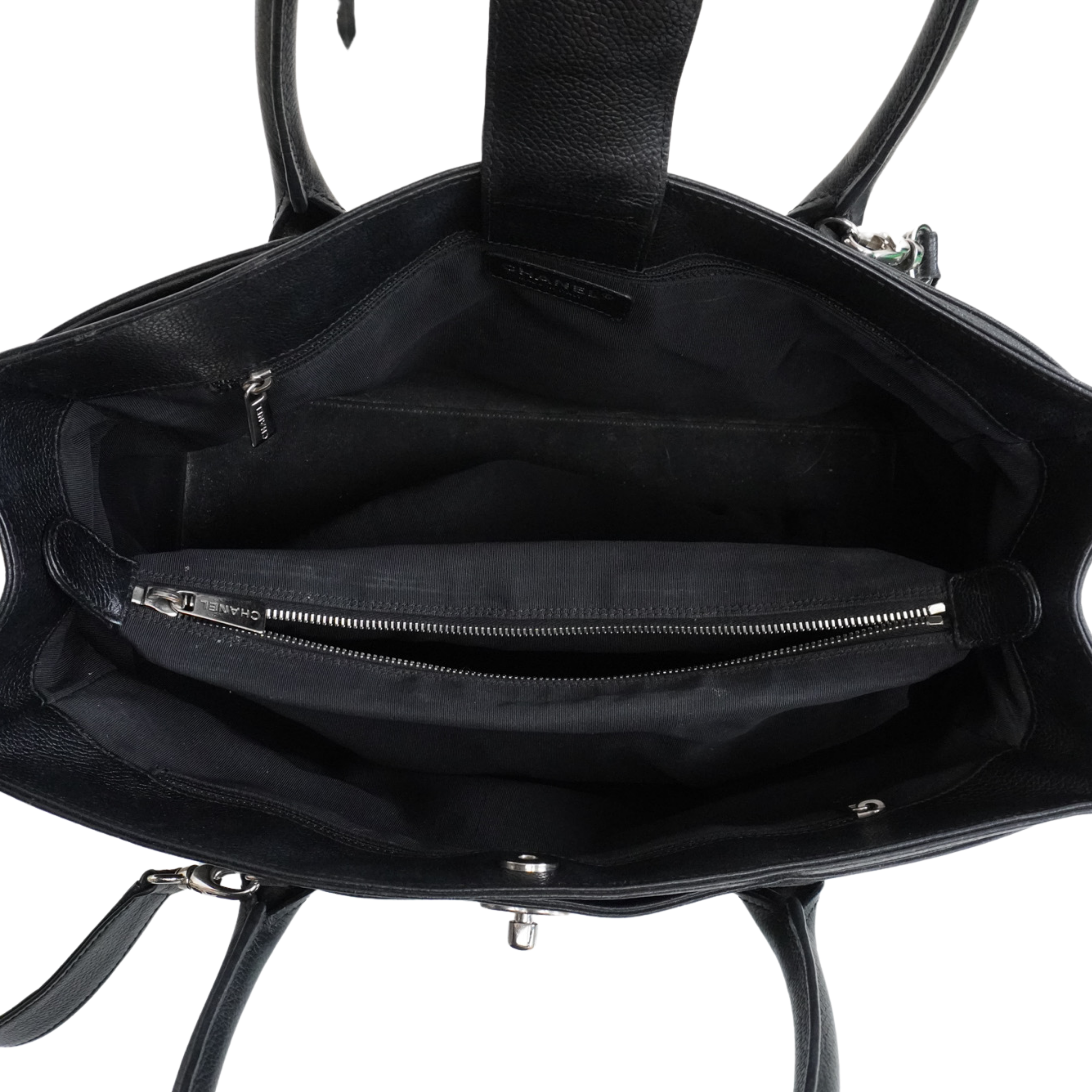 Chanel 'Executive' tote bag in black grained leather with silver hardware including a CC turnlock detail. Features a main grosgrain lined open pocket with removable zip pouch divider in the centre and two flat zip pockets on the sides. There are two exterior slip pockets, the front one can be closed with the CC turnlock.