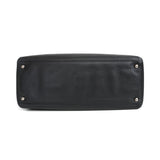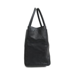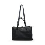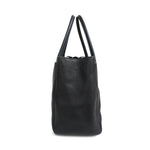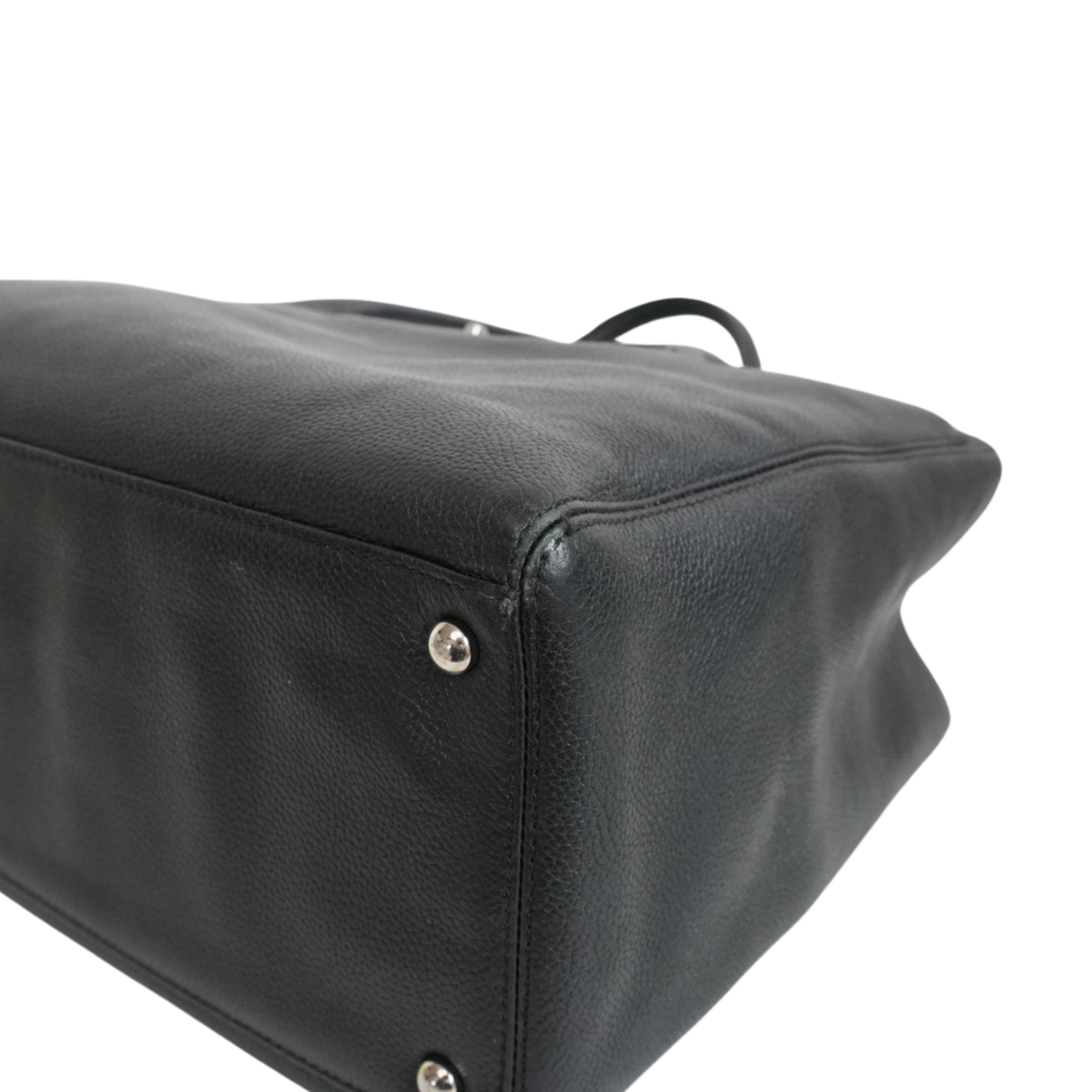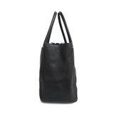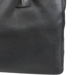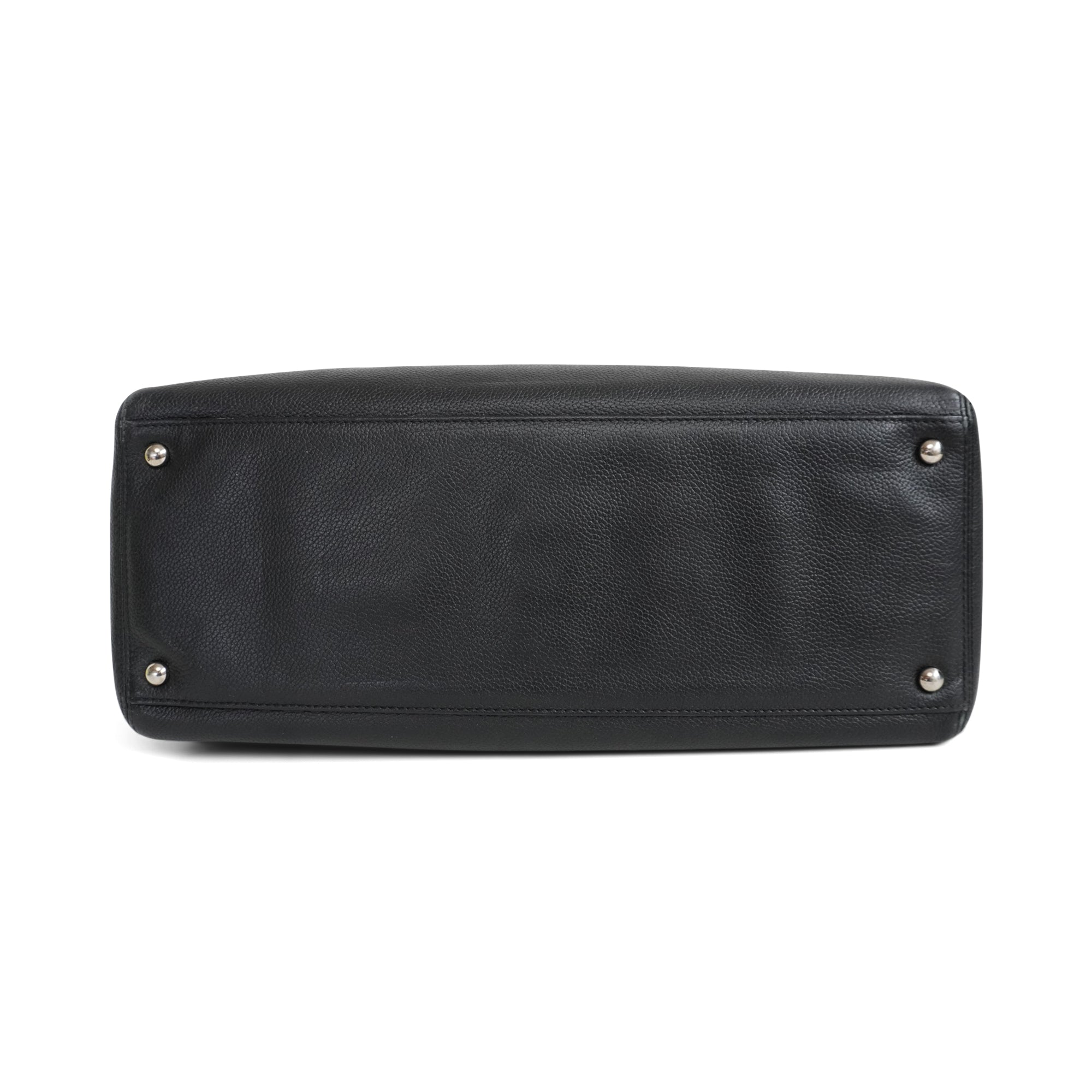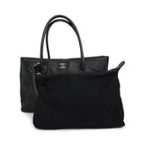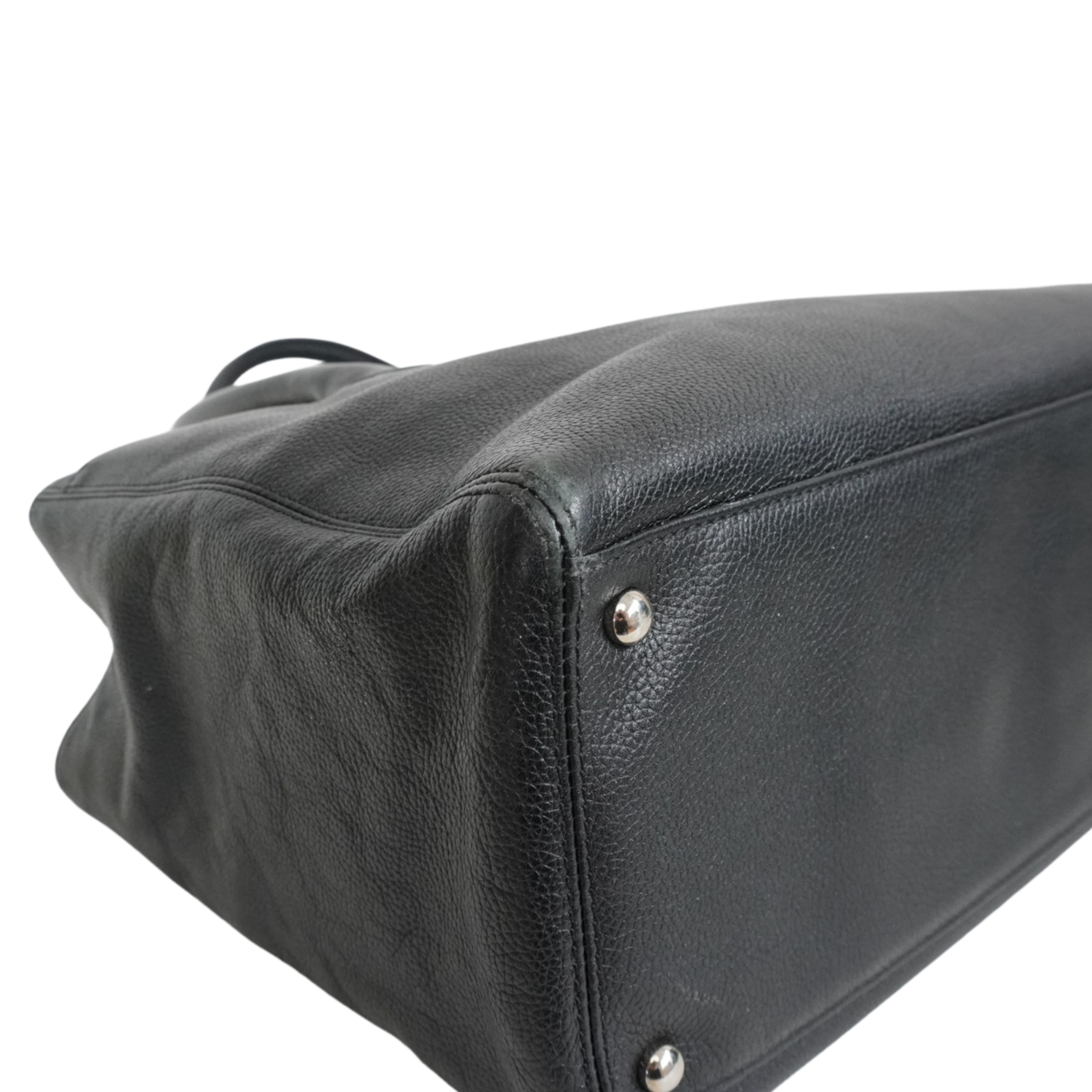 Chanel 'Executive' tote bag in black grained leather with silver hardware including a CC turnlock detail. Features a main grosgrain lined open pocket with removable zip pouch divider in the centre and two flat zip pockets on the sides. There are two exterior slip pockets, the front one can be closed with the CC turnlock.