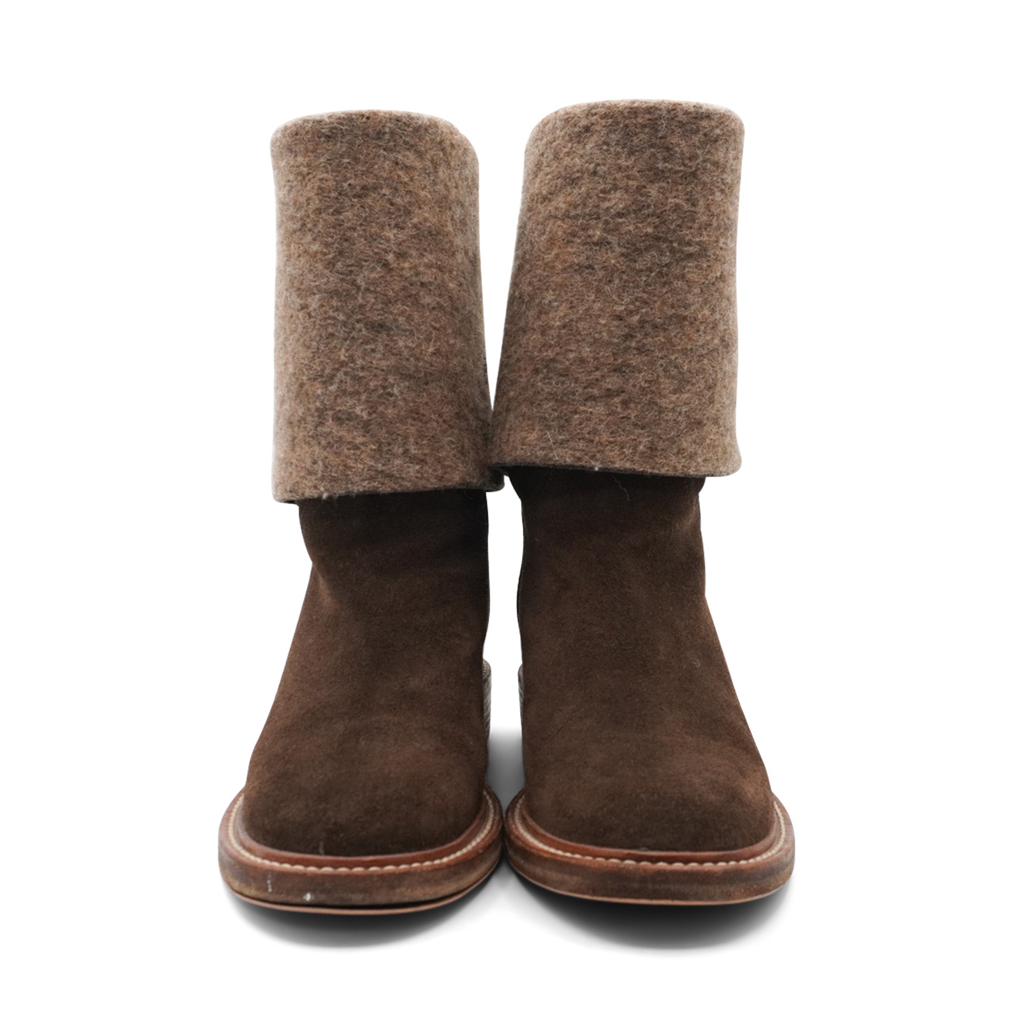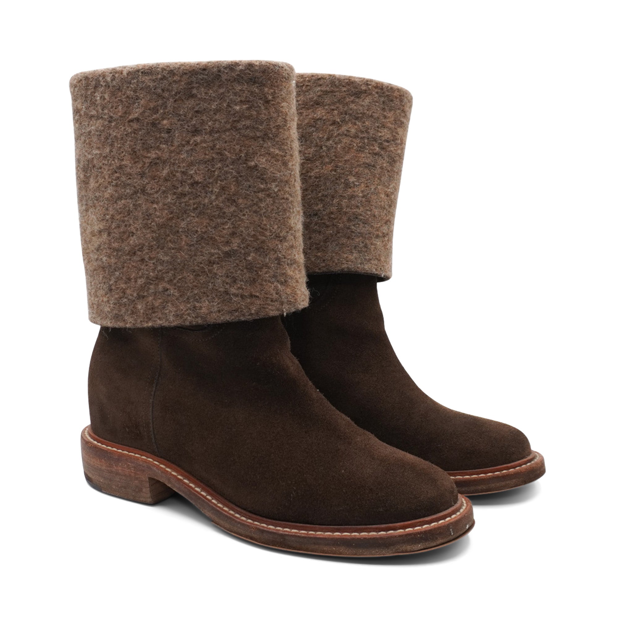 Chanel brown suede boots which are folded down to expose light brown wool lining with a brown 'CC' logo stitched on. Features a stacked wooden heel, and an almond toe. From 2014 collection.