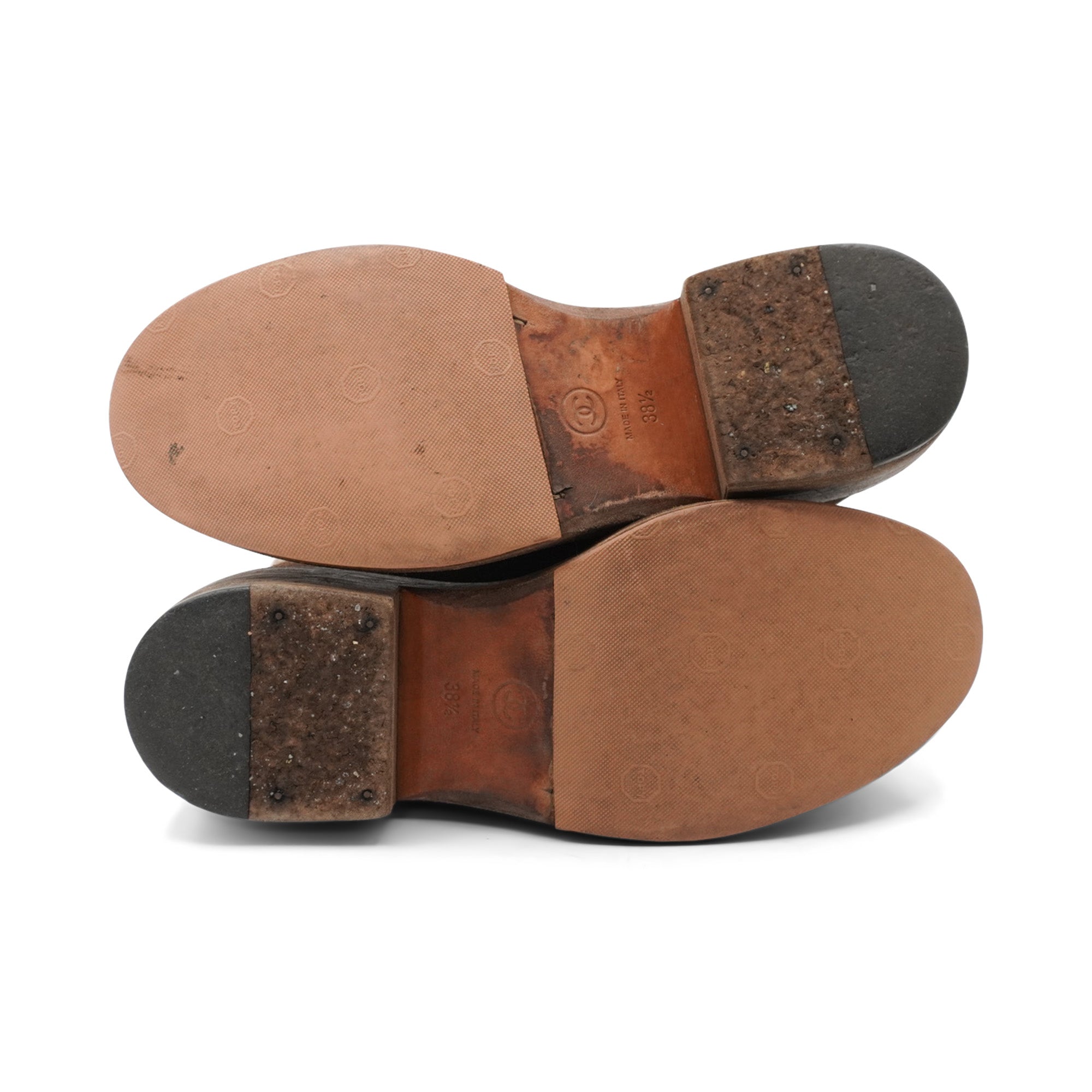 Great. Light wear on suede, staining and wear on back of stacked heel. Boots have been resoled.