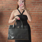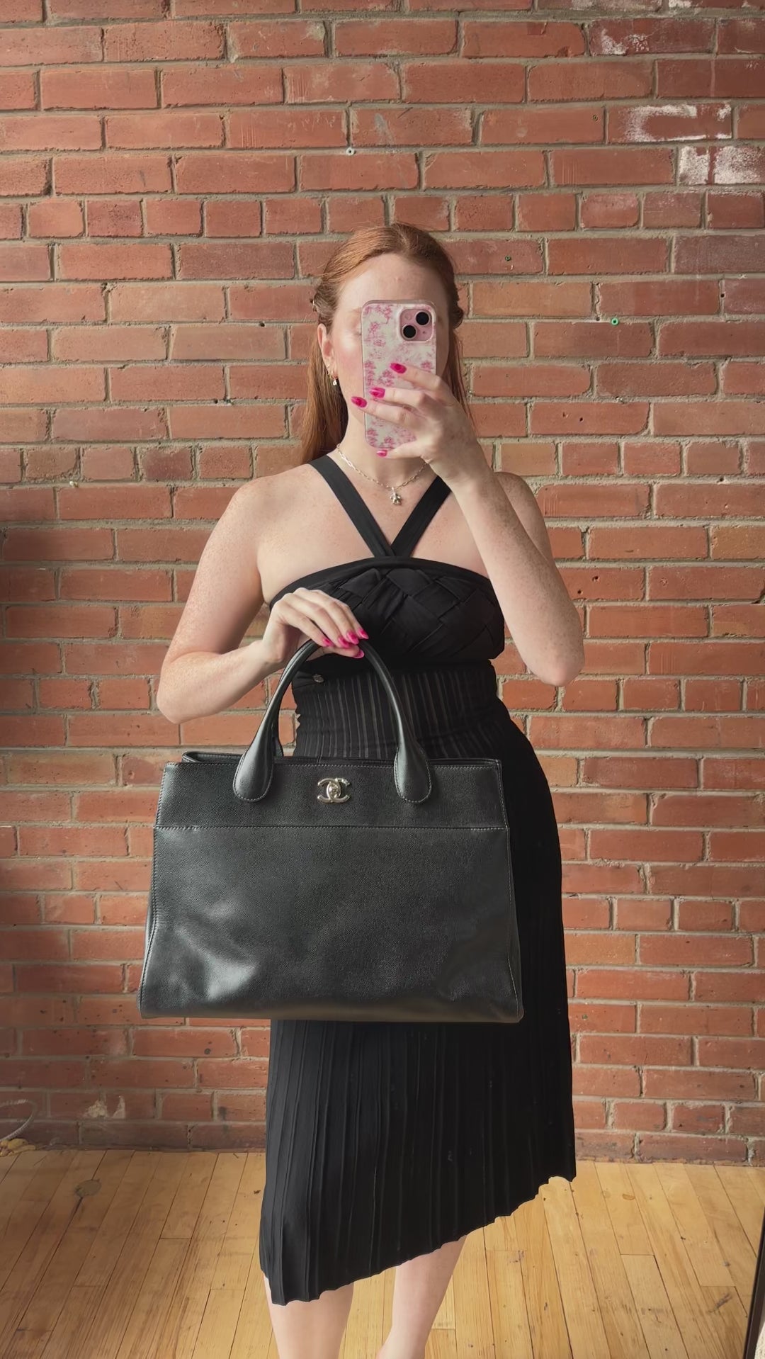 Chanel 'Neo Executive' tote bag in black caviar leather with grey contrast stitching and silver hardware. Features exterior slip pockets and a open pocket with 'CC' turnlock closure. The main pocket is lined with burgundy satin and features double slip and zip pockets as well a leather strap with lobster claw clasp. The gussets can be snapped shut or worn open.