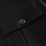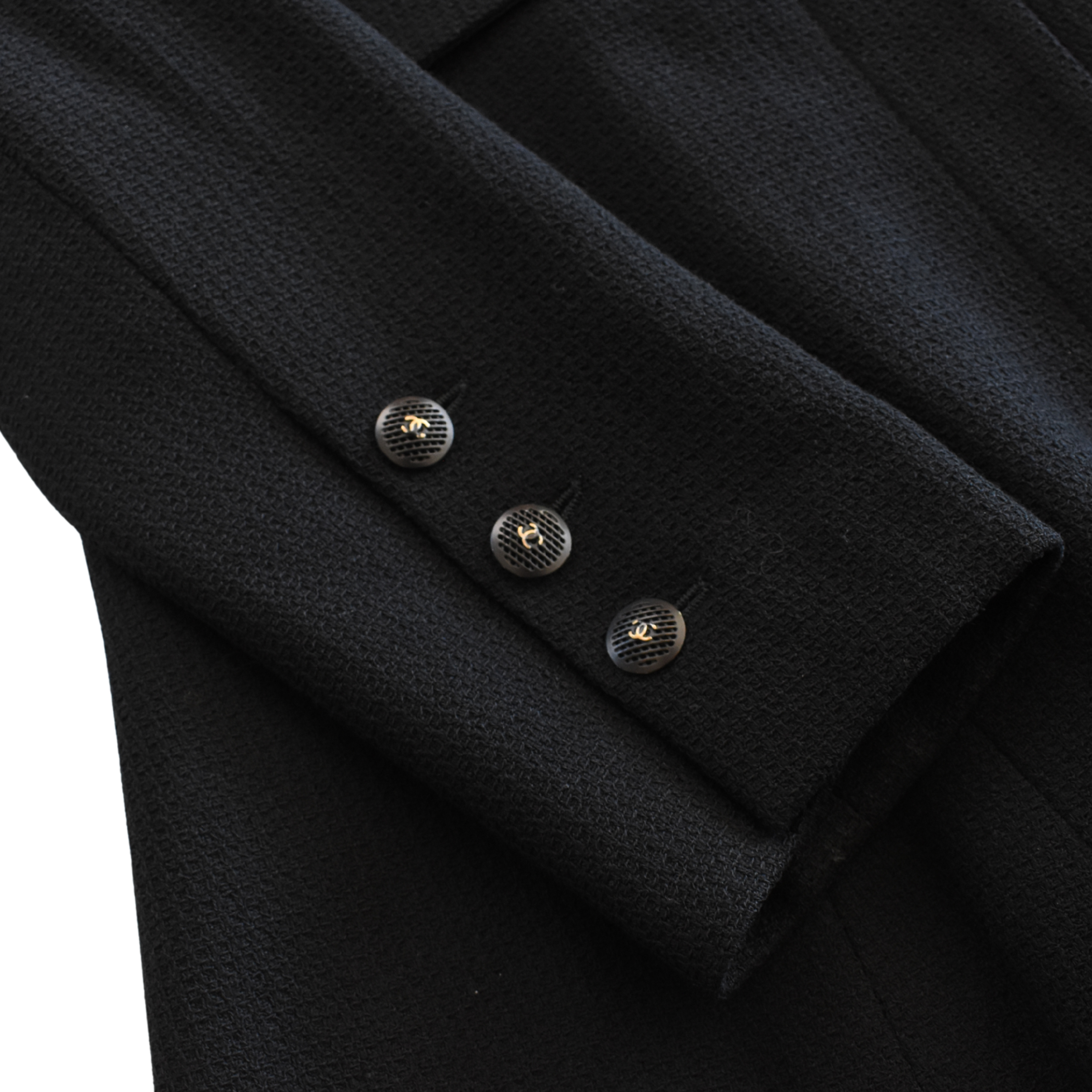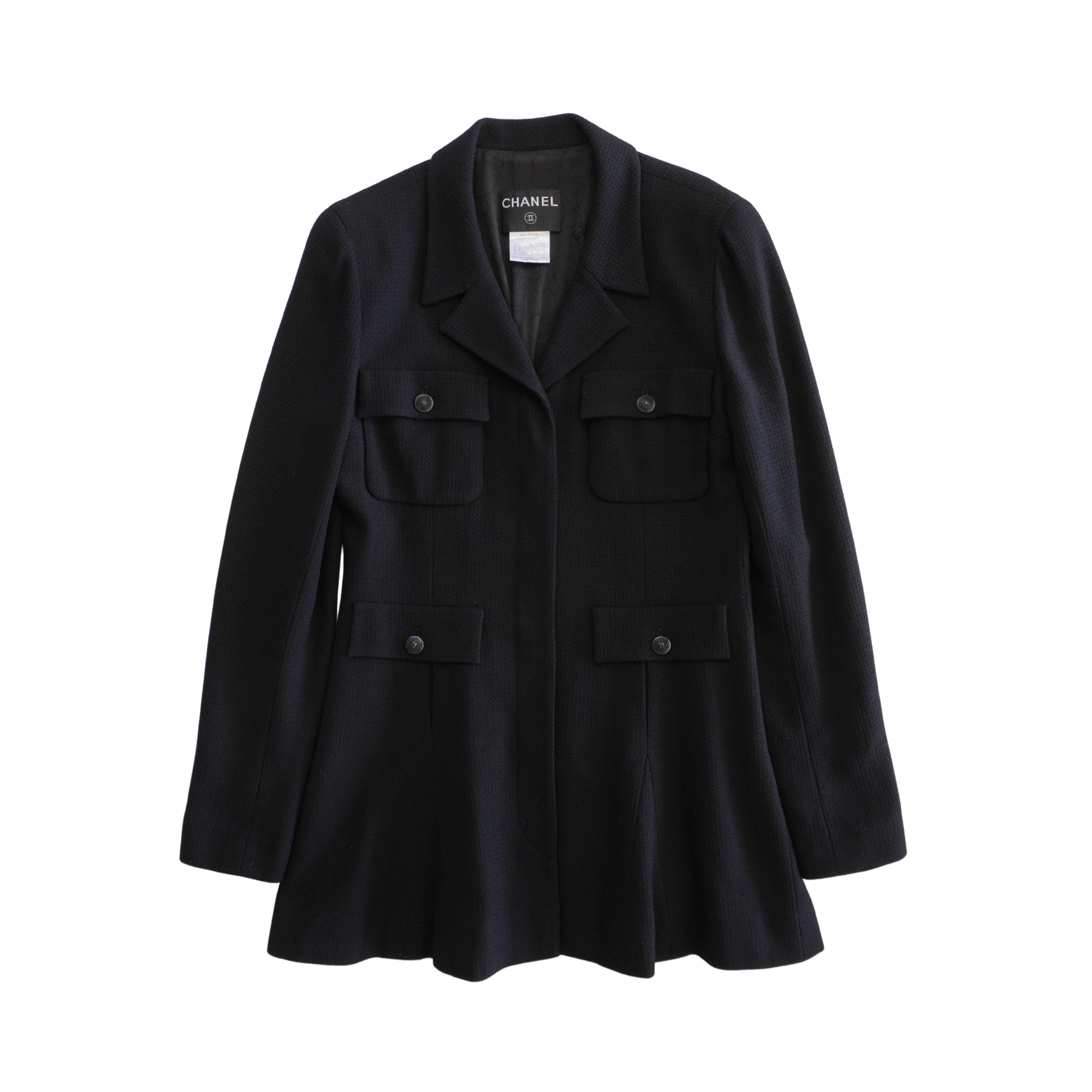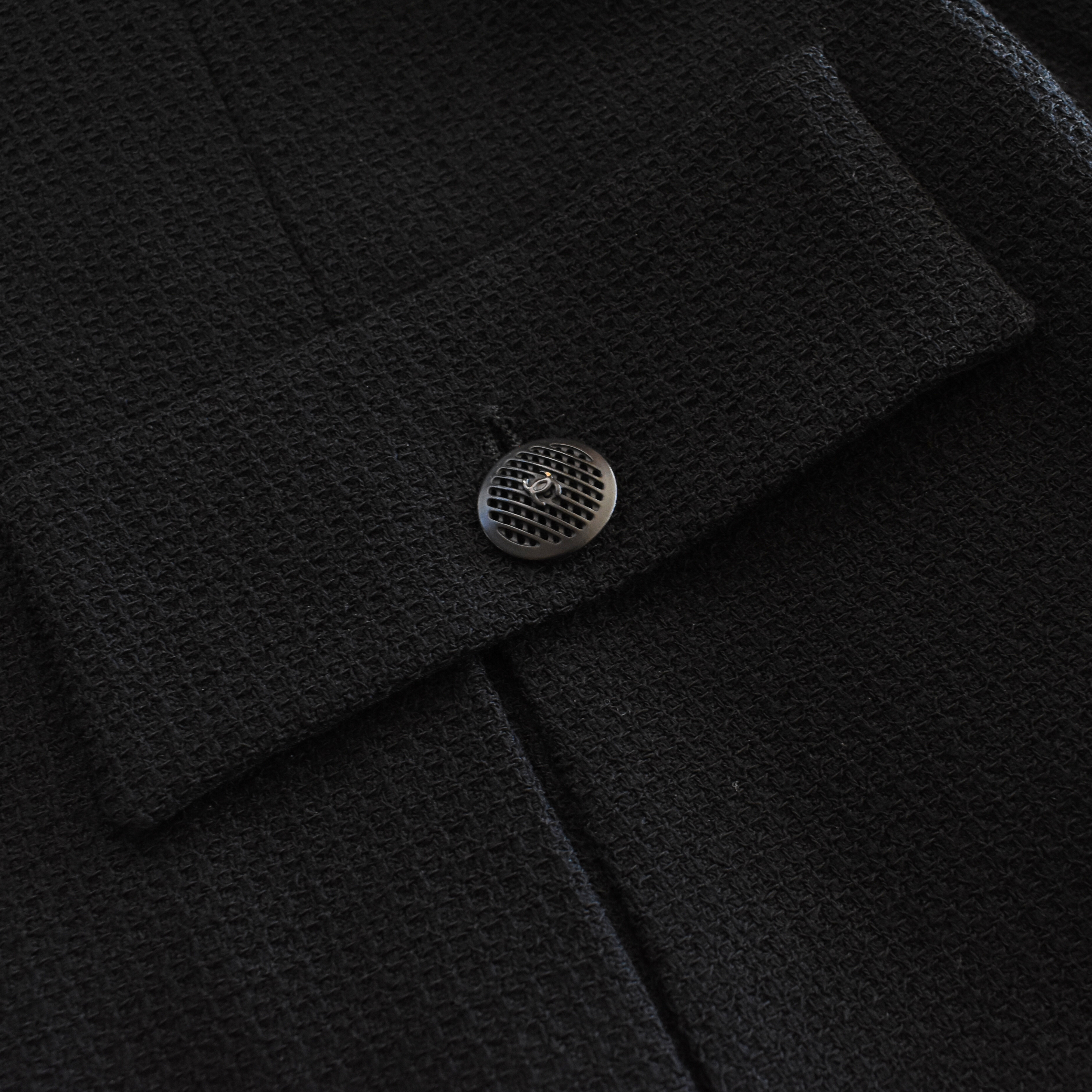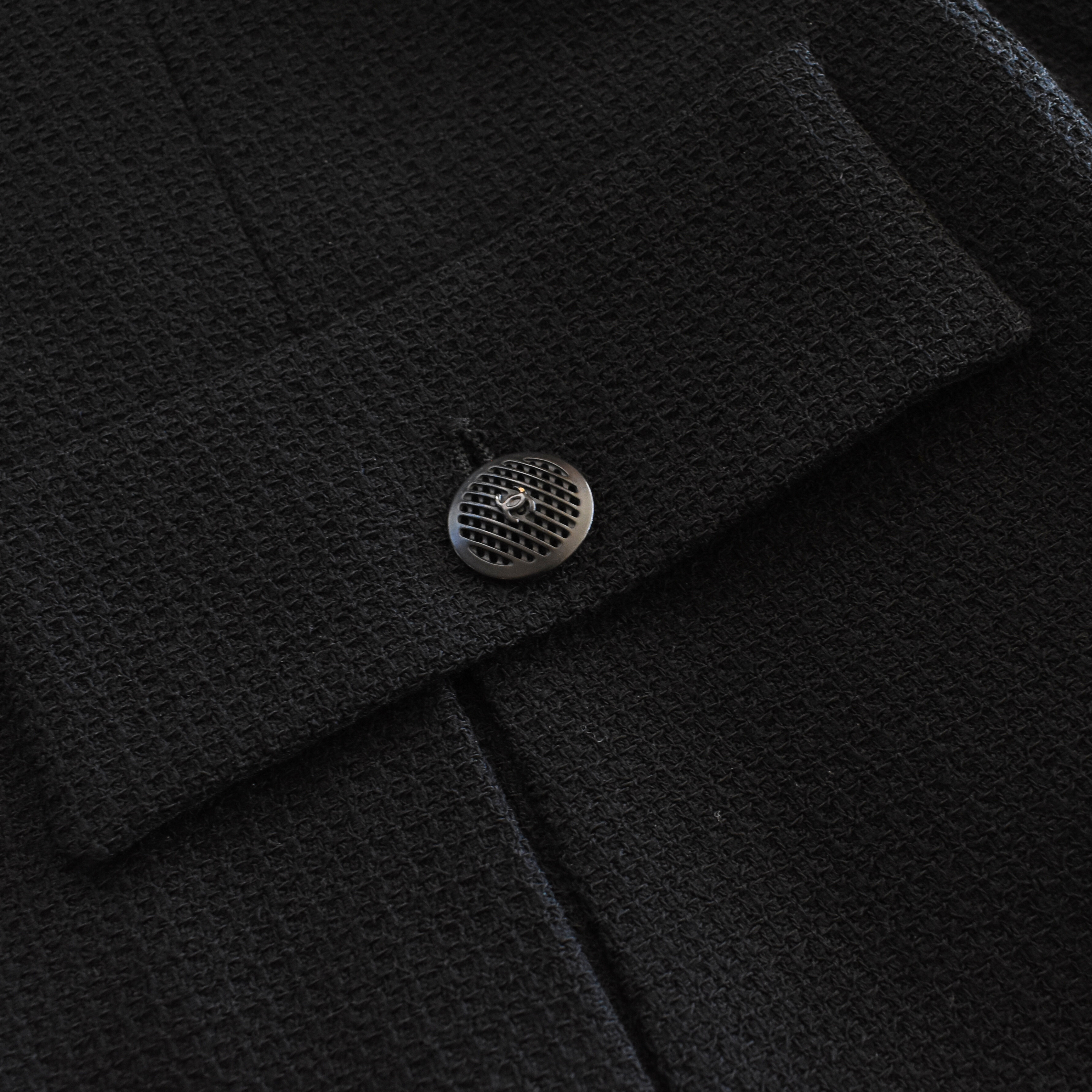Chanel blazer jacket in black tweed with a hidden front button closure, cargo pockets with black mesh button hardware, a notch lapel collar, and a slightly ruffled hem.