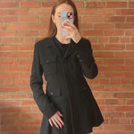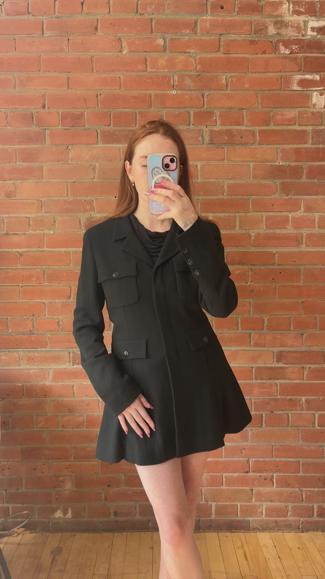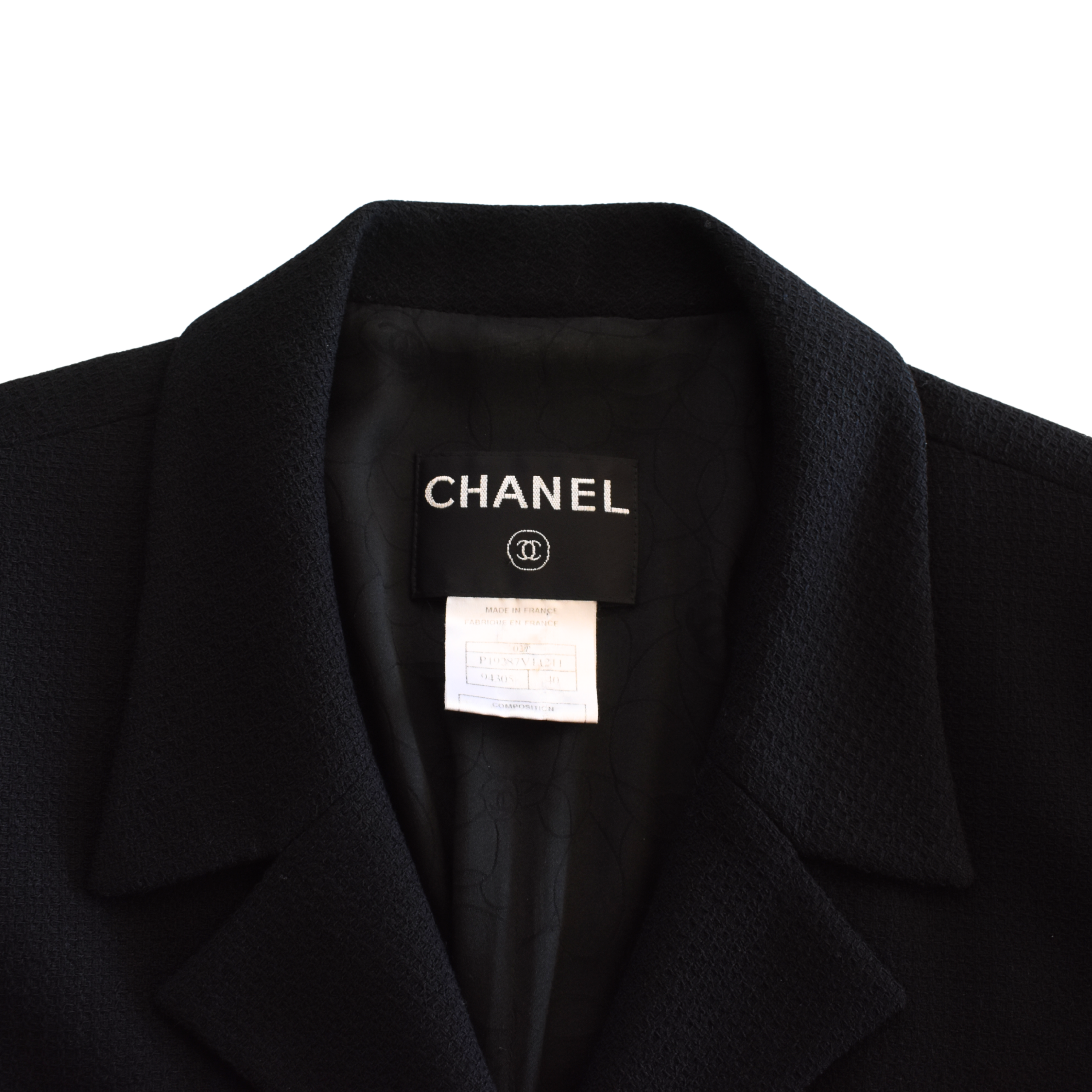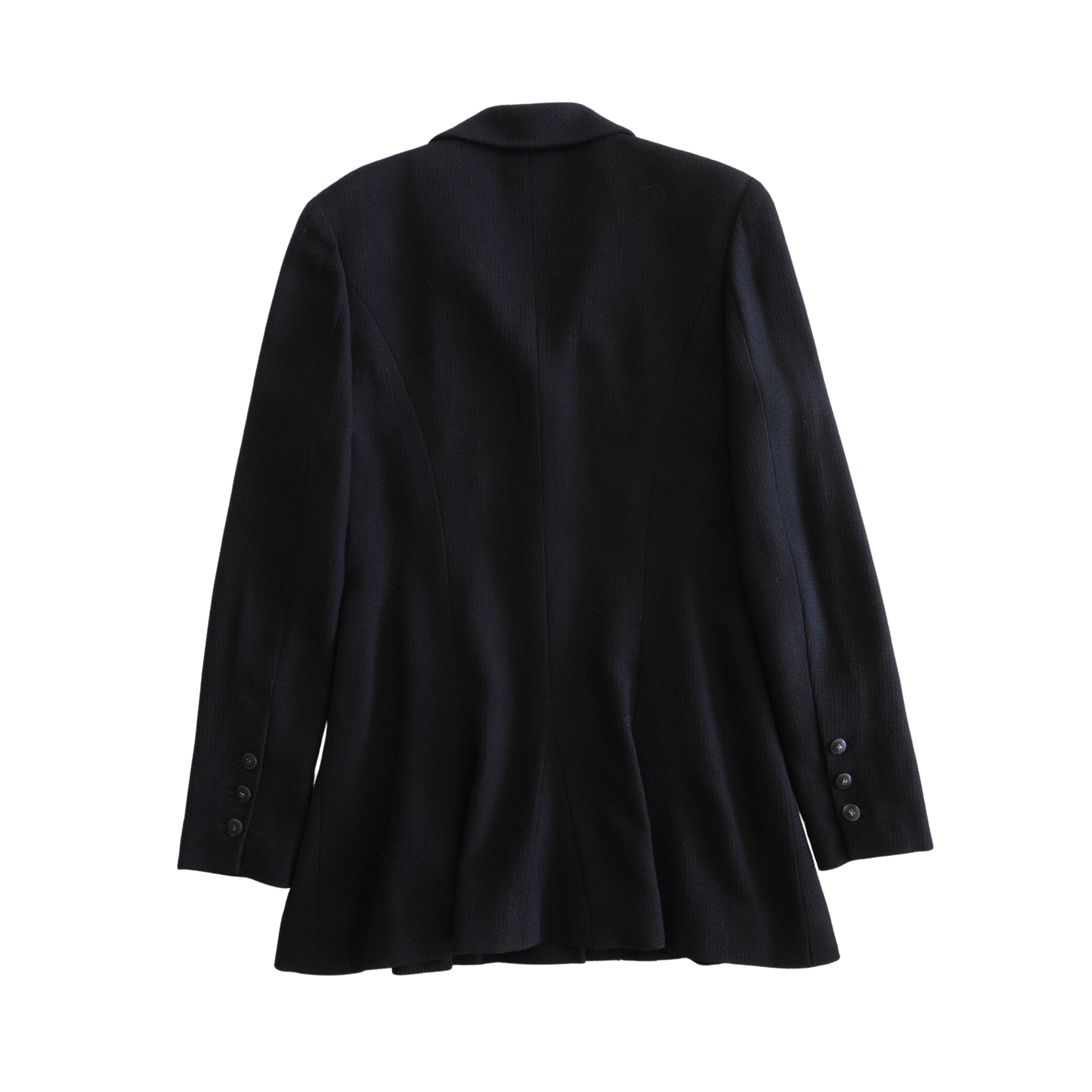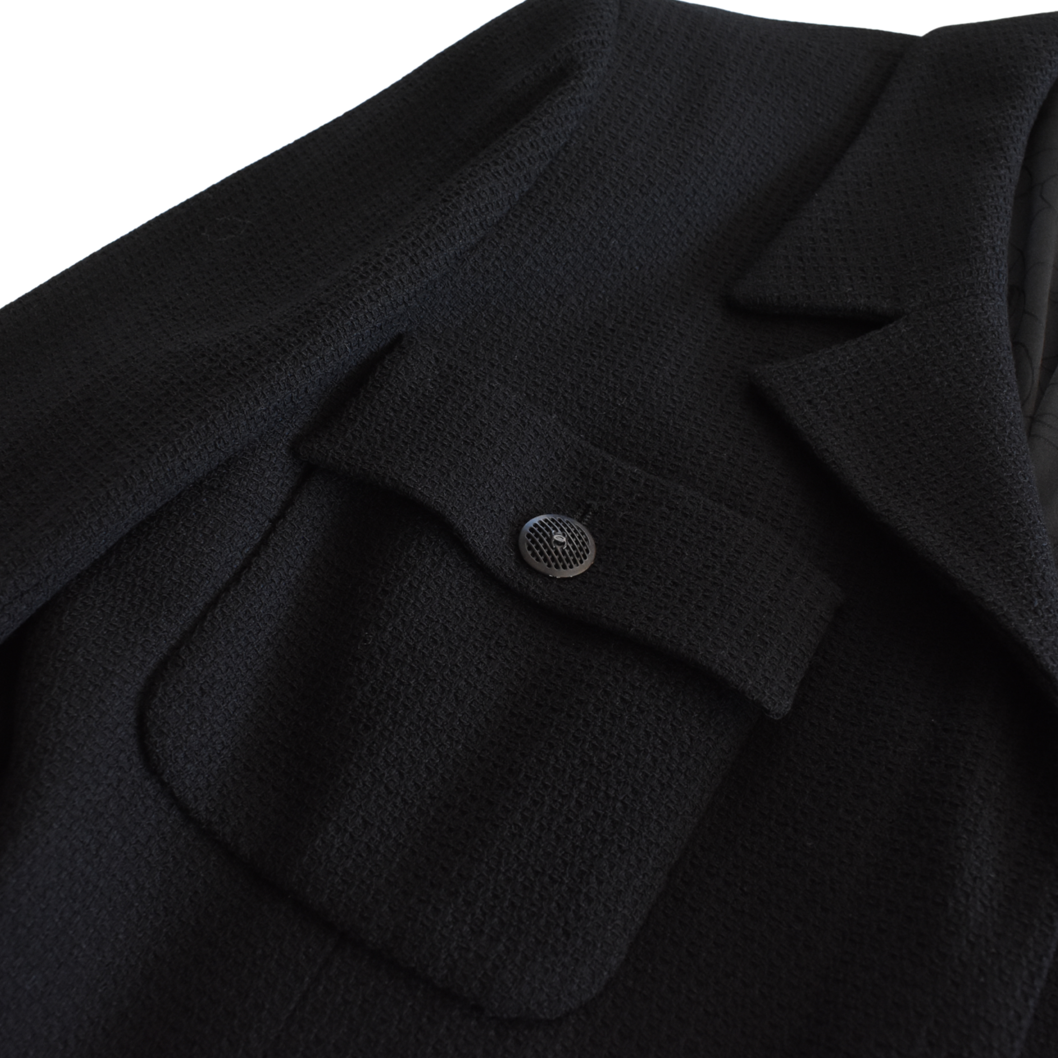 Chanel blazer jacket in black tweed with a hidden front button closure, cargo pockets with black mesh button hardware, a notch lapel collar, and a slightly ruffled hem.