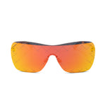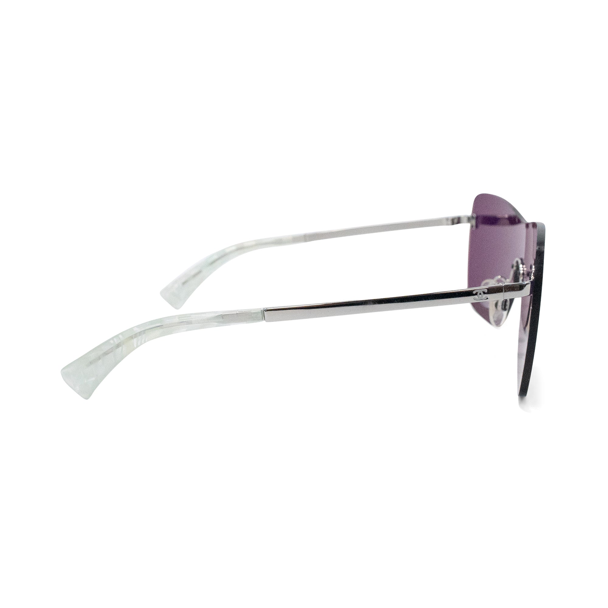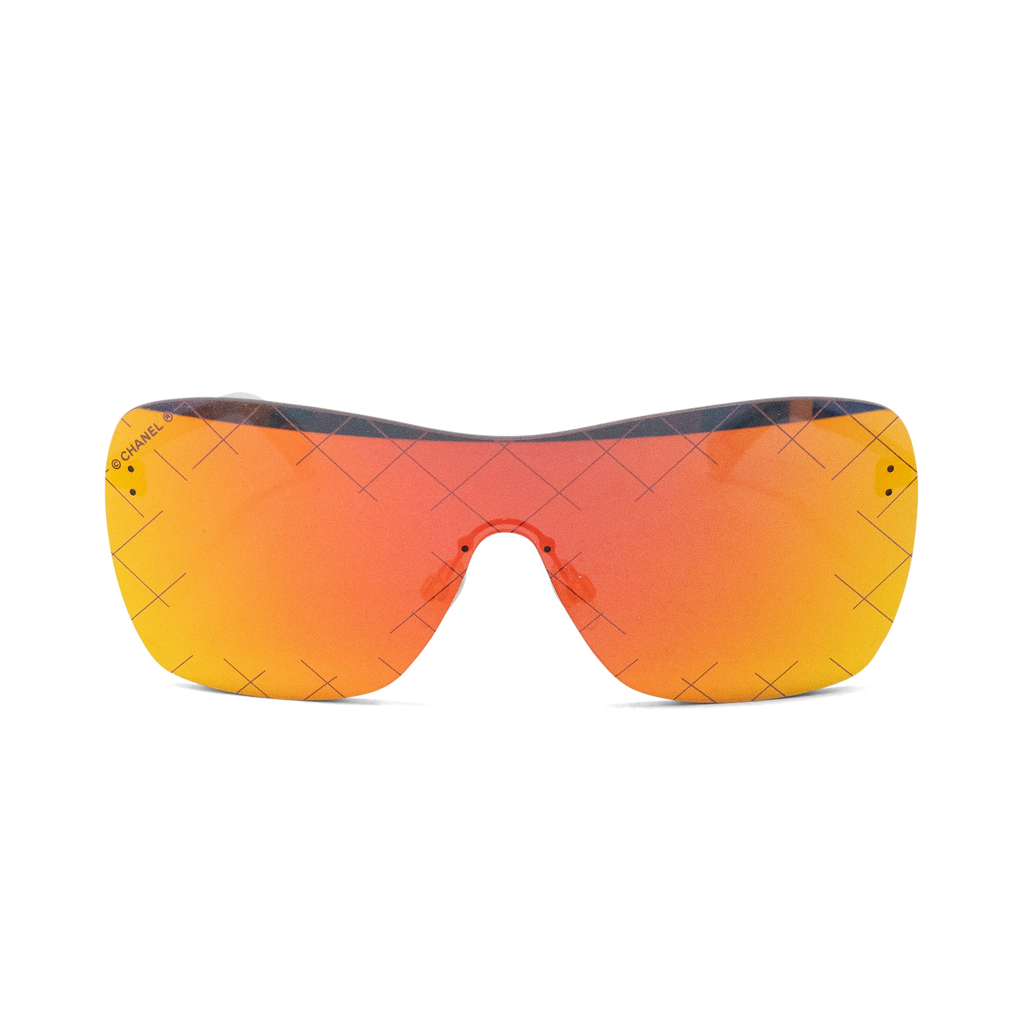 Chanel frameless shield style sunglasses in red-gold reflective colour way with cross hatching on the lens. Features skinny silver arms with small engraved 'CC' logo and clear tips, and a small logo in the corner of the lens. From Spring/Summer 2016 runway collection.